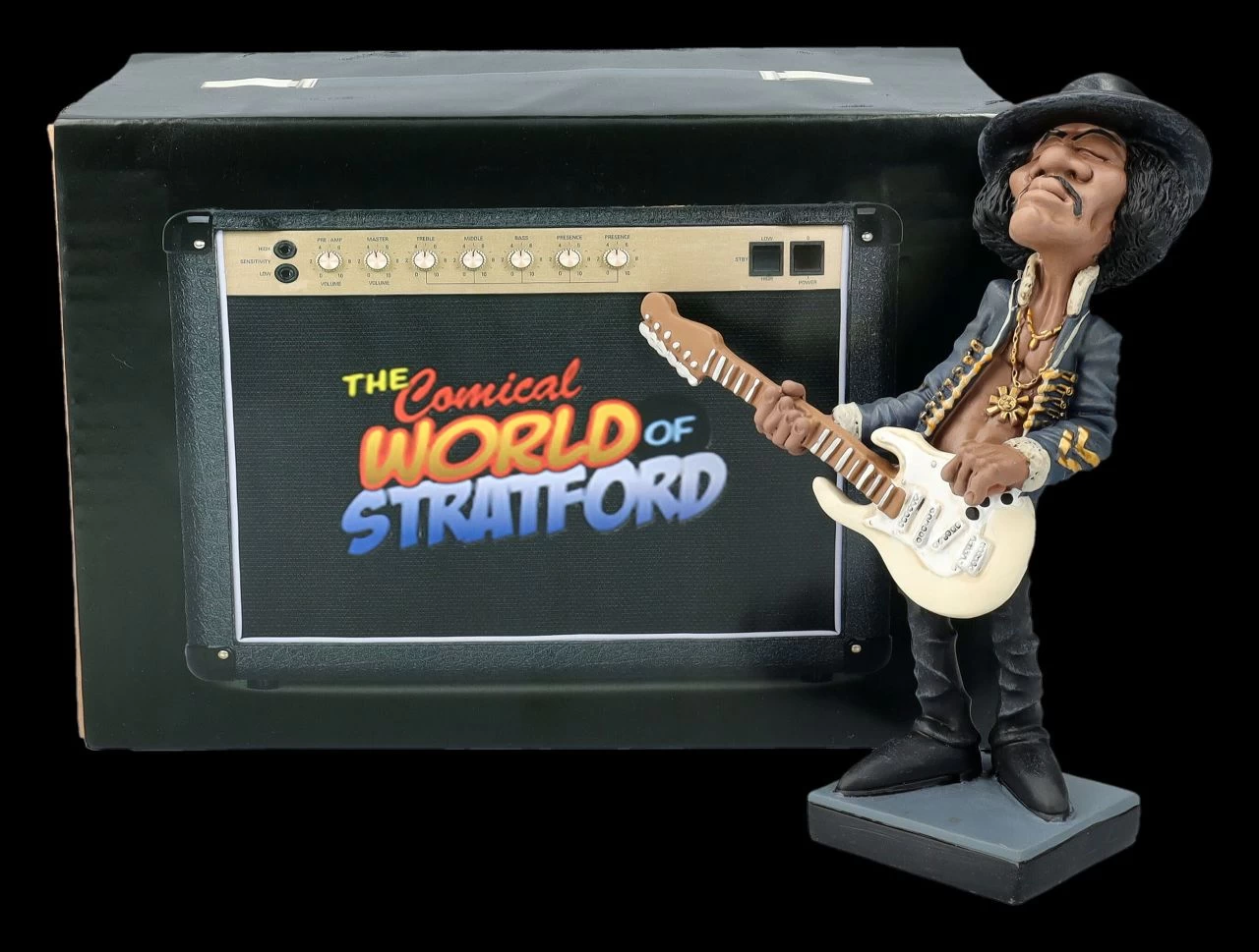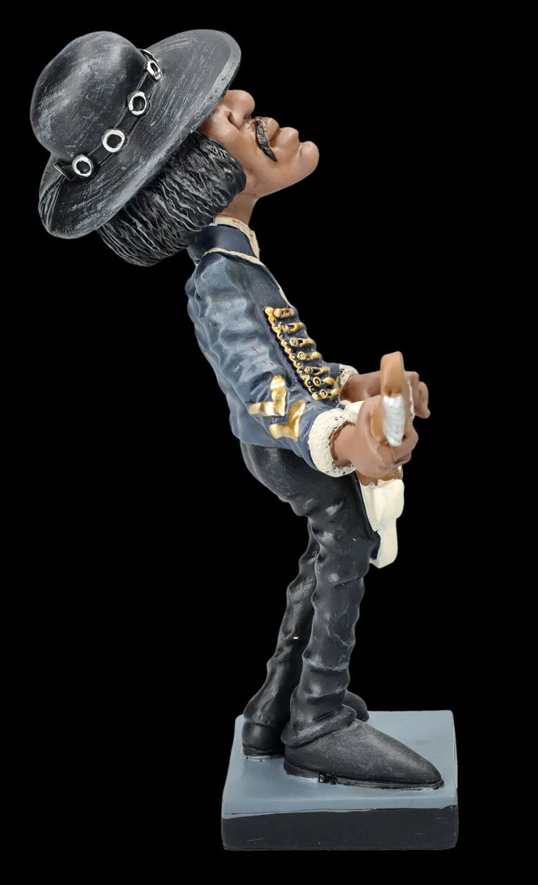 Woodstock ohne den Gitarrengott Jimi – unvorstellbar! Trotz seines kurzen Lebens ist er bis heute einer der einflußreichsten und bedeutendsten Gitarristen geblieben. Sein Sound ist unvergleichlich. Der Künstler Warren Stratford, der jeden mit seinen humorvollen Karikaturen begeistert, hat bei dieser Karikatur von Jimi sehr lustig den Charakter einfach fantastisch eingefangen. Jede Karikatur wird von Warren Stratford in aufwändiger Handarbeit persönlich entworfen und dann aus liebevoll handbemaltem Kunststein (Polyresin) hergestellt. Die 17 cm hohe, 12 cm breite und 9 cm tiefe Figur von Jimi aus der Funny Rockstar-Serie gehört einfach in jede Sammlung und ist daher für alle Musiker und Fans des Idols ein perfektes Geschenk. Auch zahlreiche weiteren Karikaturen der großen Stars aus allen möglichen Stilrichtungen, wie Pop + Rock, Grunge etc. etc., sind in unserem Shop zu finden.