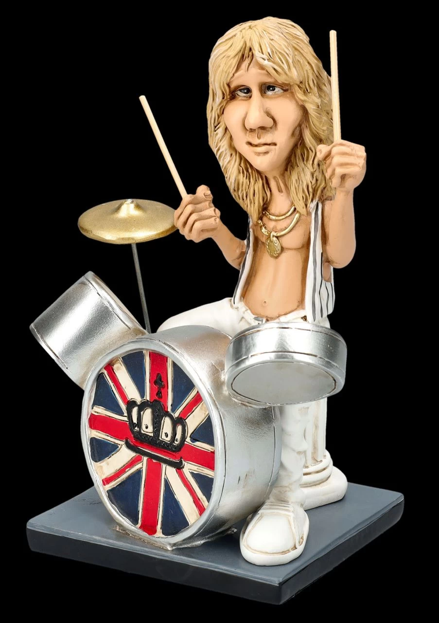 Roger am Schlagzeug mit der Krone – gemeinsam mit Freddie, John und Brian gehörte er zu den Königlichen Vier, die mit Preisen überhäuft wurden und immer wieder an der Spitze der Charts standen. Warren Stratford, der Künstler, der jeden mit seinen humorvollen Karikaturen begeistert, hat auch bei dieser Figur des Drummers und Sängers Roger, aus dessen Feder viele der berühmten Songs stammen, den Charakter perfekt eingefangen. Jede der witzigen Karikaturen wird von Warren Stratford persönlich entworfen und dann aus liebevoll handbemaltem Kunststein (Polyresin) hergestellt. Die 19,5 cm hohe, 13 cm breite und 8 cm tiefe Figur aus der Funny Rockstar-Serie gehört – am besten gemeinsam mit Freddie, John und Brian – einfach in jede Sammlung und ist daher für jeden Fan ein perfektes Geschenk. Auch zahlreiche weiteren Karikaturen der großen Stars aus allen möglichen Stilrichtungen der Pop- und Rock-Kultur sind in unserem Shop zu finden.