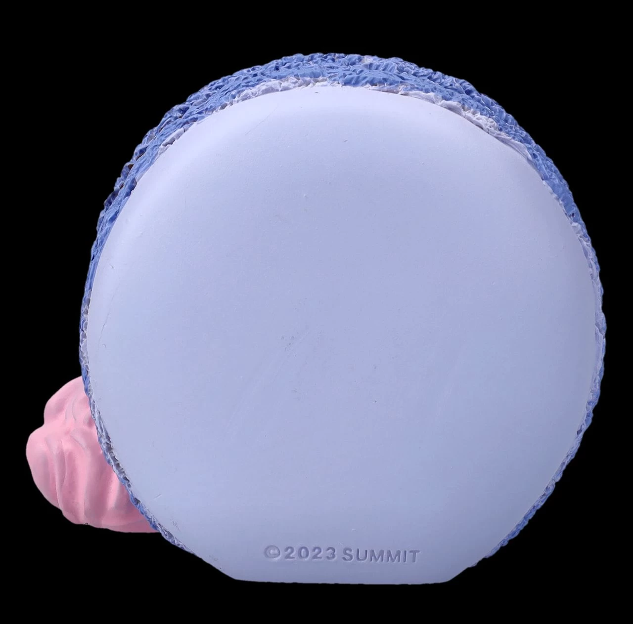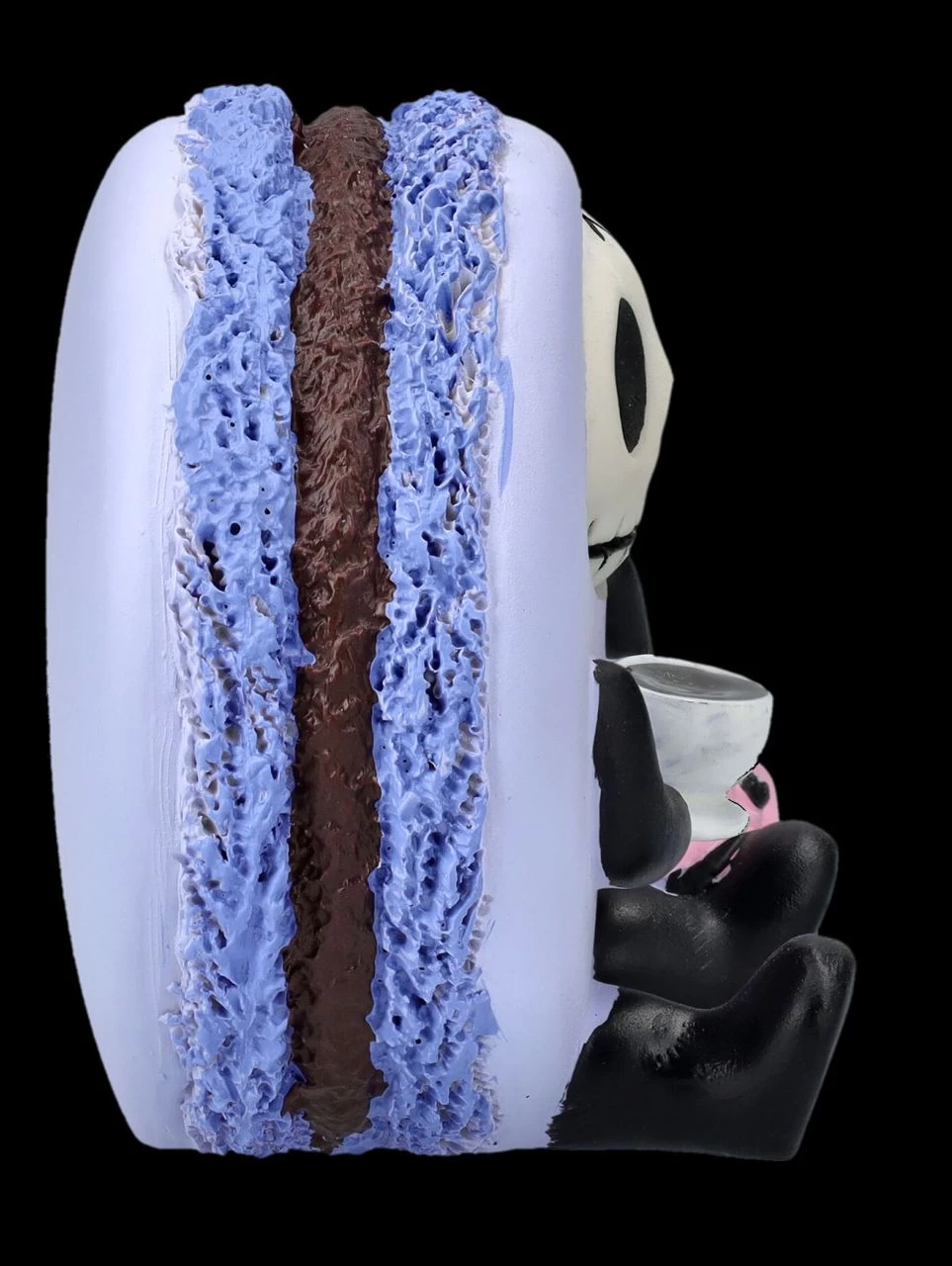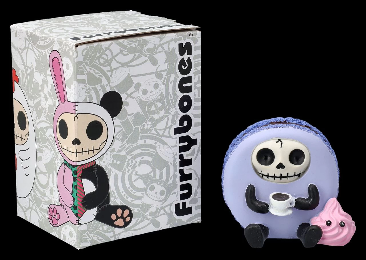 In diese Süßigkeit sollte man lieber nicht beißen. Beim genauen Hinsehen kann man in dem leckeren blauen Macaron ein niedliches Furrybones Skelettchen entdecken. Ronny, der frech grinsende kleine Kerl, hat sich perfekt als Macaron getarnt und scheint jetzt nur noch darauf zu warten, dass man in ihn beißt und dass er dann zurück beißen kann…. Auf dem Tisch bei der Halloween- oder Gothic-Party wird Ronny garantiert zum Mittelpunkt. Aber natürlich bleibt er auch das ganze Jahr über gerne in der Küche stehen. Macaron Ronny, das kultige Furrybones Skelettchen, ist aus liebevoll handbemaltem Kunststein (Polyresin). Es ist 6,5 cm hoch, 7 cm breit und 4,5 cm tief und als original Furrybones Figur nicht nur für Gothics eine geniale Deko. Der frech grinsende kleine Furrybones Ronny ist ein Super-Geschenk für Sammler und alle, die von den niedlichen Furrybones begeistert sind. Daher kommt es gleich in einem Geschenkkarton. Weitere schaurig-witzige Freunde von Ronny findet ihr übrigens.in unserem Shop.