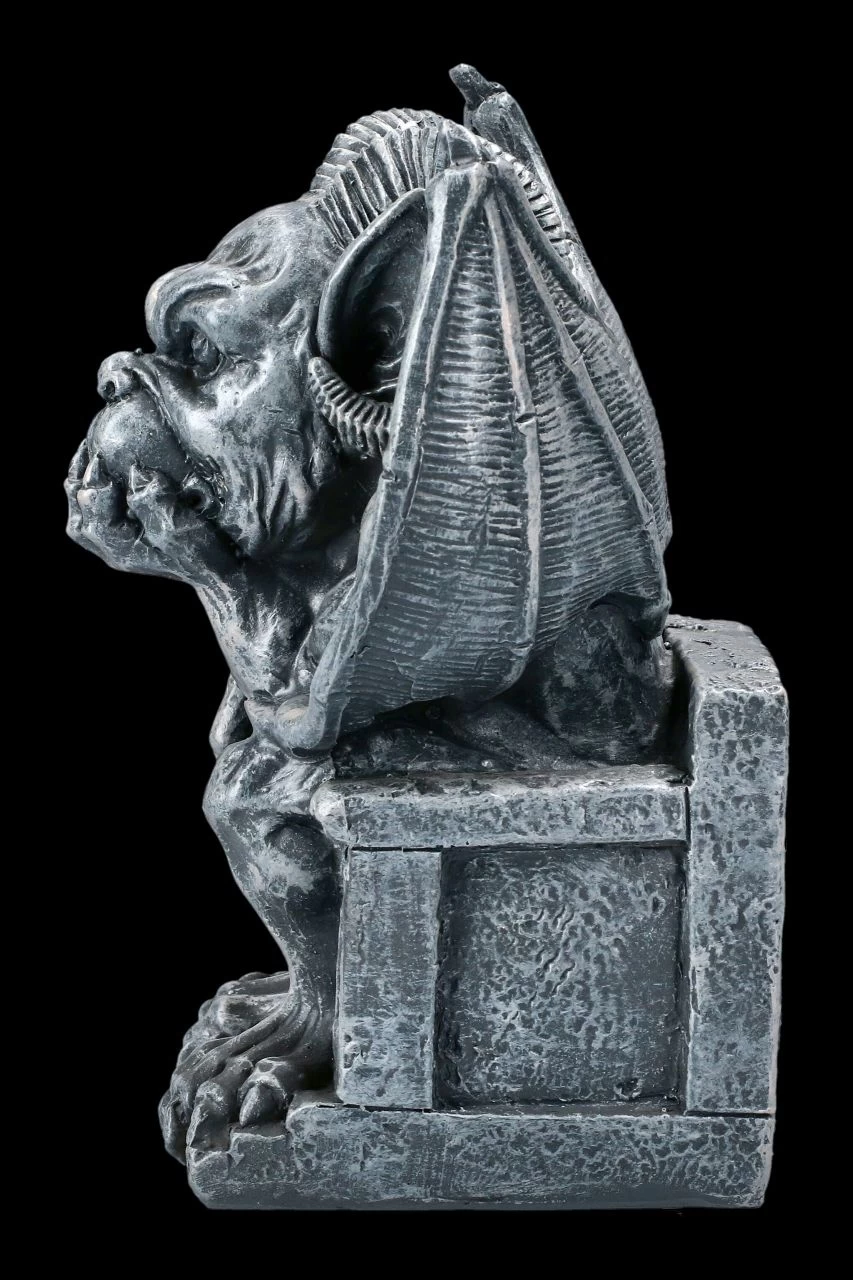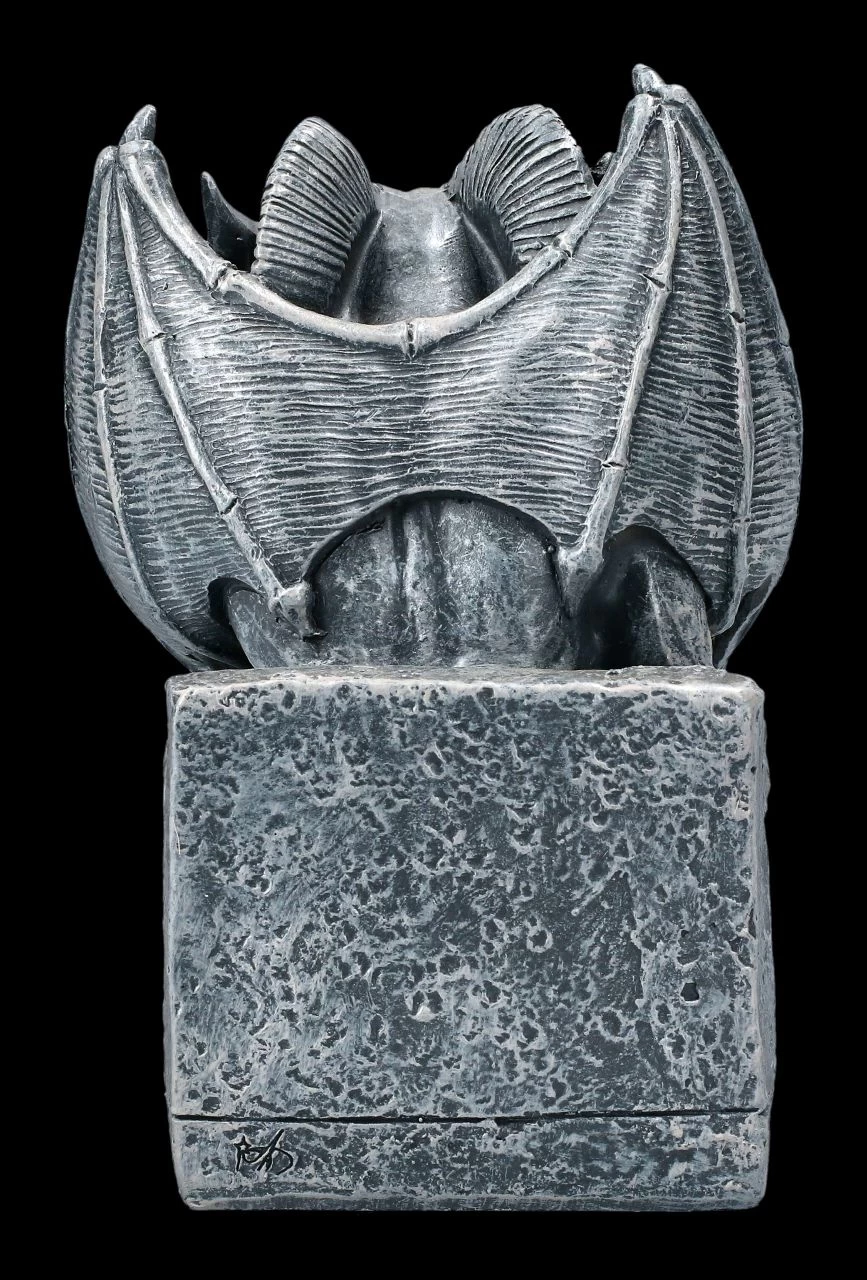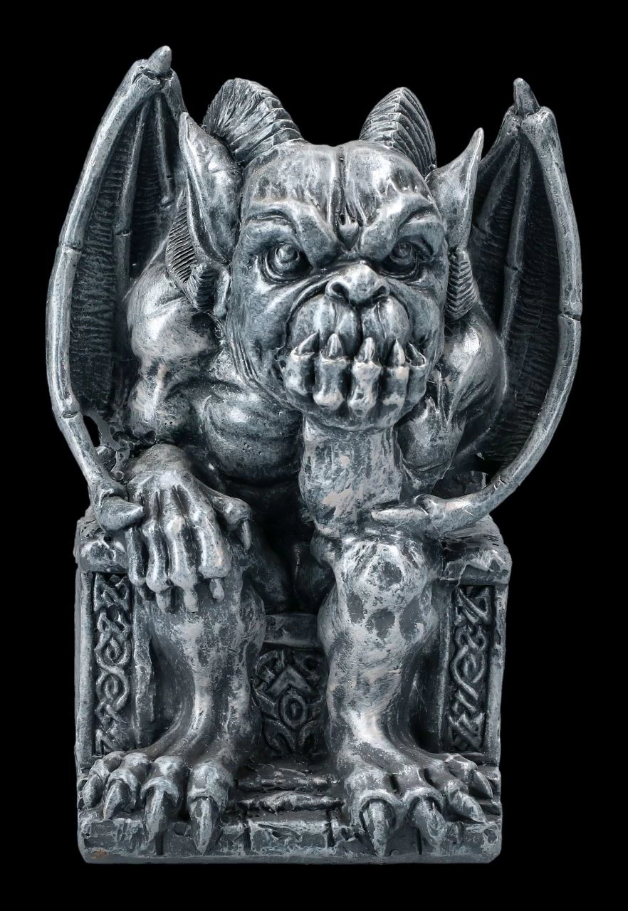 In der Denkerpose ist der kleine Herrscher auf dem Thron tagsüber zu Stein erstarrt, doch wenn der Gargoyle Nachts erwacht, wird er Sie von seinem Platz in Ihrer Wohnung aus vor allen bösen Mächten schützen. Die kleine Gargoyle Figurine ist sehr detailreich aus handbemaltem Kunststein (Polyresin) gefertigt. Sie ist 13,5 cm hoch, 9 cm breit und 7 cm tief. Geben Sie dem kleinen Herrscher auf dem Thron einen schönen Platz, damit auch Sie sich an ihm erfreuen und damit Sie sich geschützt fühlen können. Der kleine Gargoyle ist aber auch ein aufmerksames Geschenk für besondere Freunde.