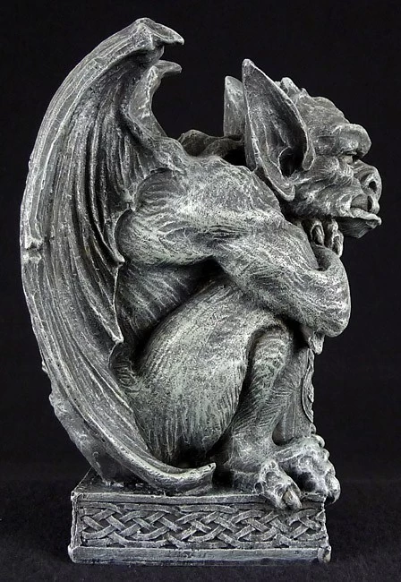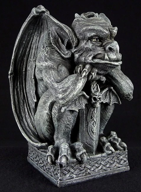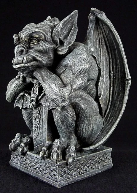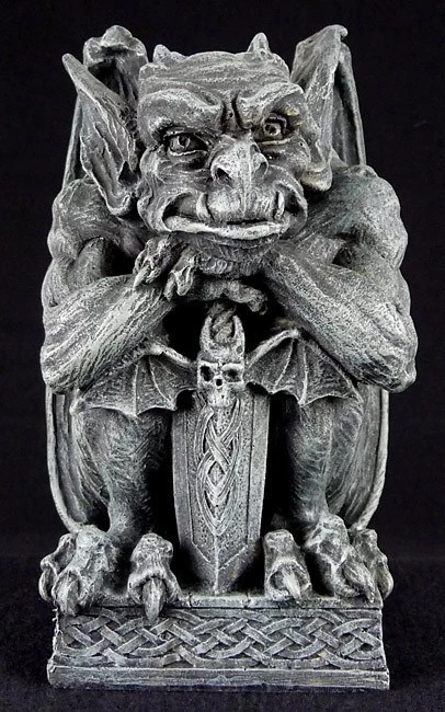 Der Gargoyle stützt sich zufrieden auf sein Schwert. Er hat in der Nacht erfolgreich Dämonen gejagt und kann jetzt in Ruhe am Tag versteinert auf die Nacht warten.