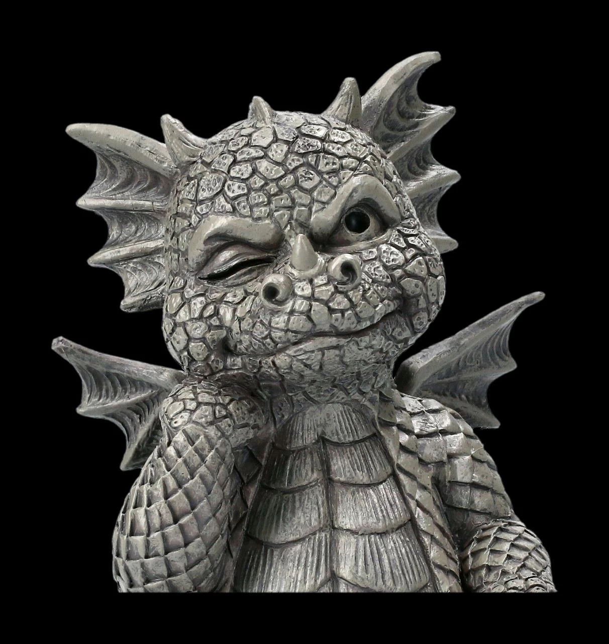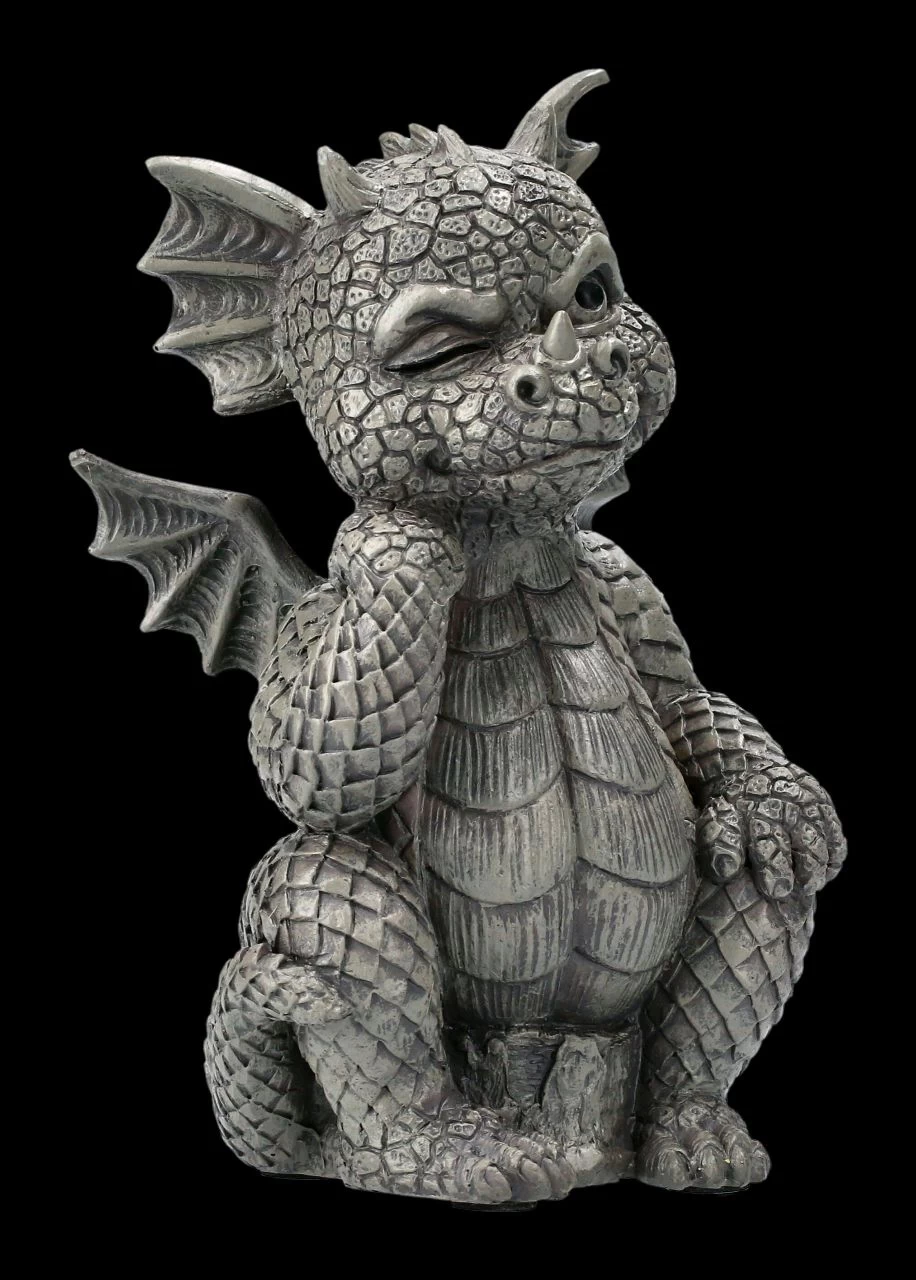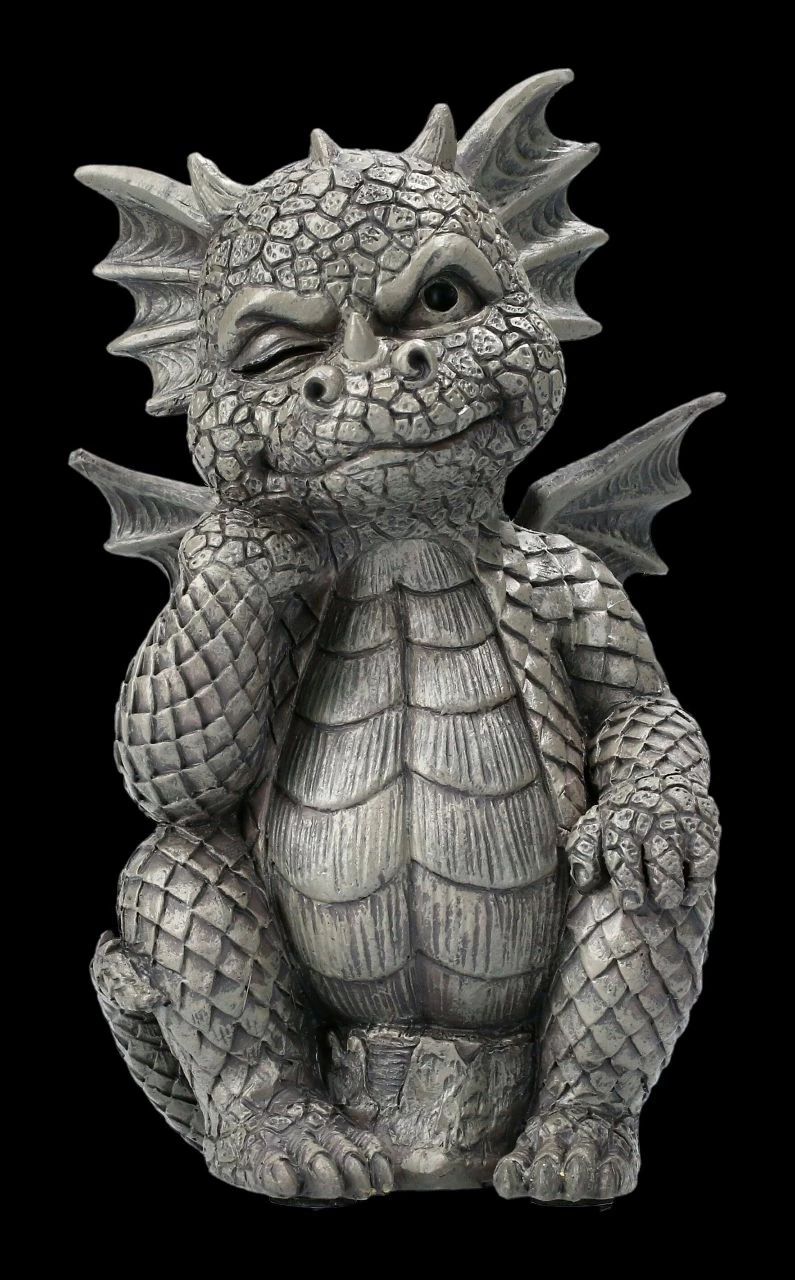 Ganz so ernst scheinen die Gedanken des lustigen kleinen Drachens wohl nicht zu sein. Zumindest lässt sein blinzelndes Auge und das verschmitzte Lächeln das vermuten. Der lustige Drache in der Denker-Pose ist detailreich aus Kunststein (Polyresin) gefertigt und handbemalt. Mit seiner Höhe von 13 cm, der Breite von 8 cm und der Tiefe von 6 cm wird der kleine Drache sogar im Blumenkasten sofort alle Blicke auf sich ziehen. Für alle Drachen- und Gartenfreunde ist der kleine Drache sicher ein lustiges Geschenk.