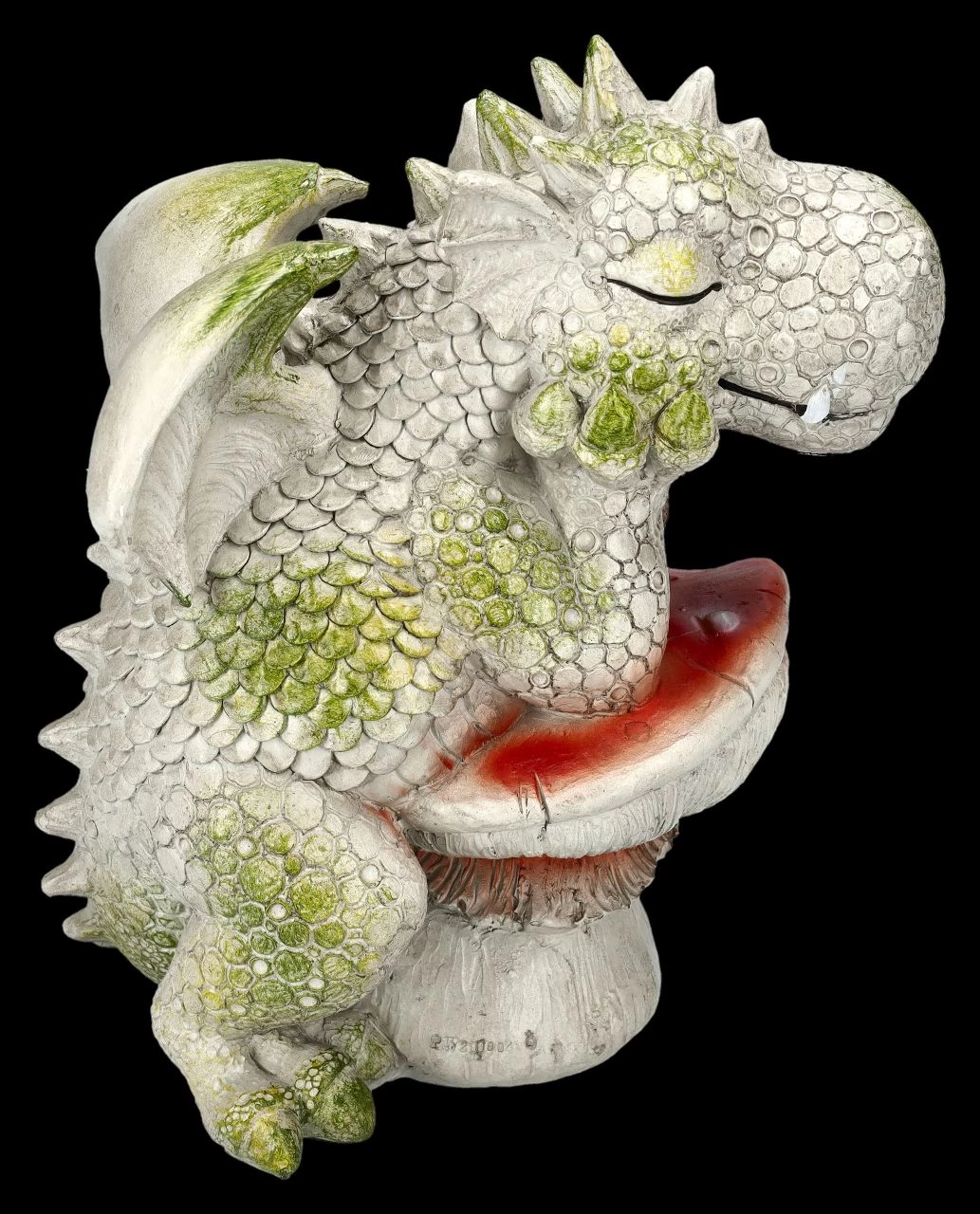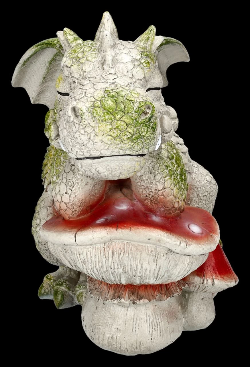 Auch Gartenarbeit soll man philosophisch angehen, denn wer zuerst nachdenkt, hat danach weniger Arbeit. Der witzige, 24 cm hohe, 19 cm breite und 15 cm tiefe Drache aus der Serie Magical Garden lehnt sich in Gedanken versunken auf einen roten Fliegenpilz. Schon erstaunlich, dass der das aushält… Ob im Garten, auf dem Balkon oder der Terrasse, der liebevoll aus handbemaltem Kunststein (Polyresin) gefertigte Denker wird sicher jeden zum Lachen bringen. Die Drachen-Figur ist ein perfektes Geschenk für lustige Gärtner.