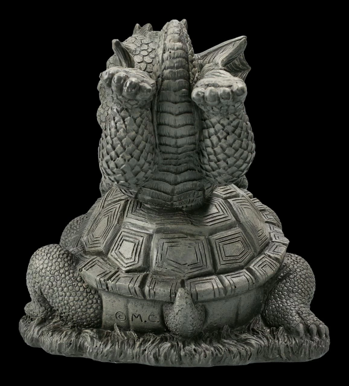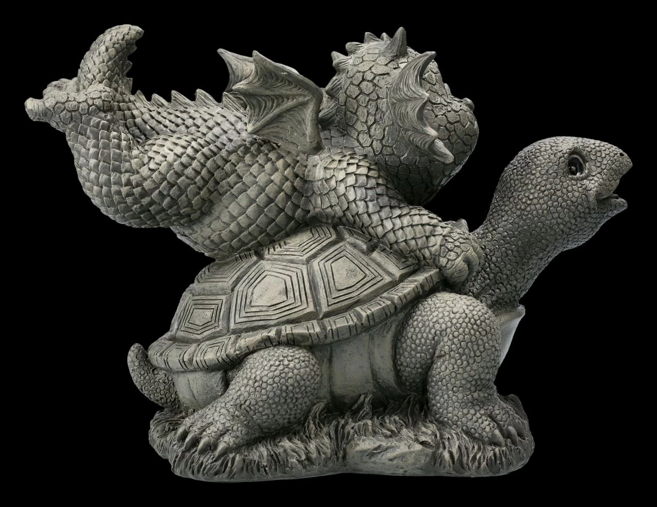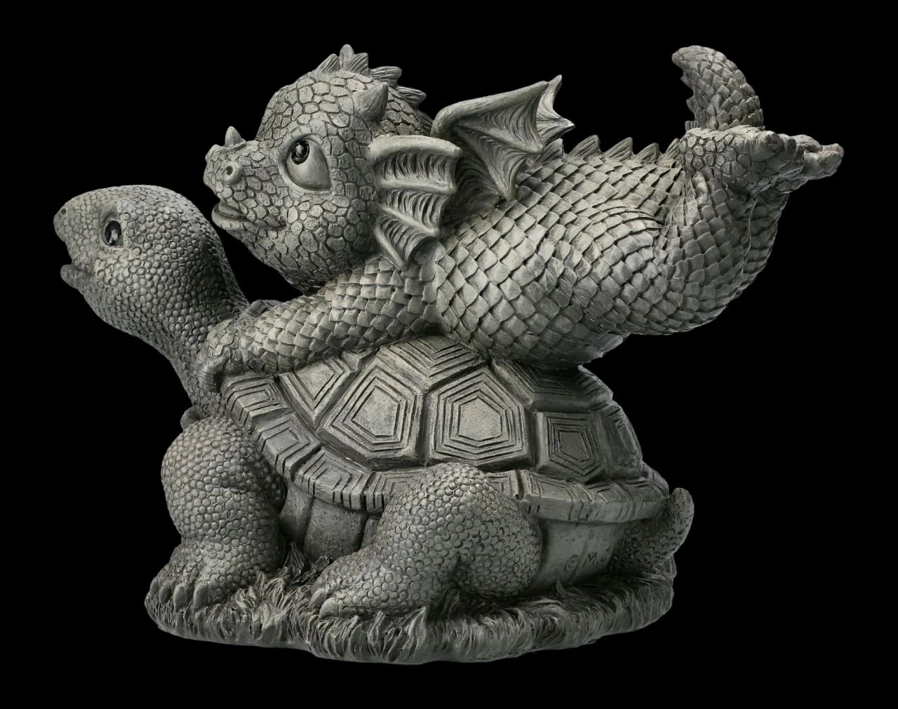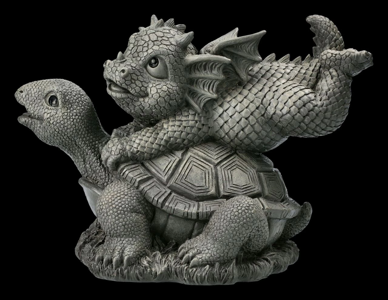 Da scheinen zwei so richtig Spaß zu haben, wenn die Schildkröte so richtig losgaloppiert. Gerade noch kann sich der kleine Drache festhalten, es macht ihm aber sichtbar viel Spaß. Der Drache auf der Schildkröte ist liebevoll aus Kunststein (Polyresin) gefertigt und handbemalt. Mit einer Höhe von 19 cm, der Breite von 17 cm und der Tiefe von 28 cm zieht er sicher alle Blicke auf sich und ist auch ein tolles Geschenk für liebe Gartenfreunde.