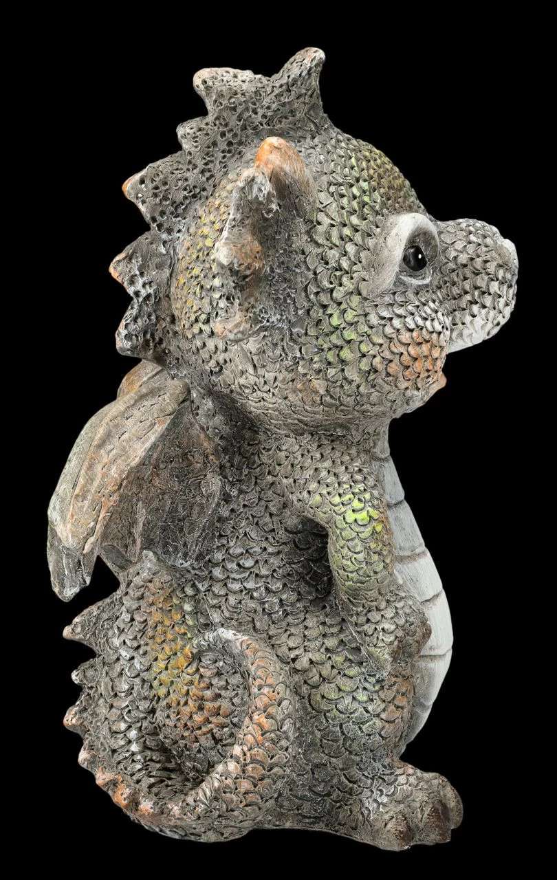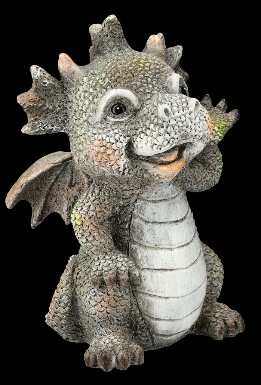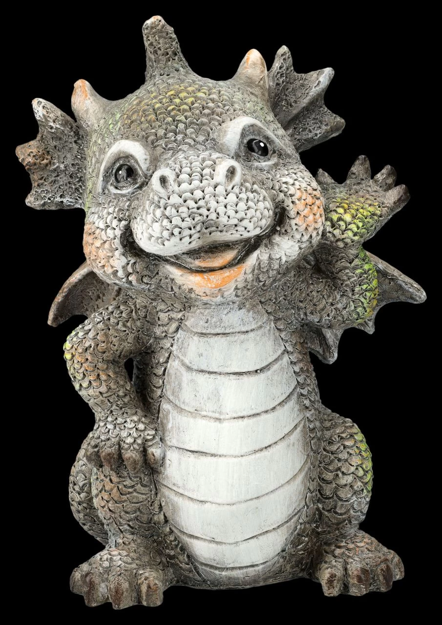 So wird man doch gerne begrüßt! Jeder diesen winkenden Drachen entdeckt, fühlt sich sicherlich auch gleich versucht zurück zu winken. Die lustige Gartenfigur aus liebevoll handbemaltem Kunststein (Polyresin) ist 26 cm hoch, 17,5 cm breit und 15 cm tief. Am besten stellt man den putzigen winkenden Drachen in einem geschützten Bereich beim Eingang auf, so kann er alle Besucher fröhlich empfangen. Die niedliche Drachen-Figur ist zwar wetterbeständig, aber nicht frostsicher und daher empfiehlt der Hersteller, den kleinen Drachen im Winter frostsicher unterzubringen.