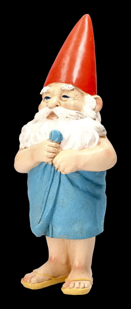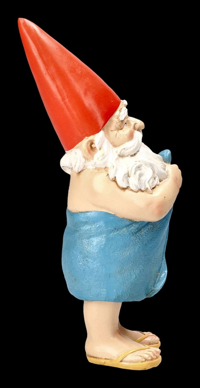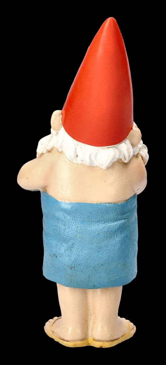 Verflixt noch mal, wer klopft gerade dann, während ich mein jährliches Bad nehme? Da schafft es der Gartenzwerg gerade noch so, sich in sein blaues Badetuch zu hüllen. Der witzige Gartenzwerg mit der Höhe von 22 cm, der Breite von 9 cm und der Tiefe von 11 cm aus bunt handbemaltem Kunststein (Polyresin) ist eine lustige Deko zwischen Ihren Pflanzen, aber auch ein originelles Geschenk und Mitbringsel.