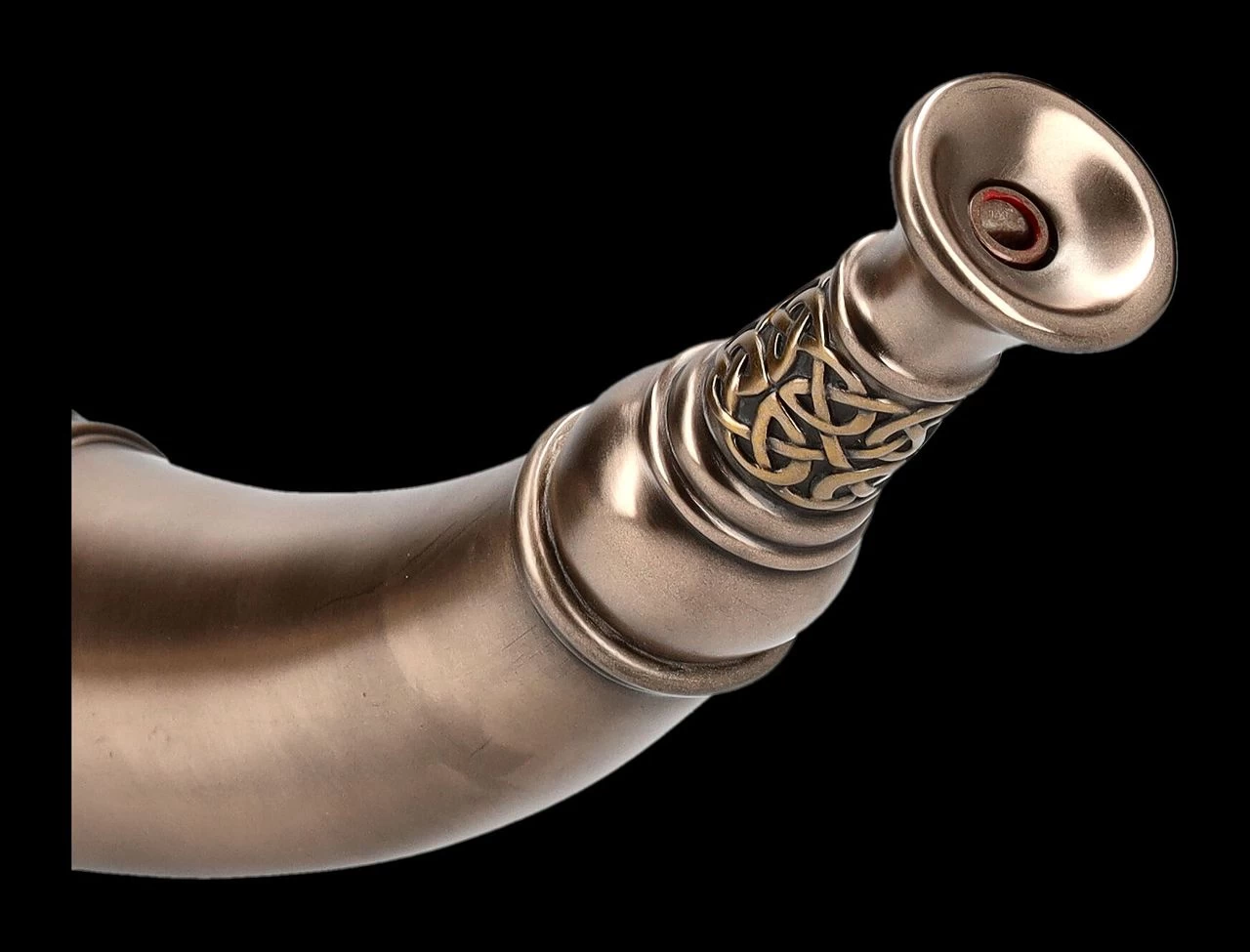 Auch in der Nibelungengeschichte spielt das kostbar gestaltete Signalhorn eine Rolle, da es neben dem Schwert Balmung zum legendären Nibelungenschatz gehörte, der nach dem Kampf mit dem Drachen in den Besitz von Siegfried gelangte. Siegfried wurde als Neugeborener im Wald ausgesetzt, da König Sigmund seine Frau zu Unrecht der Untreue verdächtigte. Er wurde vom Schmied Mimir gefunden, der den Knaben aufzog. Doch Siegfried wurde so stark, dass sich Mimir vor ihm fürchtete und ihn in den Wald schickte, in dem der böse Drache Fafnir hauste. Siegfried besiegte den Drachen und badete in seinem Blut, wodurch er – bis auf eine kleine Stelle auf seiner Schulter, auf das ein Blatt gefallen war – unverwundbar wurde. Auf dem 22 cm hohen, 48 cm breiten und 13 cm tiefen Signalhorn wird im keltischen Stil Siegfrieds Kampf gegen den Drachen dargestellt. Das aufwändig bronzierte und zurückhaltend colorierte Signalhorn aus Kunststein (Polyresin) stammt aus der Studio Collection von Veronese. Es ist voll funktionsfähig und kann wunderbar an dem Wikinger Wandhaken mit dem keltischen Drachen aufgehängt werden. Der Wandhaken ist in der Lieferung nicht enthalten, kann aber in unserem Shop extra erworben werden. Das germanische Signalhorn ist also nicht nur für Wikinger ein fantastisches Geschenk, sondern auch für jeden, der sich für die Nibelungensage interessiert.