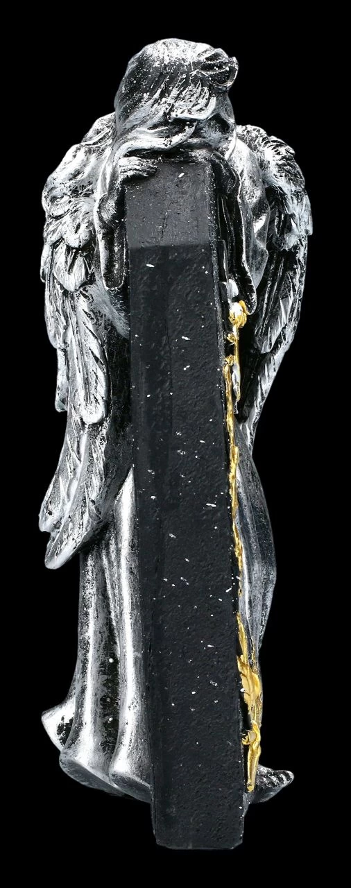 Von der Unvergänglichkeit der Erinnerung zeugt dieser schöne Grabengel, der sich traurig an einen wie aus schwarzem Granit gearbeiteten Grabstein lehnt. Auf dem Grabstein ist, neben dem Kreuz und den goldfarbenen Elementen, die Inschrift ‚In stillem Gedenken‘ zu sehen. Der schöne Grabengel ist 20 cm hoch, 13 cm breit und 7 cm tief. Er ist sehr detailreich aus handbemaltem Kunststein (Polyresin) gefertigt.