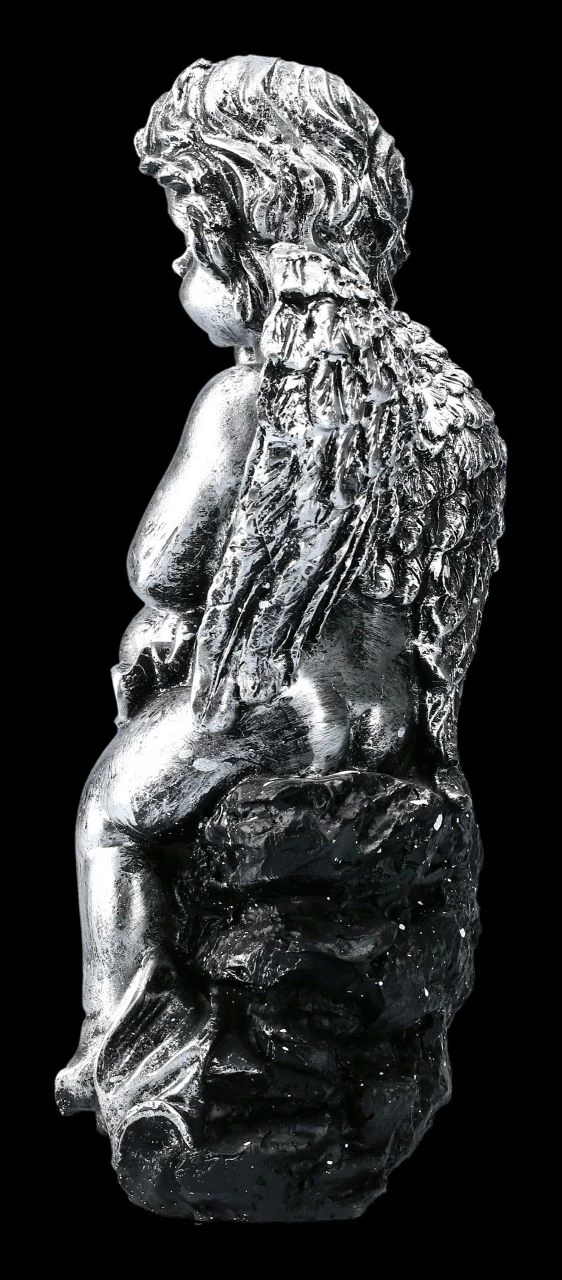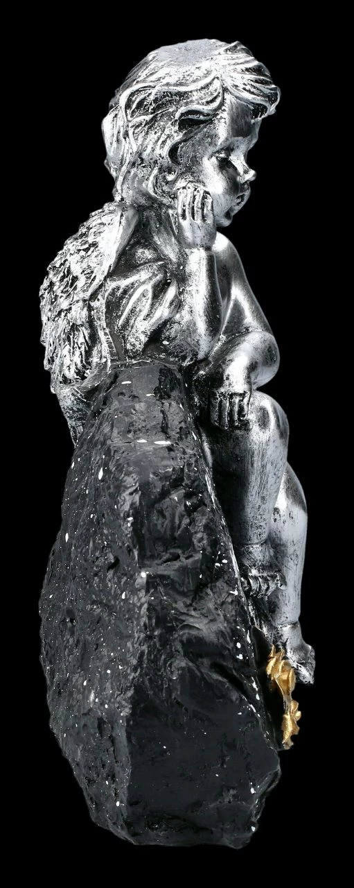 In Gedanken versunken sitzt der silberfarbene kleine Engel auf einem schwarzen, wie ein Granitblock aussehenden Grabstein mit der Inschrift ‚Wir vermissen Dich‘. Die schöne Grabengel Figur ist bis zu den goldenen Rosen auf dem Grabstein detailreich aus handbemaltem Kunststein (Polyresin) gefertigt. Mit der Höhe von 26 cm, der Breite von 24,5 cm und der Tiefe von 10 cm gibt dieser kleine silberfarbene Grabengel einen kleinen nostalgischen und tröstenden Lichtblick.