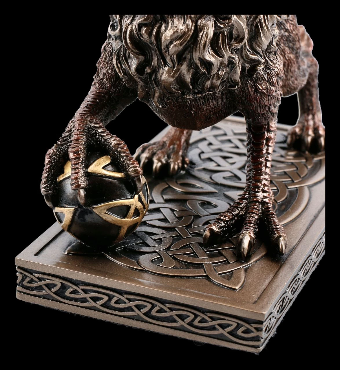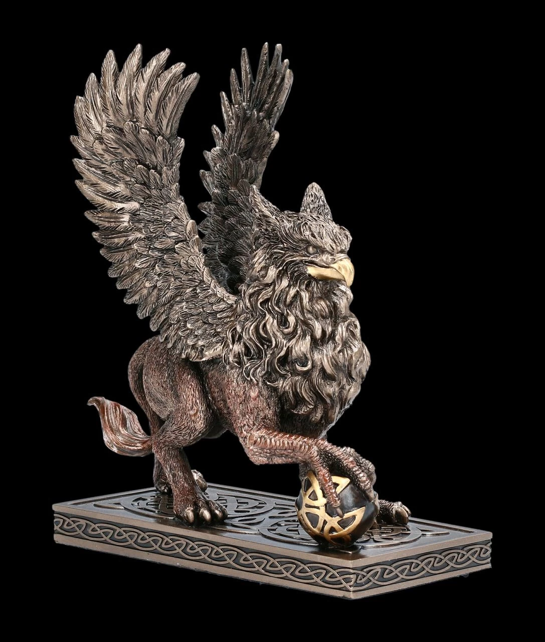 Der außergewöhnliche Greif in edler Bronze-Optik ist bis in die Einzelheiten sehr detailreich dargestellt. Dieser eindrucksvolle geflügelte Greif von Veronese hat die Hinterbeine, den Schwanz und die Mähne eines Löwen und den Schnabel und Flügel eines Adlers. Mit einer Kralle hält er eine Kugel fest. Der Greif mit dem Körper eines Löwen und den Kopf eines Adlers ist auch als Wächter des Geheimen Wissens und als treuer Begleiter seines Herren oder seiner Herrin bekannt. Die Greif-Figur steht auf einer rechteckigen, verzierten Bodenplatte und ist sehr edel bronziert und coloriert. Der Greif ist aus hochwertigem Kunststein (Polyresin) gefertigt und 19 cm hoch, 15,5 cm breit und 8 cm tief.