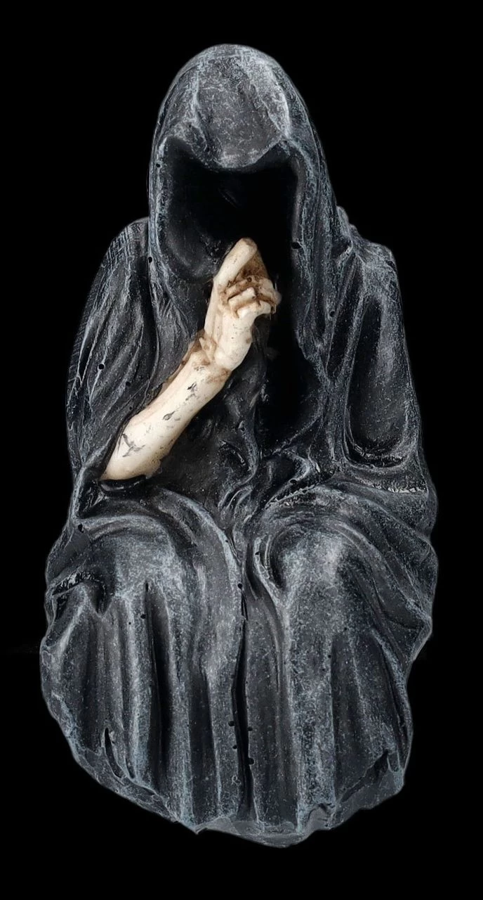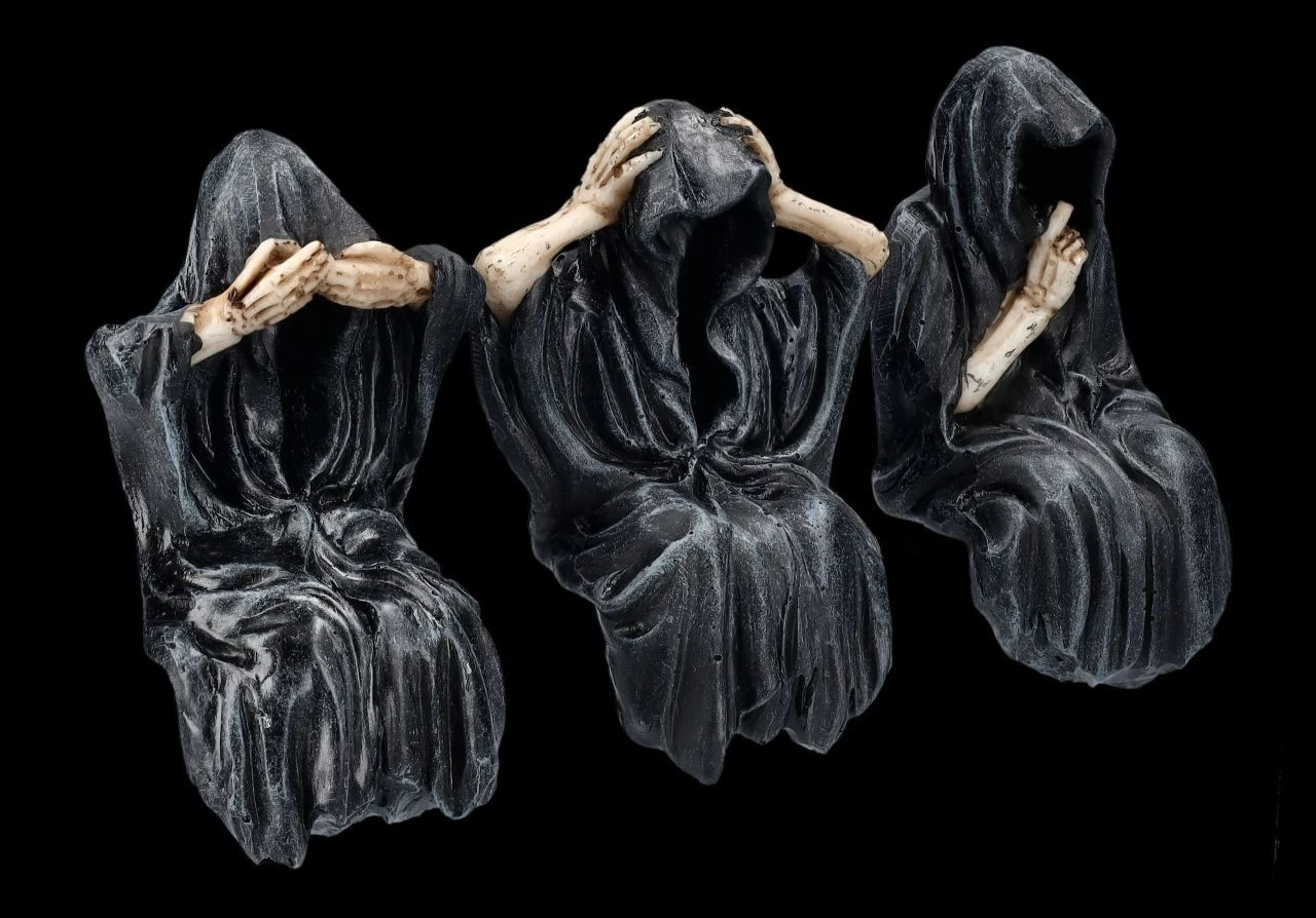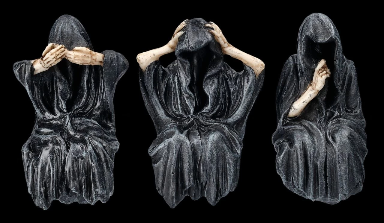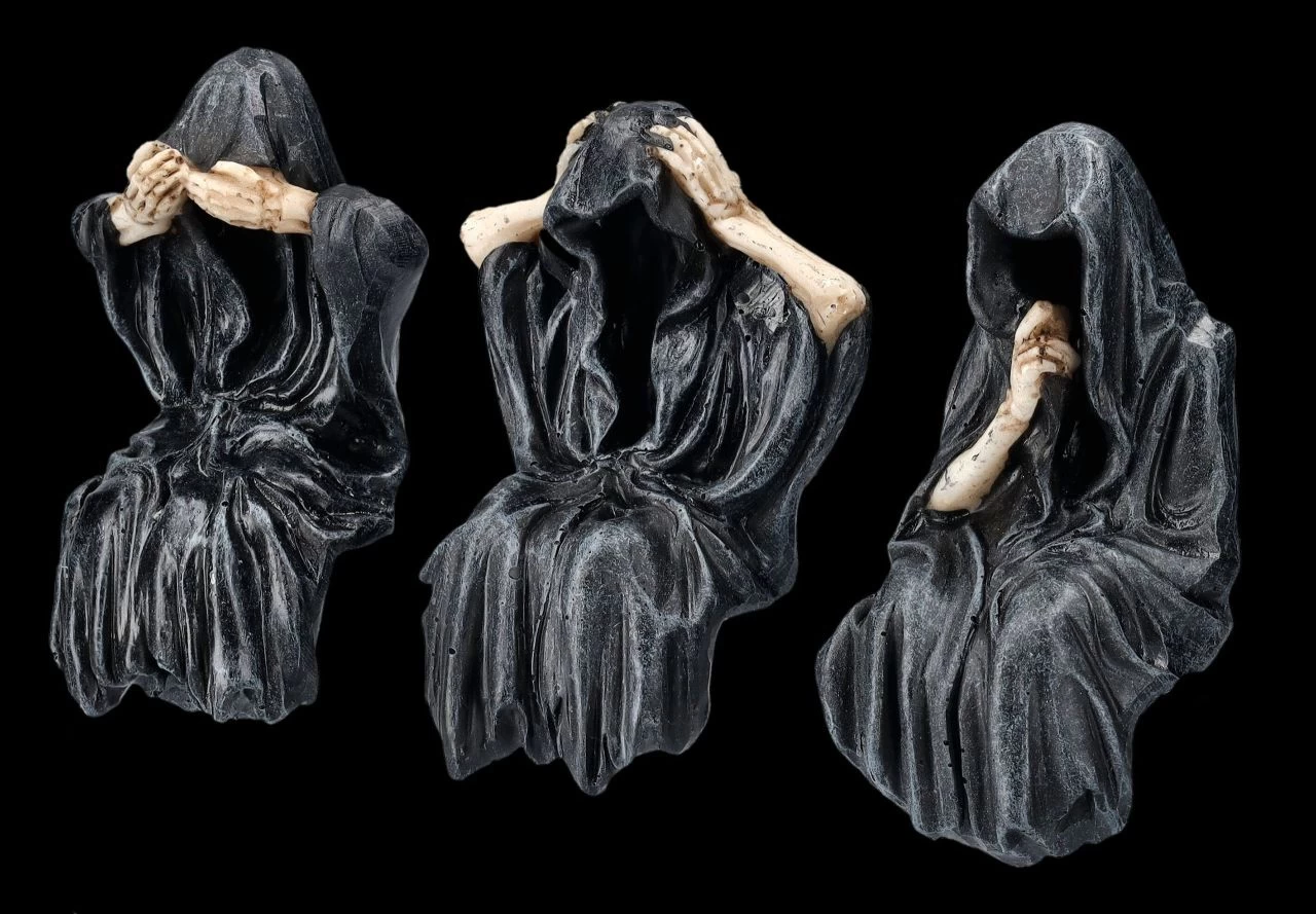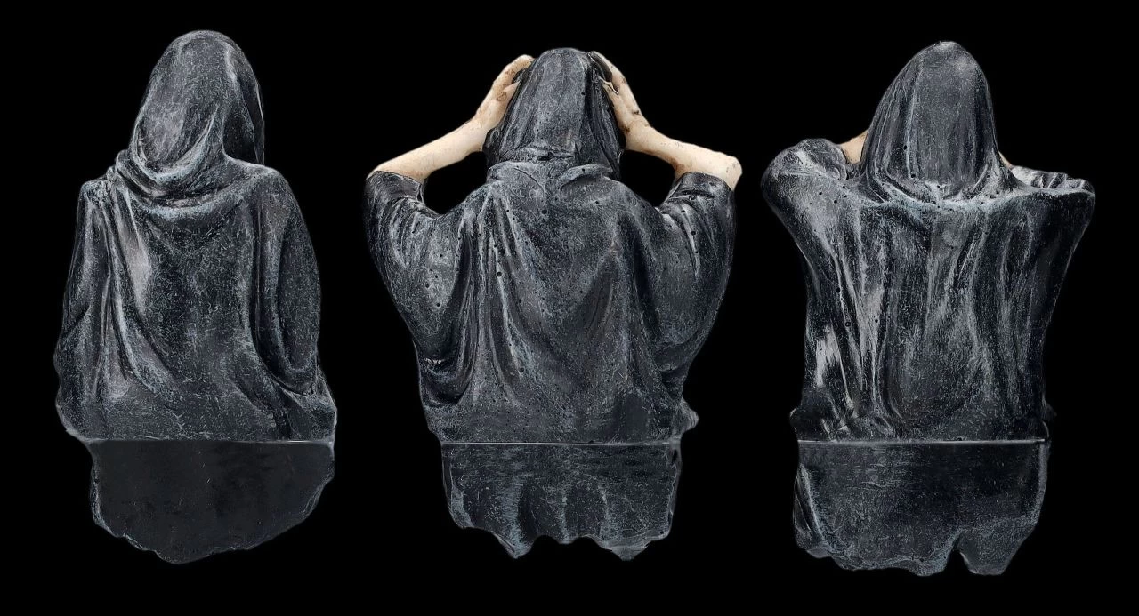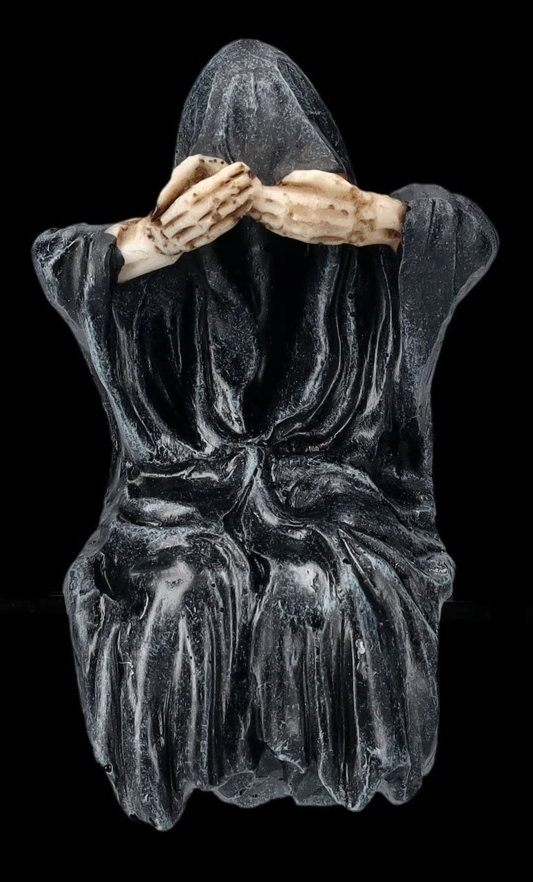Da sieht man’s mal wieder – selbst den Reaper überfällt das Grausen, wenn er die Nachrichten hört. Und manchmal will er demonstrieren, dass er absolut nichts Böses mehr hören, sehen und natürlich auch nicht sagen möchte. Als Kantenhocker sind diese witzigen Grim Reaper-Figuren aus handbemaltem Kunststein (Polyresin) ein wahrer Blickfang. Sie sind je 8 cm hoch, 4,5 – 6,5 cm breit und je 5 cm tief. Unter Umständen sind sie aber auch ein vielsagendes Geschenk.