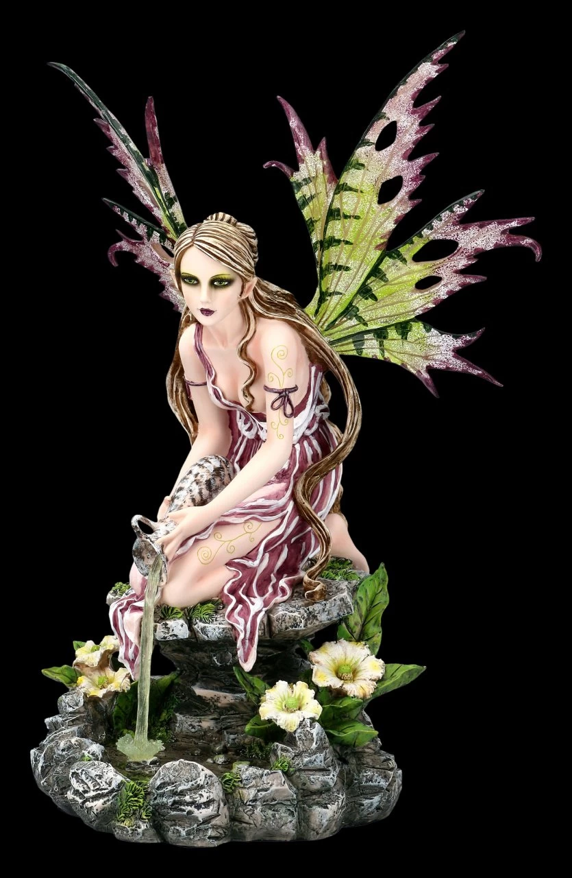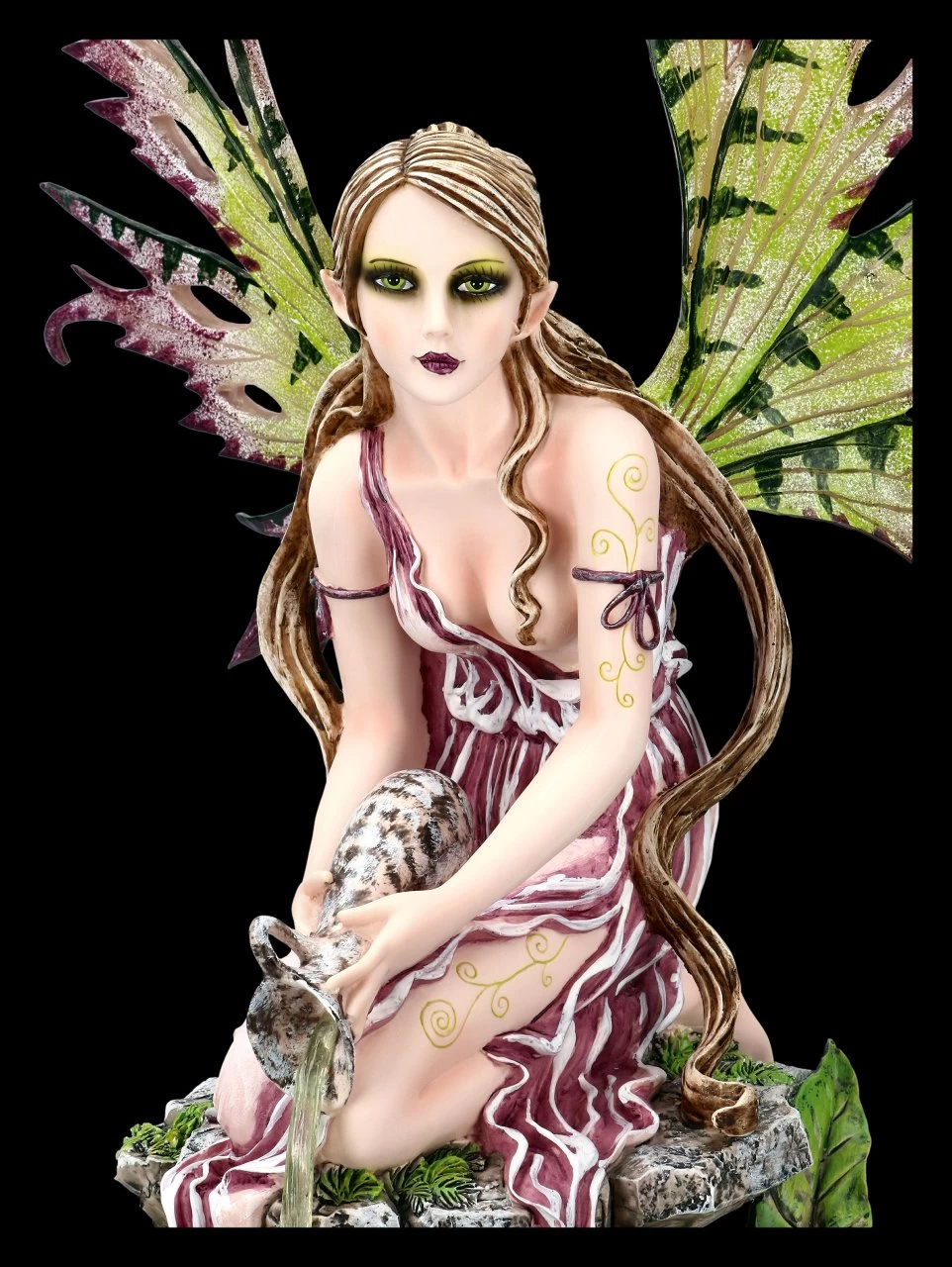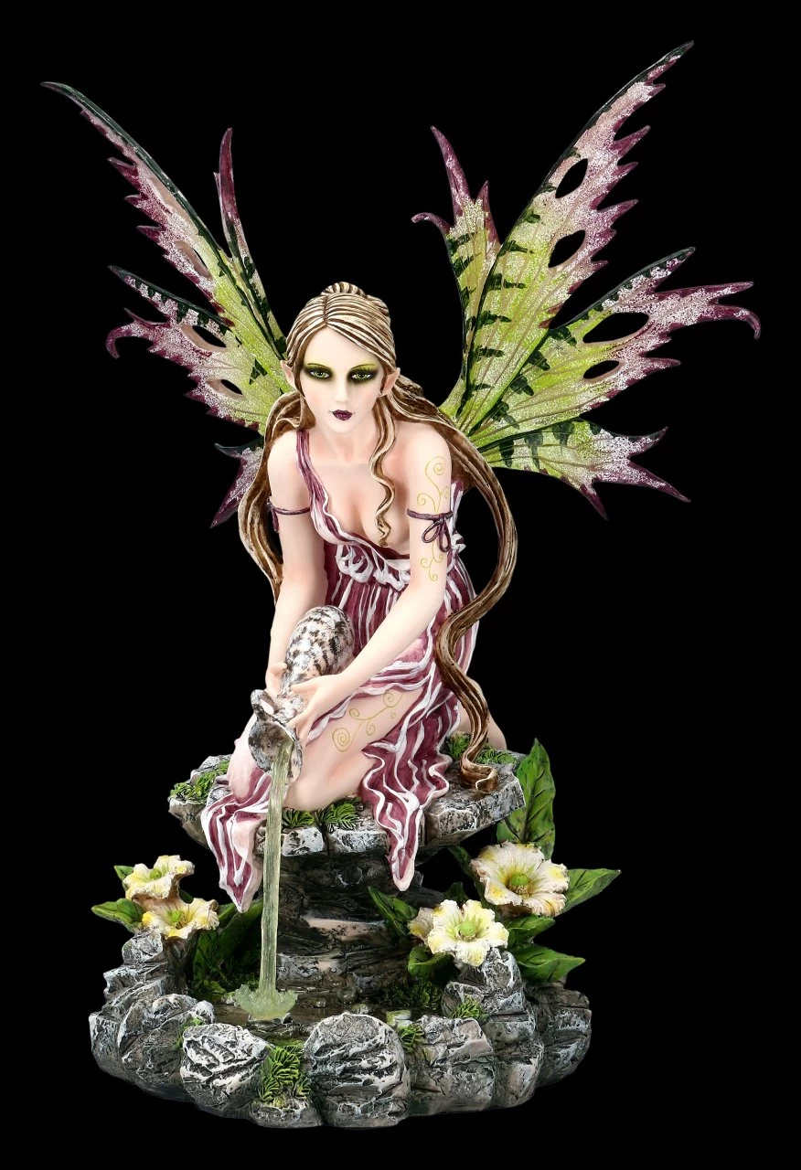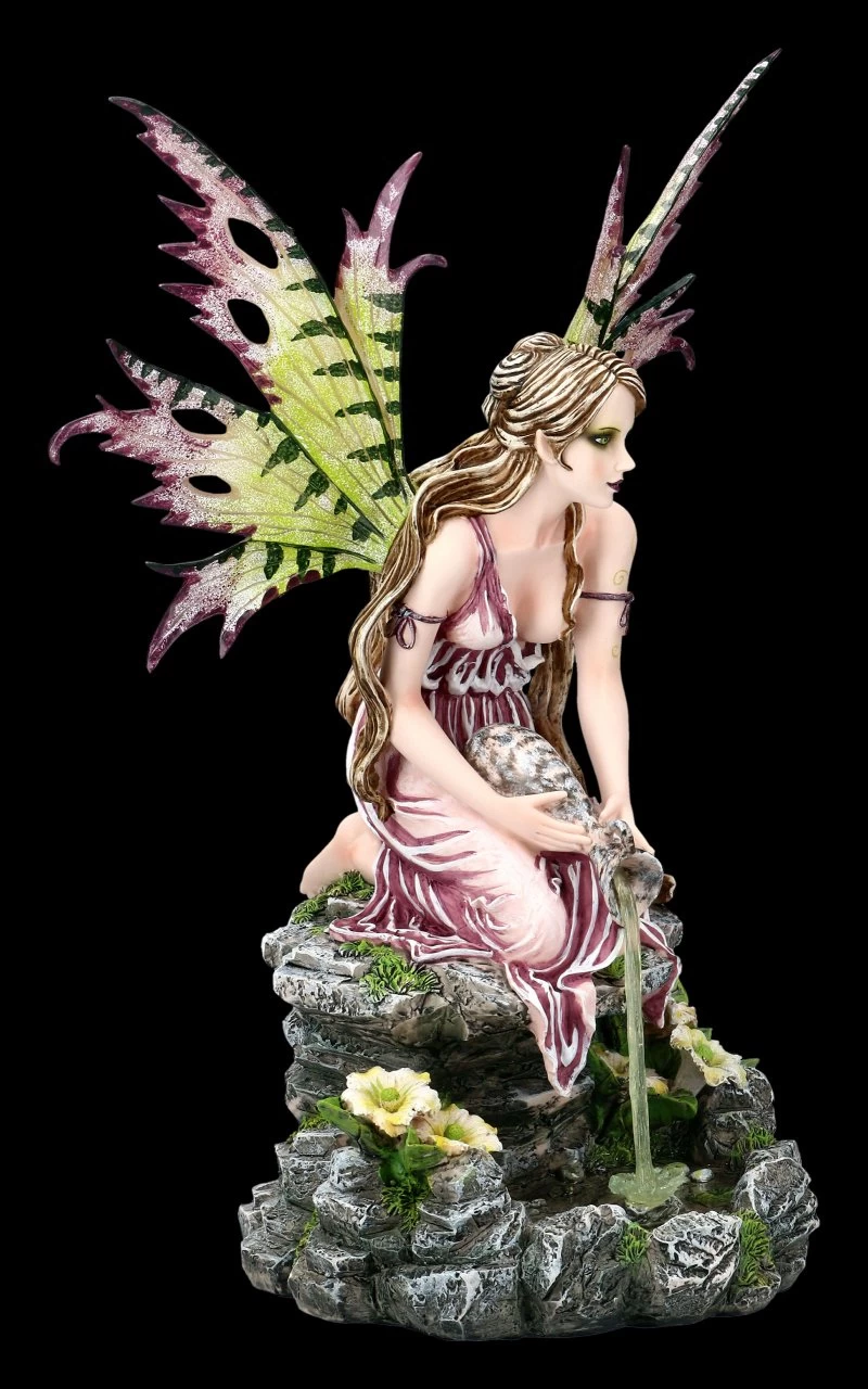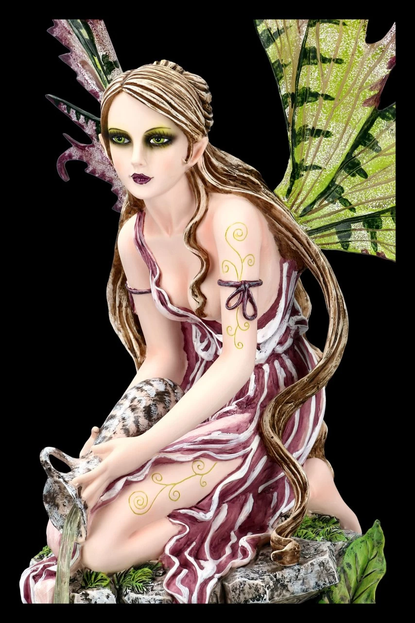 Verträumt gießt die Flusselfe Wasser aus einem Krug in einen kleinen See. Die Elfe wurde aus hochwertigem Kunstein gefertigt und handbemalt. Durch diese detaillierte Machart wirkt sie sehr lebendig. Beinahe vermeint man, das Plätschern des Wassers zu hören.