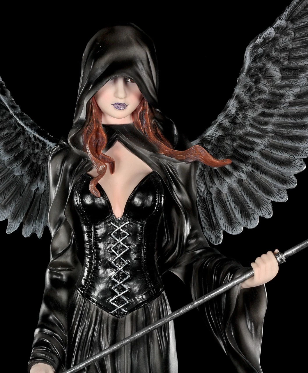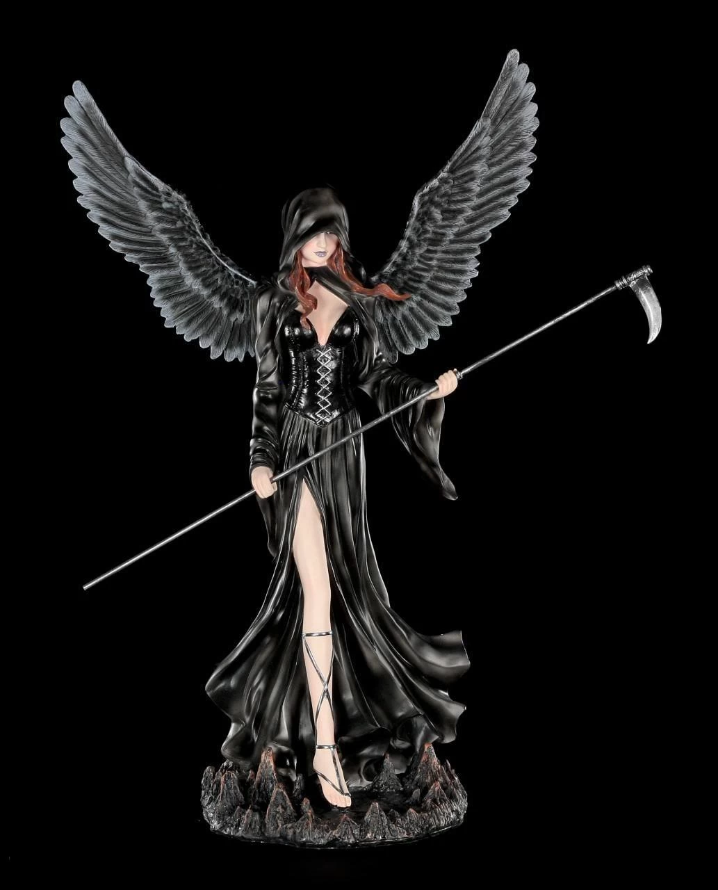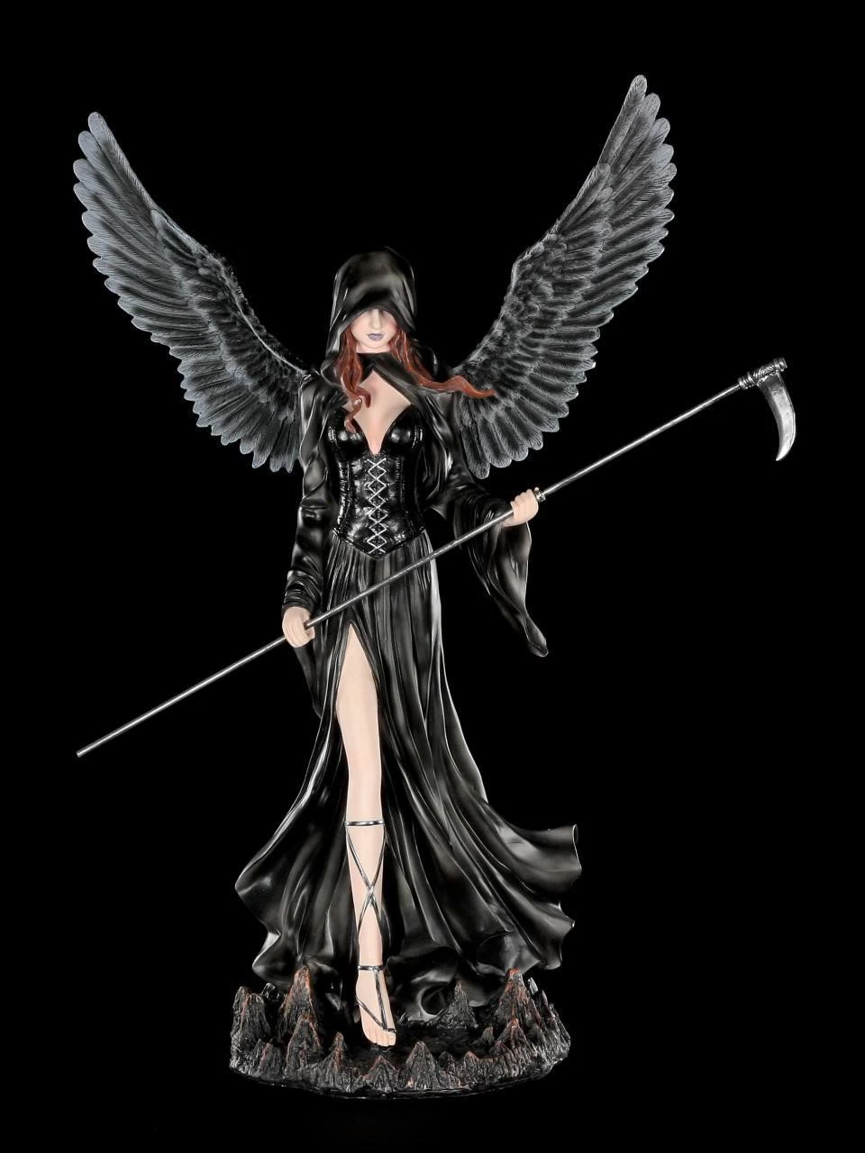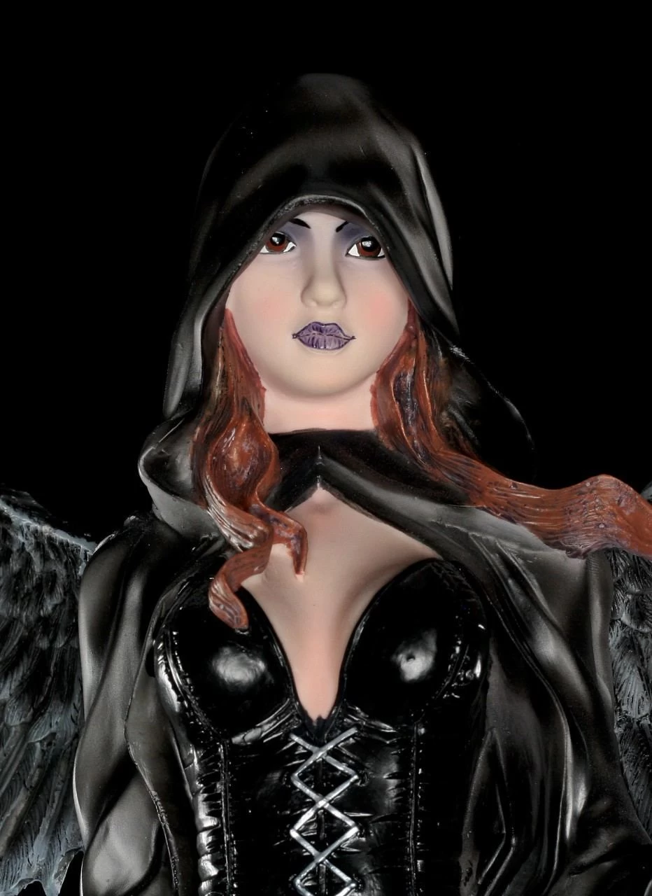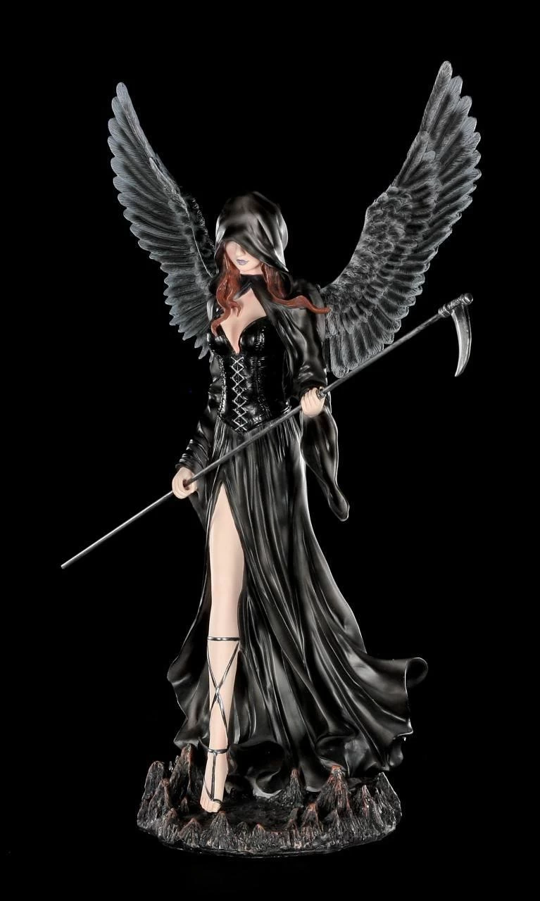 In dieser Darstellung erhältst du eine handbemalte Todesengel-Figur. Die Dekofigur hält eine Sense in der Hand, ihr schwarzes Cape verdeckt einen Teil ihrer Augen. Ihre rotbraunen Haare erscheinen unter ihrem dunklen Cape. Ihr Blick ist bestimmend, ihre Haltung aufrecht.
