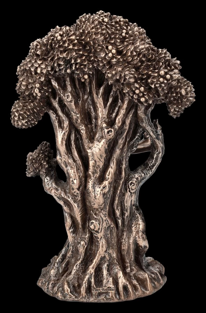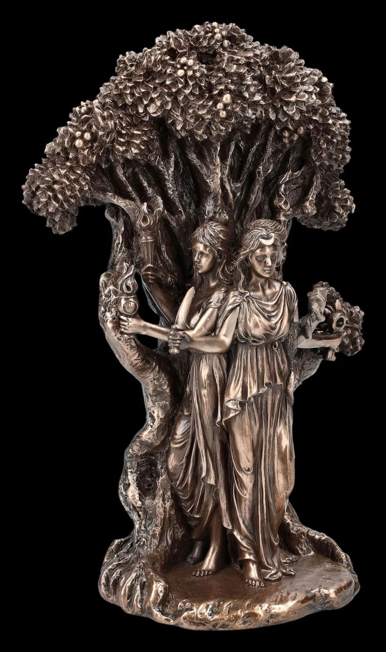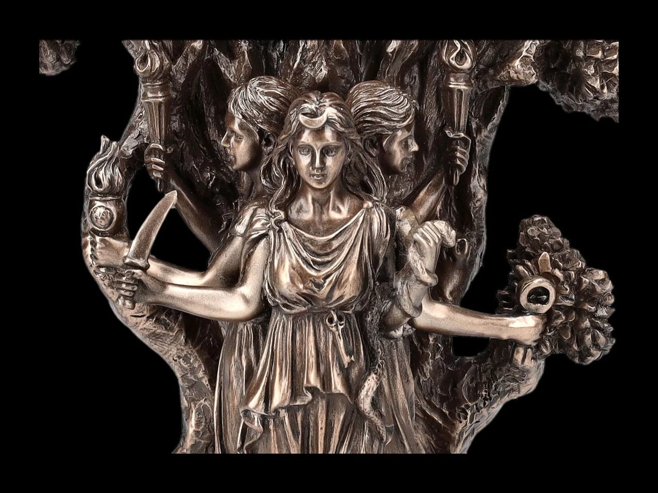 Hekate, die Göttin der Magie, Theurgie und der Totenbeschwörung aus der griechischen Mythologie steht als Dreifach-Göttin vor dem Lebensbaum. Auf ihrem Kopf hat sie die Mondsichel als Haarschmuck. In der einen Hand hält sie ein Kurzschwert und in der anderen einen Schlüssel. Die beiden anderen, hinter ihr stehenden Körper der Dreifach-Göttin halten Fackeln in ihren Händen. Schließlich gilt Hekate auch als Wächterin der Tore zwischen den Welten, die wiederum von dem schönen Lebensbaum symbolisiert werden. Die 18 cm hohe, 11,5 cm breite und 8 cm tiefe Skulptur der Dreifach-Göttin aus der Studio Collection von Veronese wurde sorgfältig und detailreich aus edel bronziertem Kunststein (Polyresin) geschaffen. Die bezaubernde Skulptur ist ein effektvoller Blickfang und ein wunderbar mystisches Geschenk.
