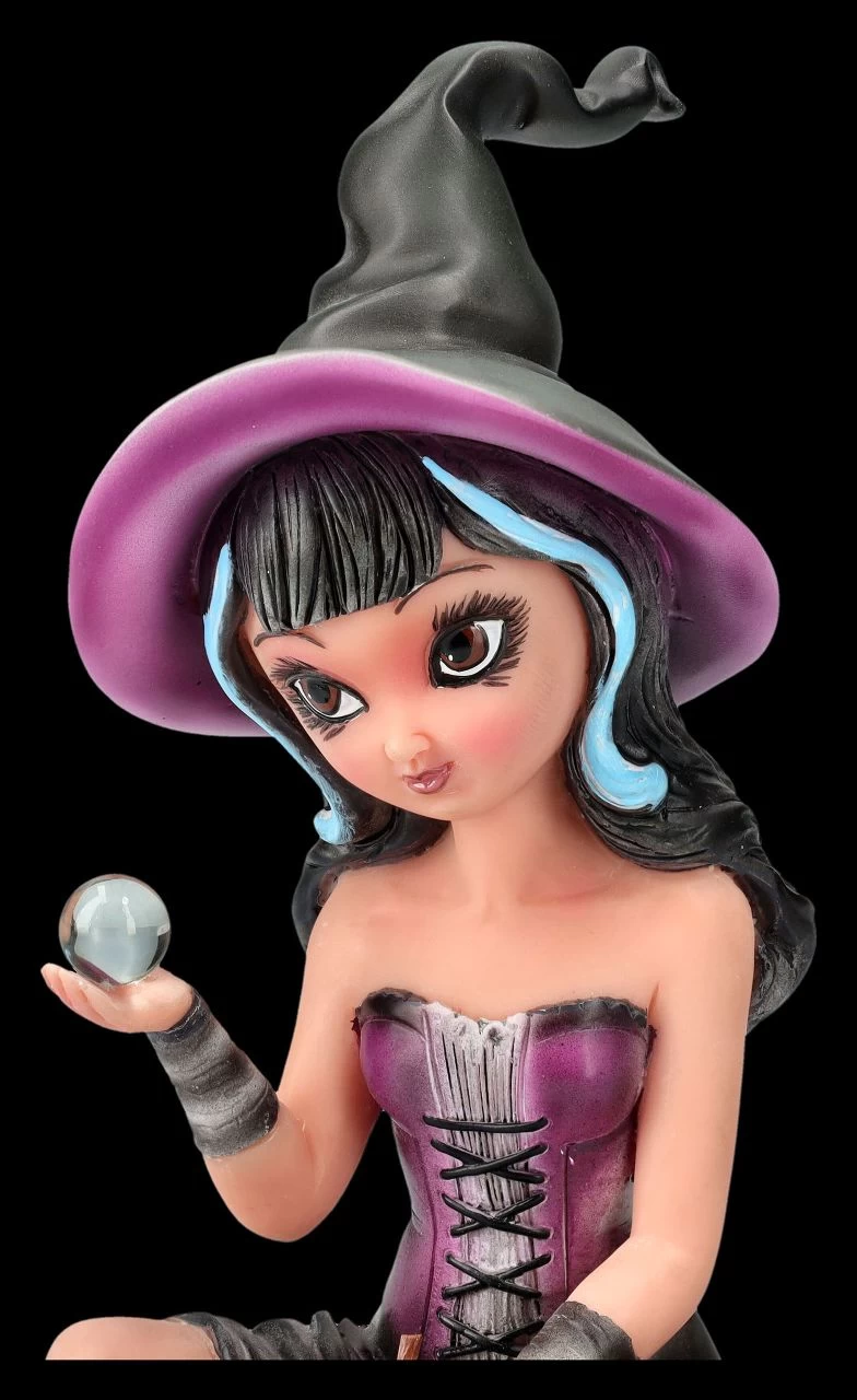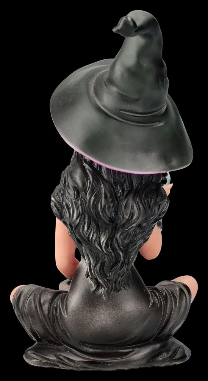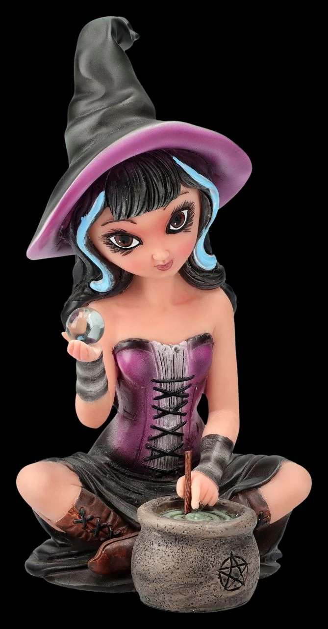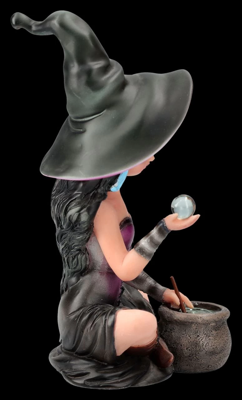 In ihrem lila-schwarzen Kleid und Hexenhut sitzt Pruedence vor dem Hexenkessel, in dem sie ihren Zaubertrank braut. Während sie mit der linken Hand im Kessel rührt, zeigt sie uns mit der rechten Hand ihre magische Zauberkugel. Ist Pruedence die gefährlichste unter ihren Schwestern – oder wirkt das nur so? Mit den großen Augen und dem Augenaufschlag wirkt sie eher unschuldig – aber kann man ihr trauen? Die 15 cm hohe, 8 cm breite und 7,5 cm tiefe Hexen Figur ist detailreich aus Kunststein (Polyresin) gefertigt und liebevoll von Hand bemalt. Die bezaubernde Hexe Proedence ist – vielleicht auch gleich mit ihren Hexenschwestern aus unserem Shop – auch ein wunderbares Geschenk.