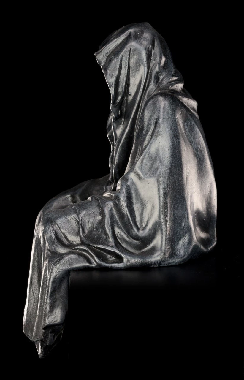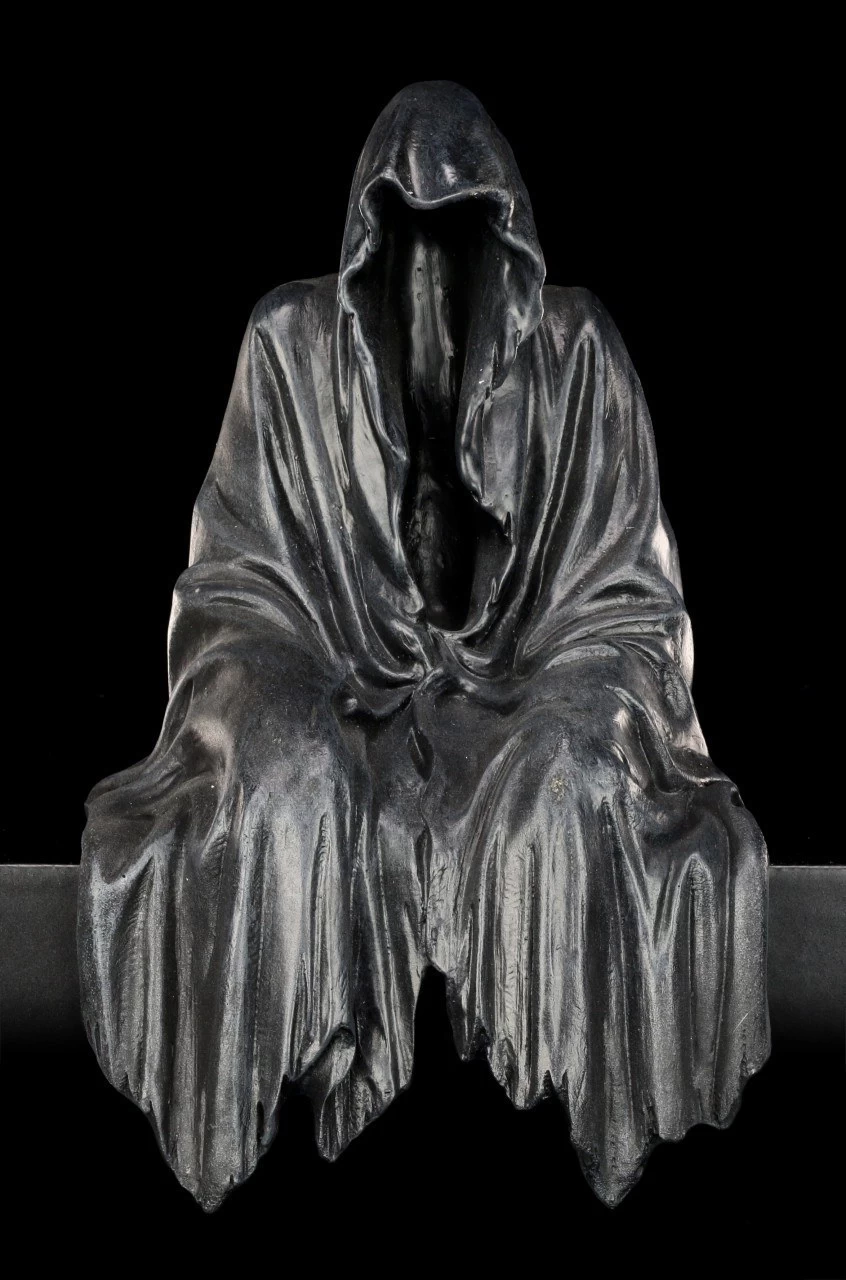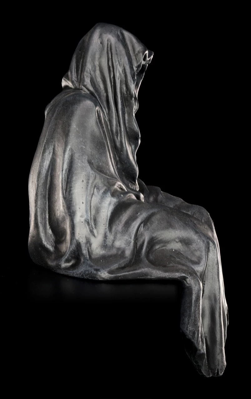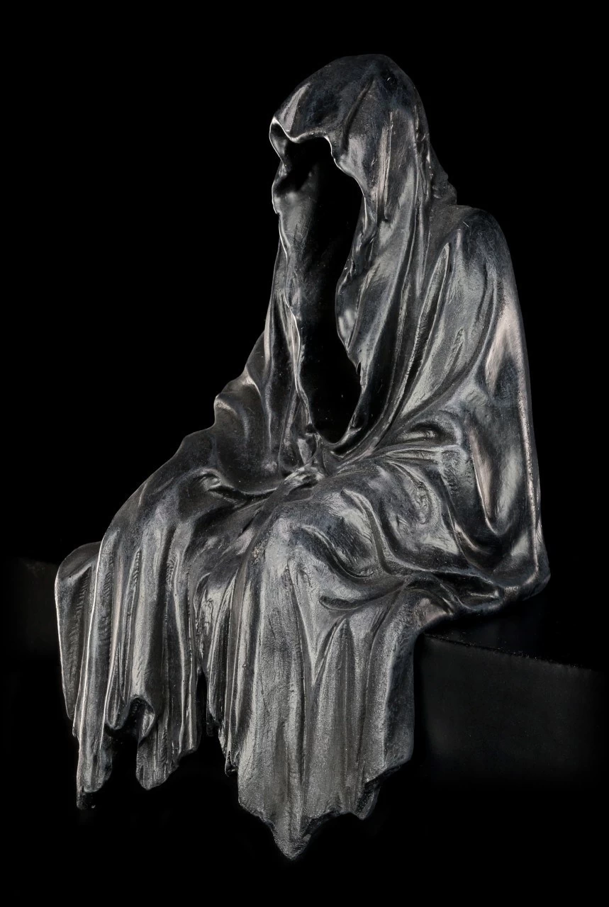 Böse und abwartend sitzt der Meister der Dunkelheit auf der Kante. Er wartet auf die nächste Seele, die er holen und verschlingen kann. Die Haltung des Reapers ist leblos. Sein Gesicht verschwindet in der Kapuze seines langen Kapuzenumhangs, der charakterisierend für den Reaper ist. Diese gesichtslose Reaper-Figur ist eine unheimliche Verbildlichung des Todes.