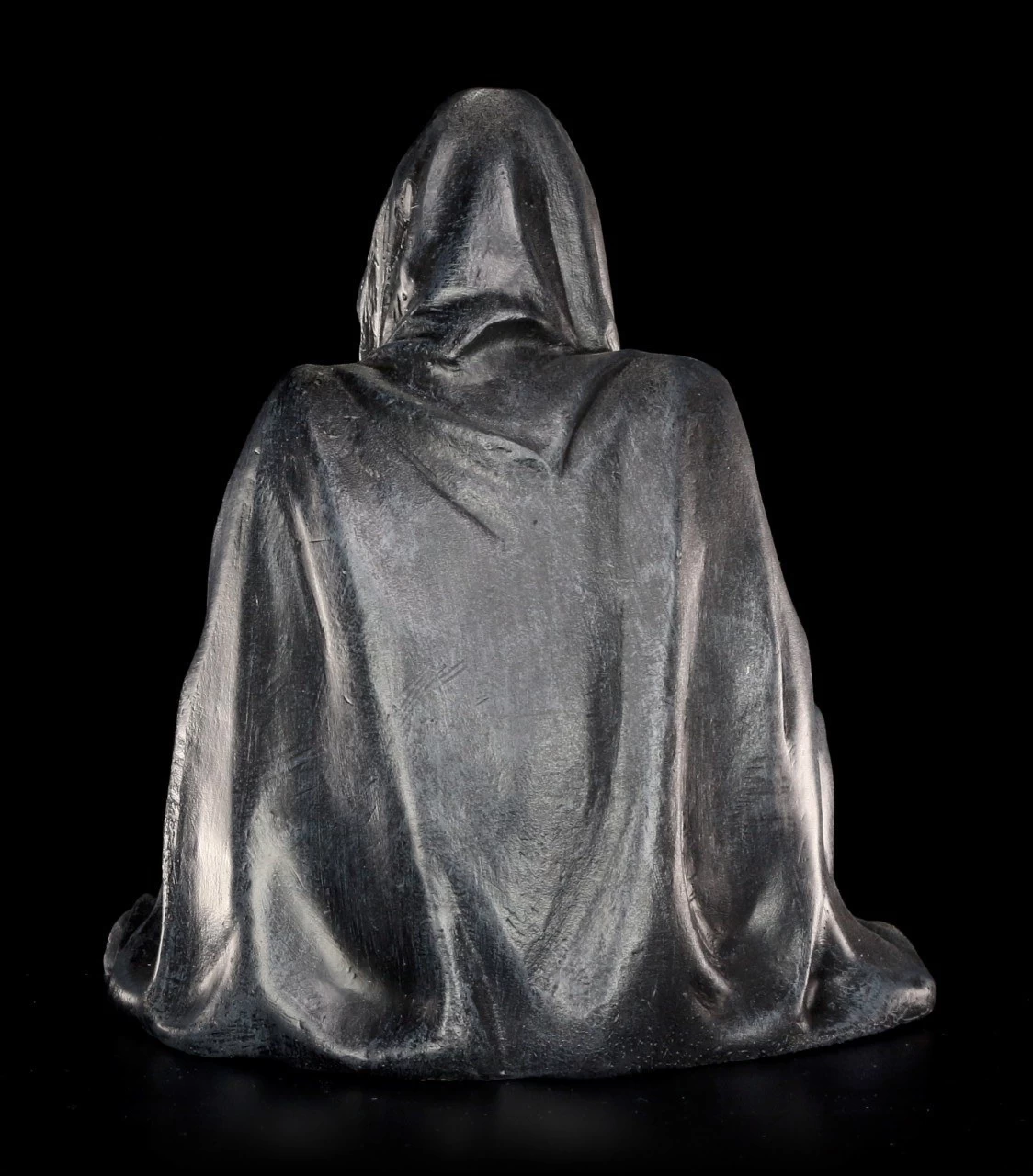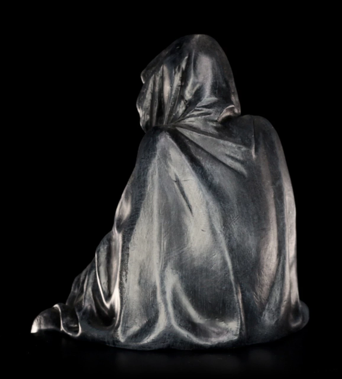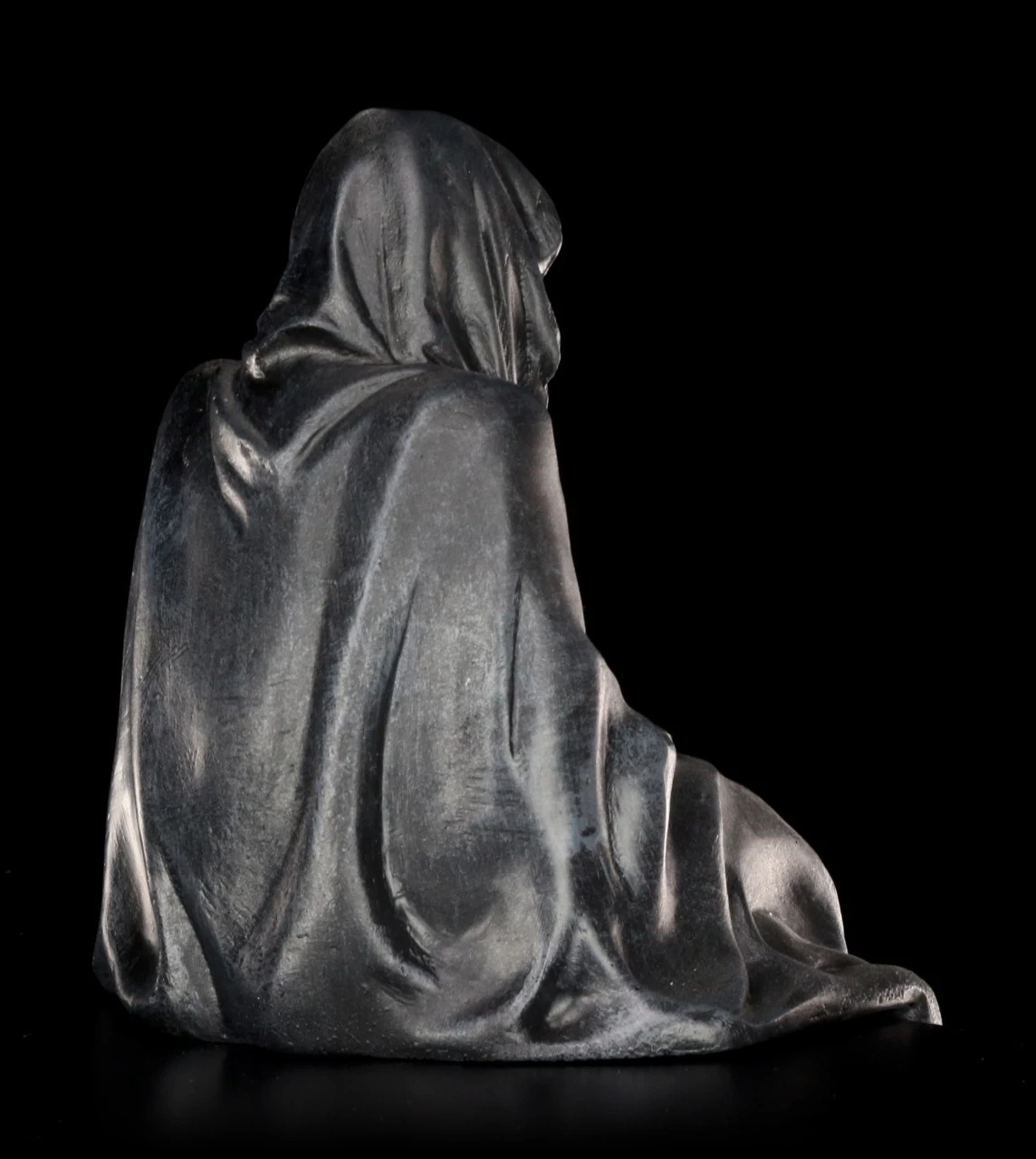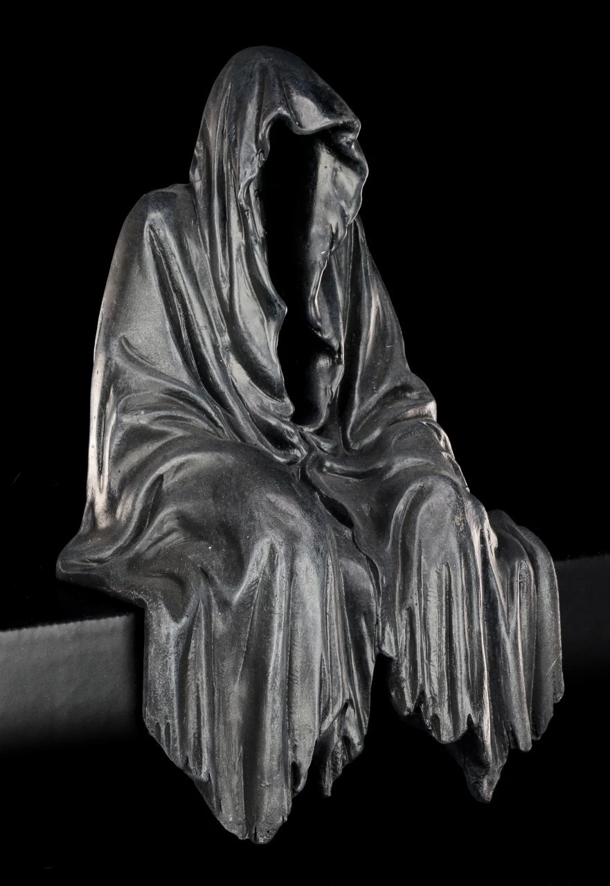 Böse und abwartend sitzt der Meister der Dunkelheit auf der Kante. Er wartet auf die nächste Seele, die er holen und verschlingen kann. Die Haltung des Reapers ist leblos. Sein Gesicht verschwindet in der Kapuze seines langen Kapuzenumhangs, der charakterisierend für den Reaper ist. Diese gesichtslose Reaper-Figur ist eine unheimliche Verbildlichung des Todes.