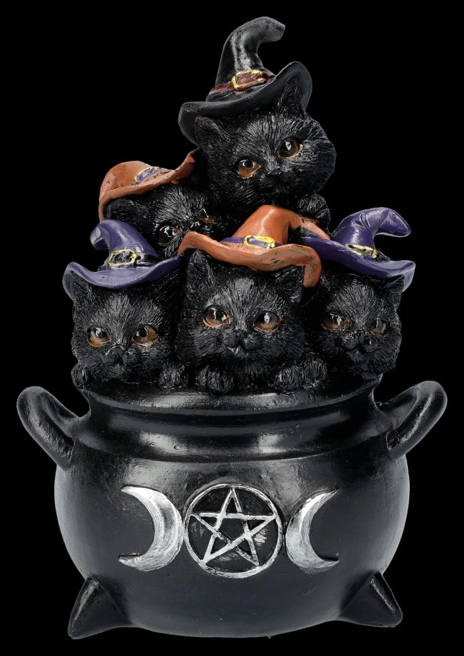 Gleich zu fünft drängeln sich die frechen kleinen Hexenkatzen in dem Hexenkessel. Hoffentlich kommt niemand auf die Idee, Feuer unter dem Kessel zu machen… Aber es wird schon nichts passieren, denn schließlich ist auf dem Hexenkessel nicht nur das Symbol des Dreifach-Mondes, sondern auch das Pentagramm als mächtiges Schutzsymbol zu sehen. Die niedlichen Frechdachse in dem Hexenkessel sind aus liebevoll handbemaltem Kunststein (Polyresin) und 12,5 cm hoch, 9,5 cm breit und 8 cm tief. Über diese putzige Katzen-Figur als Geschenk werden sich nicht nur große und kleine Hexen, sondern alle Katzenfreunde sicherlich sehr freuen.