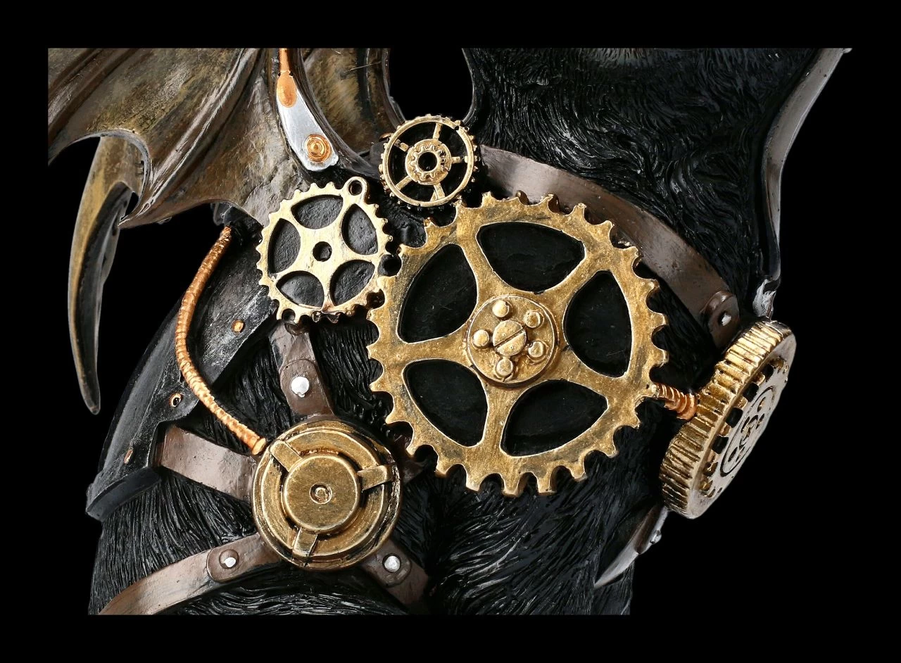 Mit ihren leuchtend grünen Augen konzentriert nach oben schauend, sitzt die schwarze Steampunk Katze erwartungsvoll da. Feline Flight wartet auf den magischen Moment, in dem es ihr gelingt, alle Rädchen in Bewegung zu setzen, damit sie mit den umgeschnallten Fledermausflügeln abheben und wegfliegen kann. Die schwarze Katzenpilotin Feline Flight ist fantastisch detailreich aus Kunststein (Polyresin) gefertigt und von Hand bemalt. Die technischen Details der 23 cm hohen, 16 cm breiten und 10 cm tiefen Steampunk Büste wirken wie aus Metall gefertigt. Feline Flight ist für Steampunk Fans und natürlich auch für alle Freunde schwarzer Hexenkatzen eine außergewöhnliche Deko und auch ein besonders ausgefallenes Geschenk.