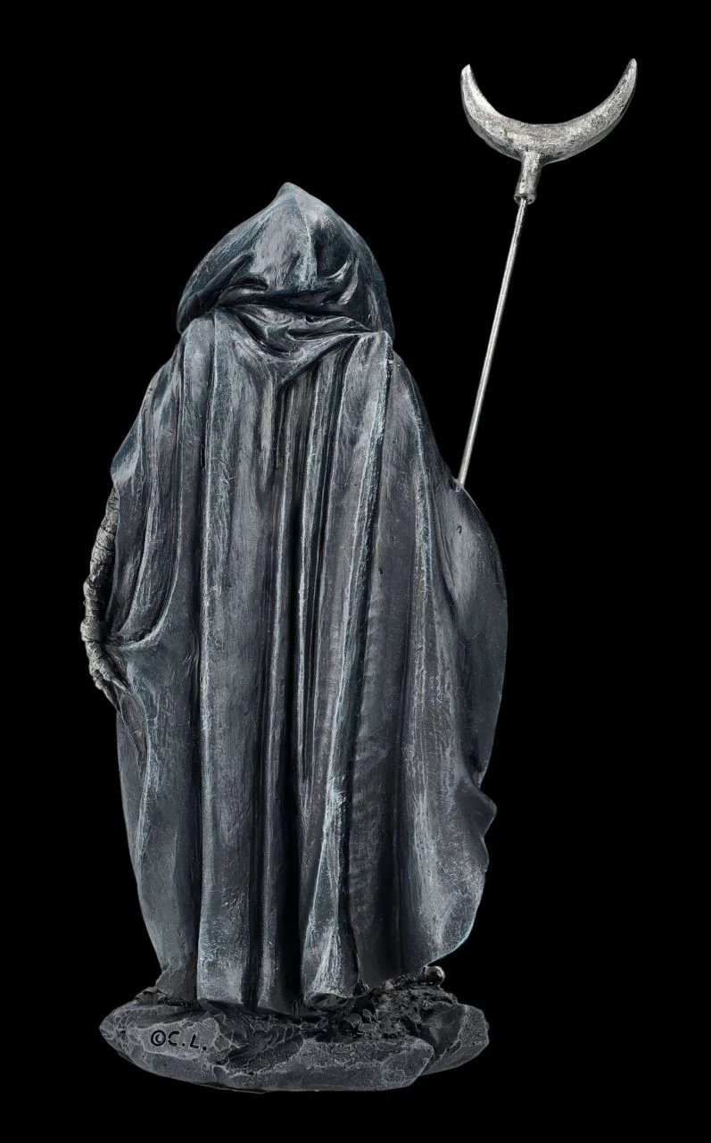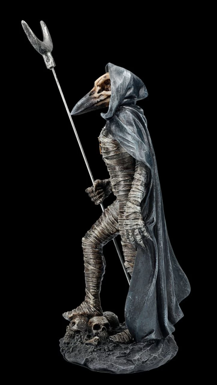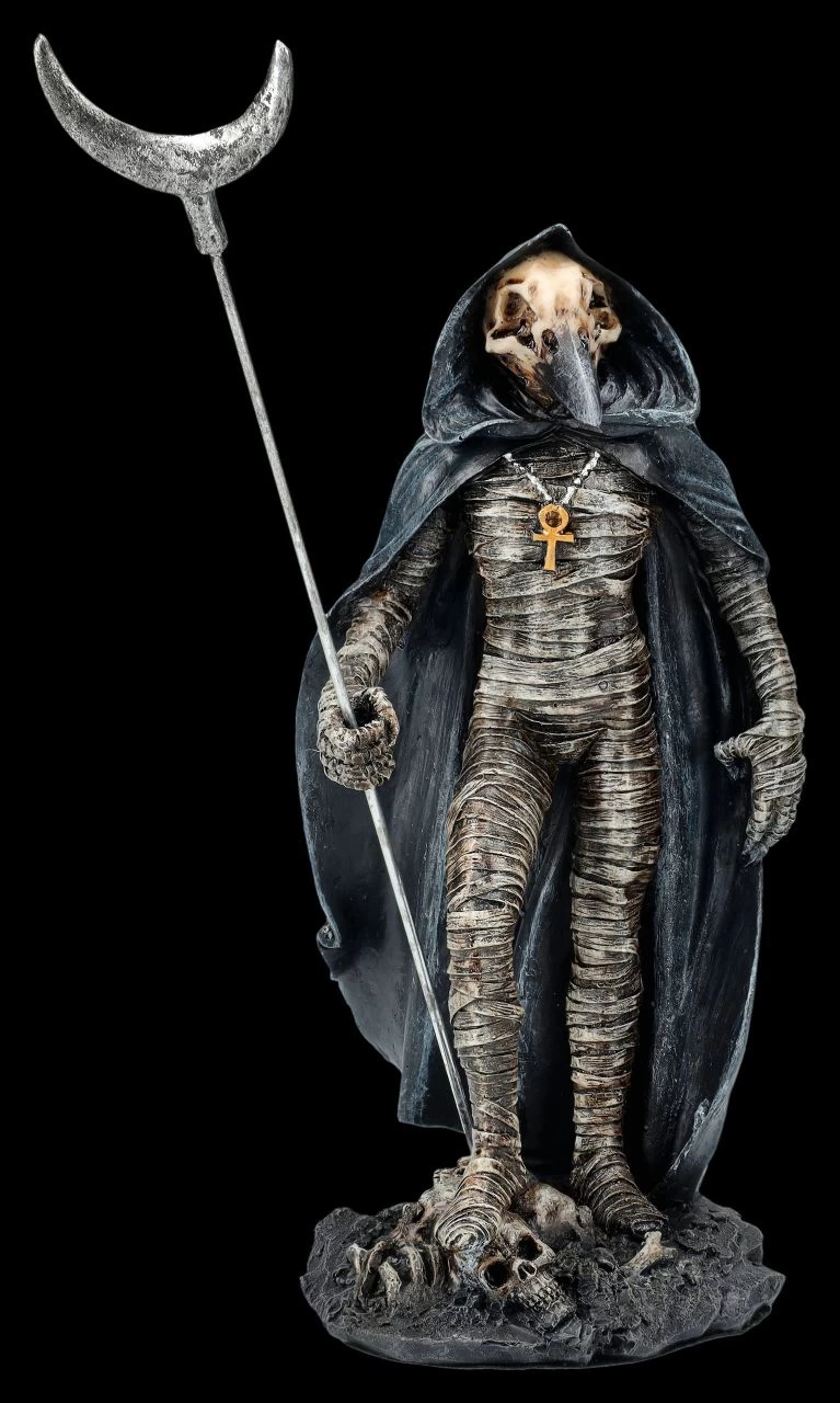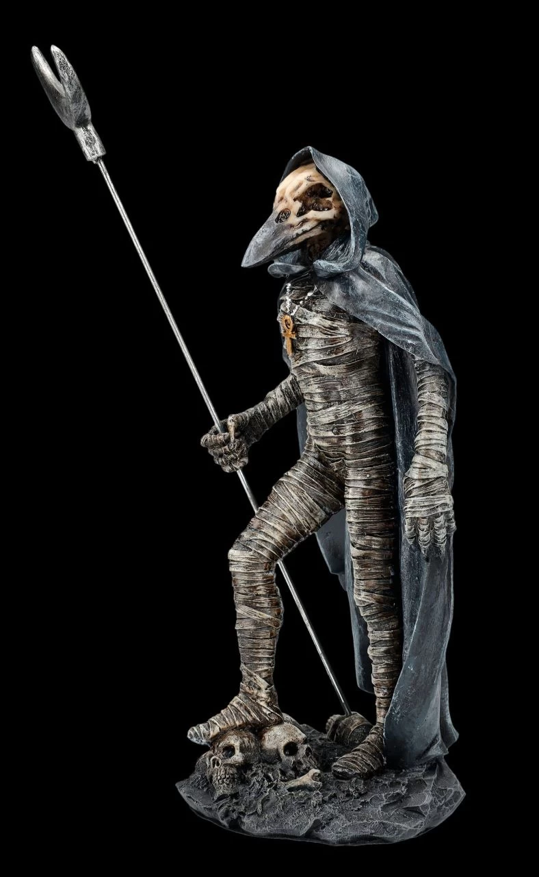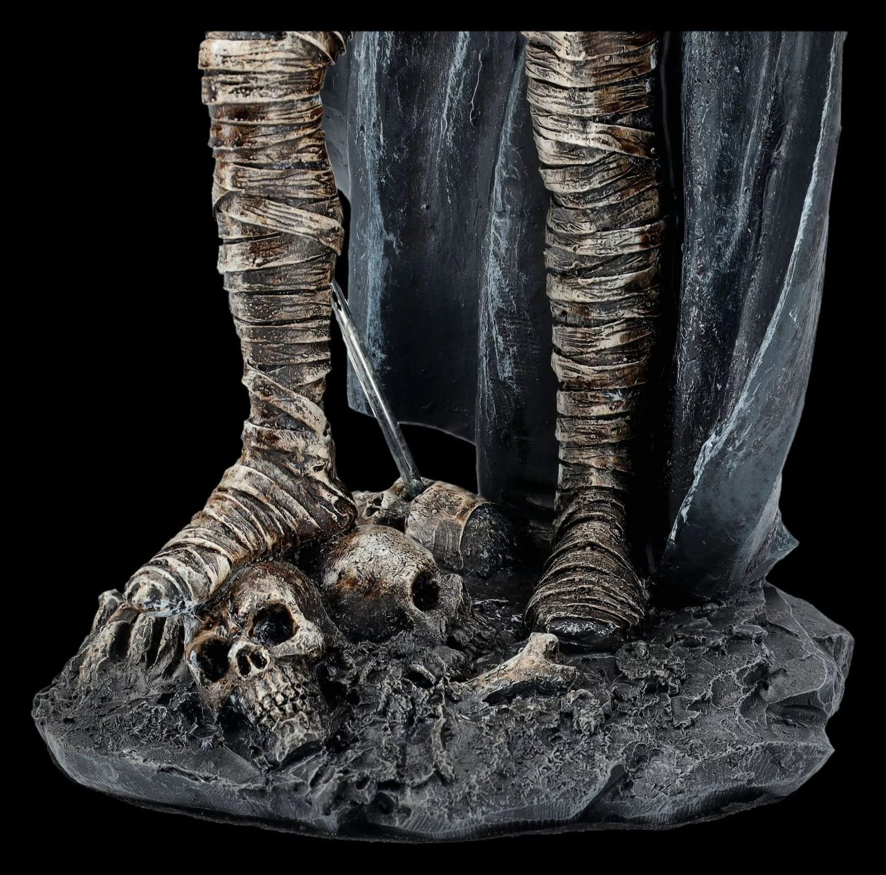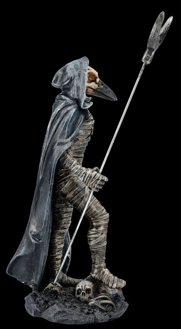 Lässig ein Bein auf die Totenschädel zu seinen Füßen gestellt, steht der Mondgott Khonshu aus der altägyptischen Mythologie da. Die faszinierende Figur zeigt Khonshu mit Vogelschädel und in Bandagen eingewickelt wie eine Mumie und mit langem Kapuzenumhang. In der Hand hält die einzigartige Figur einen Stab, an dessen Spitze eine nach oben gerichtete Mondsichel steht. Der Stab ist zum Stecken. Khonshu war in der Mythologie Ägyptens der Sohn des Sonnengottes Amun und der Himmelsgöttin Mut. Er galt als Herr der Zeit, aber auch als Heilgott, dem auch das Wiederbeleben von Toten zugeschrieben wurde. Die Skulptur des Mondgottes Khonshu ist aus handbemaltem Kunststein (Polyresin) und 23 cm hoch, 13 cm breit und 10 cm tief. Es ist eine wahrlich effektvolle Skulptur, die überall zum sofortigen Blickfang wird. Sie ist nicht nur für Sammler und an der Geschichte Ägyptens interessierte auch ein faszinierendes und eindrucksvolles Geschenk.