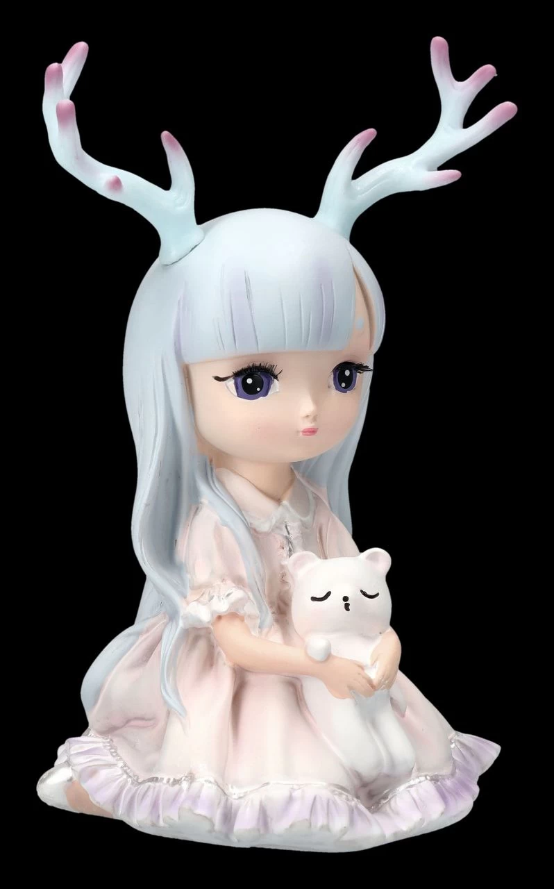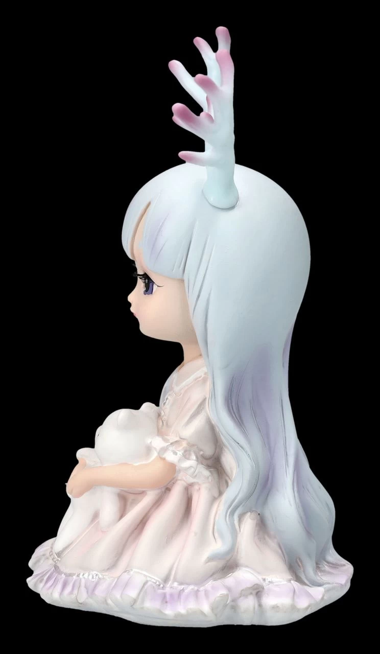 Wie man am Geweih erkennen kann, gehört die kleine Fee zu der Elfenschar, die sich um die neugeborenen Bambis kümmern soll. Aber da sie noch sehr jung ist, darf sie erst mal mit ihrem Kuscheltier üben. Die 13 cm hohe, 8 cm breite und 7,5 cm tiefe kleine Fee mit Geweih und Kuscheltier ist aus liebevoll handbemaltem Kunststein (Polyresin) gefertigt und ein wunderbares Geschenk für alle, die gerne von der Welt der Feen und Elfen träumen. Gemeinsam mit ihren Freundinnen aus unserem Shop ist die kleine Fee in ihrem rosa Kleidchen auch eine niedliche Deko für jeden Geburtstagstisch.
