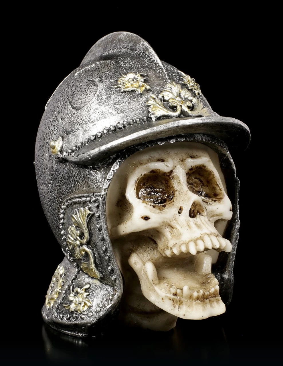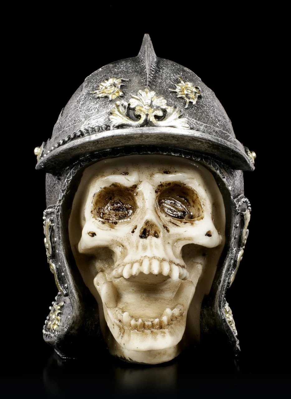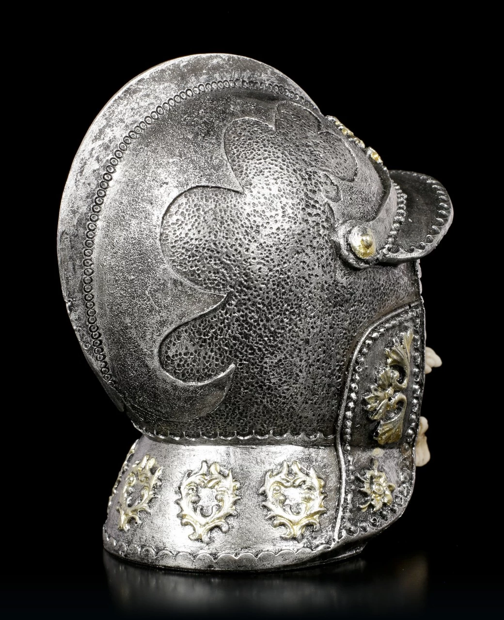 Der abgeschlagene Schädel des tapferen Ritters trägt noch den reich verzierten Helm, mit dem er in die Schlacht gezogen ist. Der handbemalte Totenkopf aus Kunststein (Polyresin) sollte in keiner Schädelsammlung fehlen.