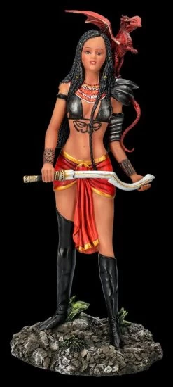 Der beliebten amerikanischen Fantasy-Künstlerin Nene Thomas aus Oklahoma City gelingt es immer wieder, ihren Elfen und Feen eine sinnliche Lebendigkeit einzuhauchen. Daher sind ihre magischen Wesen nicht nur bei Sammlern sehr begehrt. Mit ihren Darstellungen schafft sie es immer wieder, die Fantasie eines jeden anzuregen. Was bei dieser leicht bekleideten wunderschönen bewaffneten Kriegerin in Stil einer altägyptischen Rachegöttin auch kein Wunder ist. Stolz, feurig und wild steht sie bereit, ihren Platz in der Welt zu verteidigen. Der rote Feuerdrache auf ihrer Schulter richtet sich auf, und scheint sie freudig anzuspornen. Obwohl die starke Adaeze das gar nicht nötig hat. Das beeindruckende Kunstwerk von Nene Thomas ist bis zu den schwarzen Rastalocken und den gebräunten Hauttönen wunderbar detailreich aus liebevoll handbemaltem Kunststein (Polyresin) entstanden. Die 30,5 cm hohe, 14 cm breite und 13 cm tiefe Kriegerin Adaeze mit ihrem Drachen wird nicht nur Sammler begeistern. Sie ist auch ein prachtvolles Geschenk für Fantasy Fans, das einen perfekten Platz verdient.