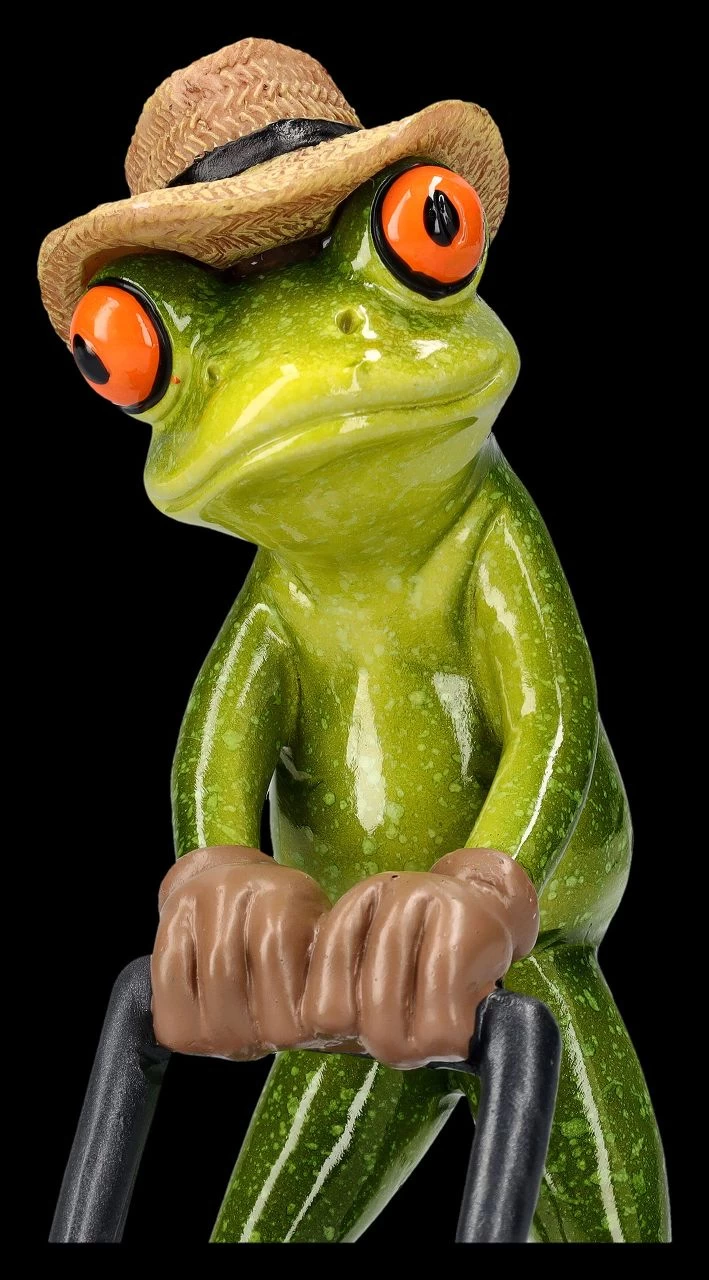 Grüner Daumen, breites Grinsen: Froschfigur als Gärtner