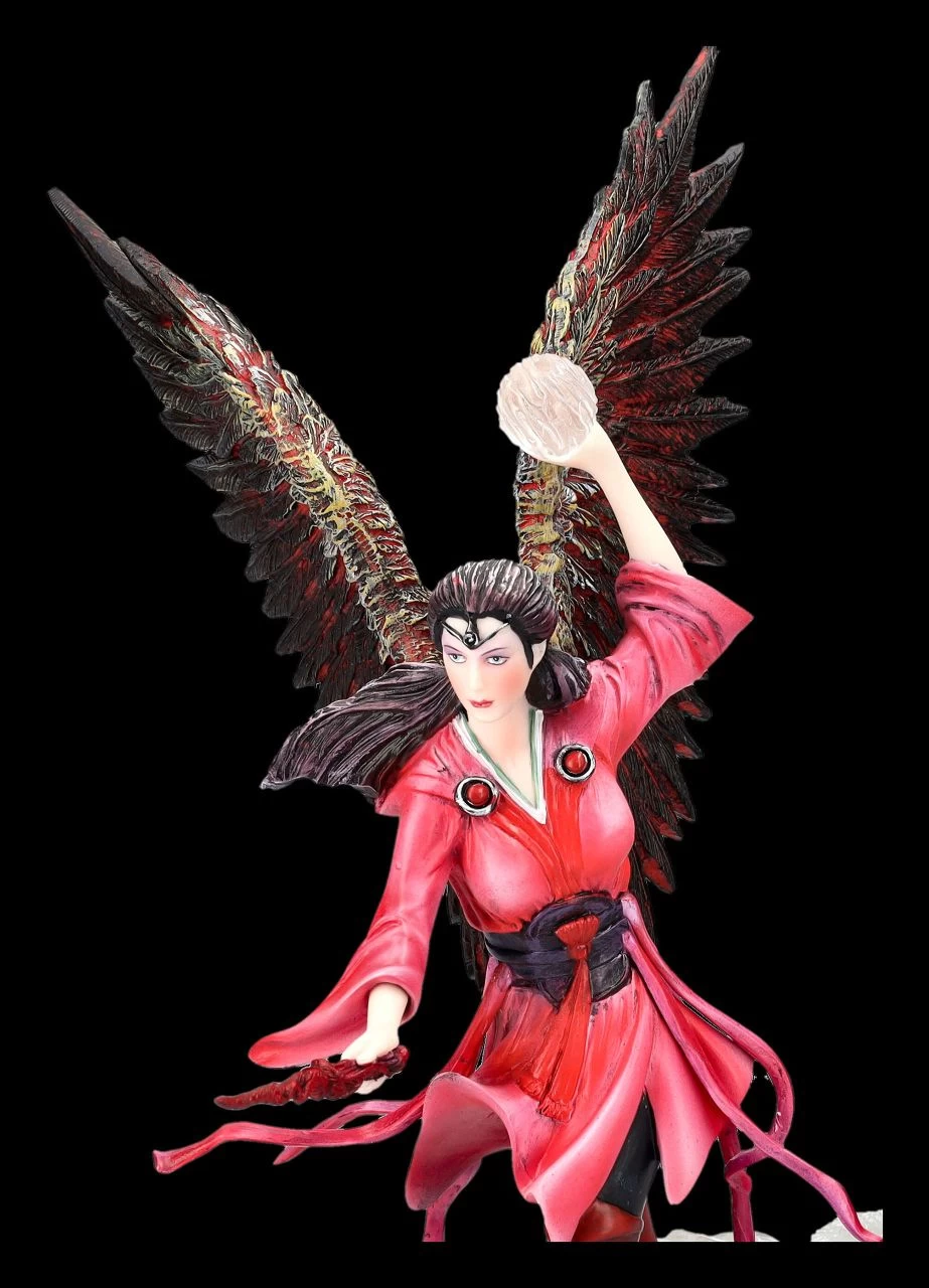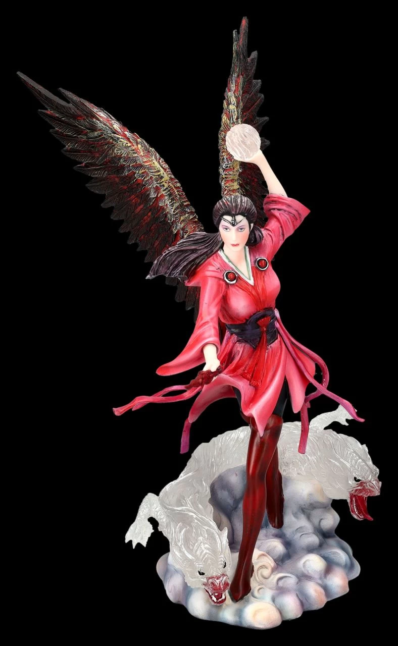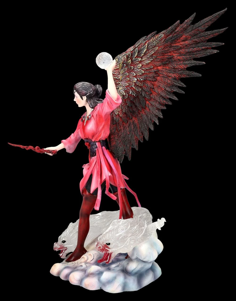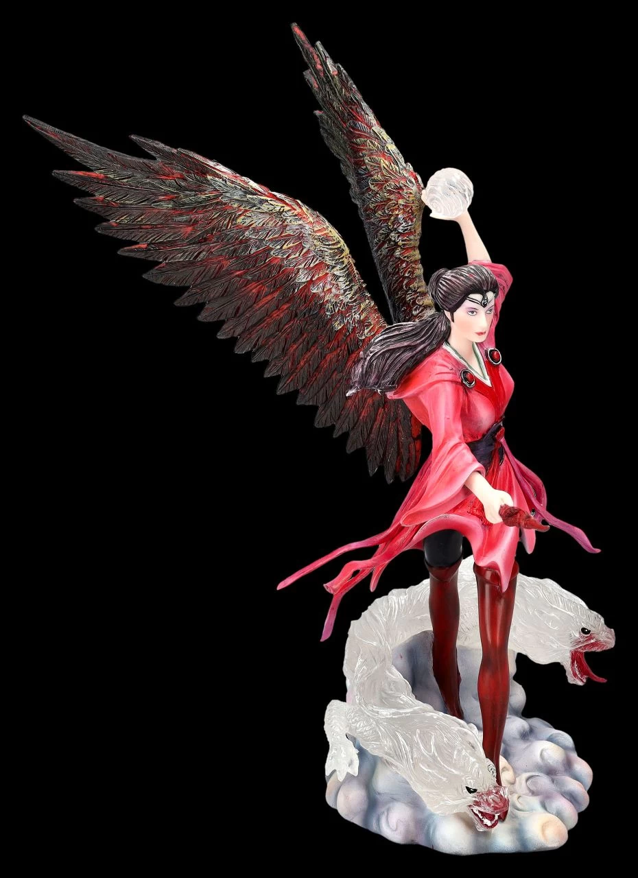In ihrem feuerroten Kleid und mit den riesigen rot schwarzen Flügel, die nur an der Oberkante einen hellen Schein aufweisen, wirbelt die große Magierin durch die Lüfte. In der linken hoch erhobenen Hand hält sie bedrohlich ihre Zauberkugel, als würde sie sie direkt auf die Menschheit werfen wollen. Begleitet wird die Magierin von zwei beinahe durchsichtigen Drachen, mit denen sie auf einer weißen Wolke durch die Lüfte schwebt. Die Magierin ist wieder eine wunderbar fantasievolle Arbeit der berühmten Fantasykünstlerin Anne Stokes. Wie das Element Luft wirkt es völlig leicht, wie sie mit ihren langen Beinen in den roten Strümpfen auf der Wolke balanciert. Die fantastische, 27 cm hohe, 17 cm breite und 20 cm tiefe Figur der Magierin ist aus hochwertigem Kunststein (Polyresin) gefertigt und sorgfältig und detailreich von Hand bemalt. Die großen Flügel sind zum Stecken. Obwohl Menschen, die in den Sternzeichen Zwillinge, Waage und Wassermann geboren sind und denen das Element Luft zugeordnet wird, als sehr ausgewogen und optimistisch bezeichnet werden, scheint die Wolke und auch die beiden Drachen eher ein Gewitter anzukündigen. Diese temperamentvolle Magierin wird alle Blicke auf sich ziehen und ist auch für Menschen, die in diesen Sternzeichen geboren sind, ein fantastisches Geschenk und kommt inklusive eines toll bedruckten Geschenkkartons.