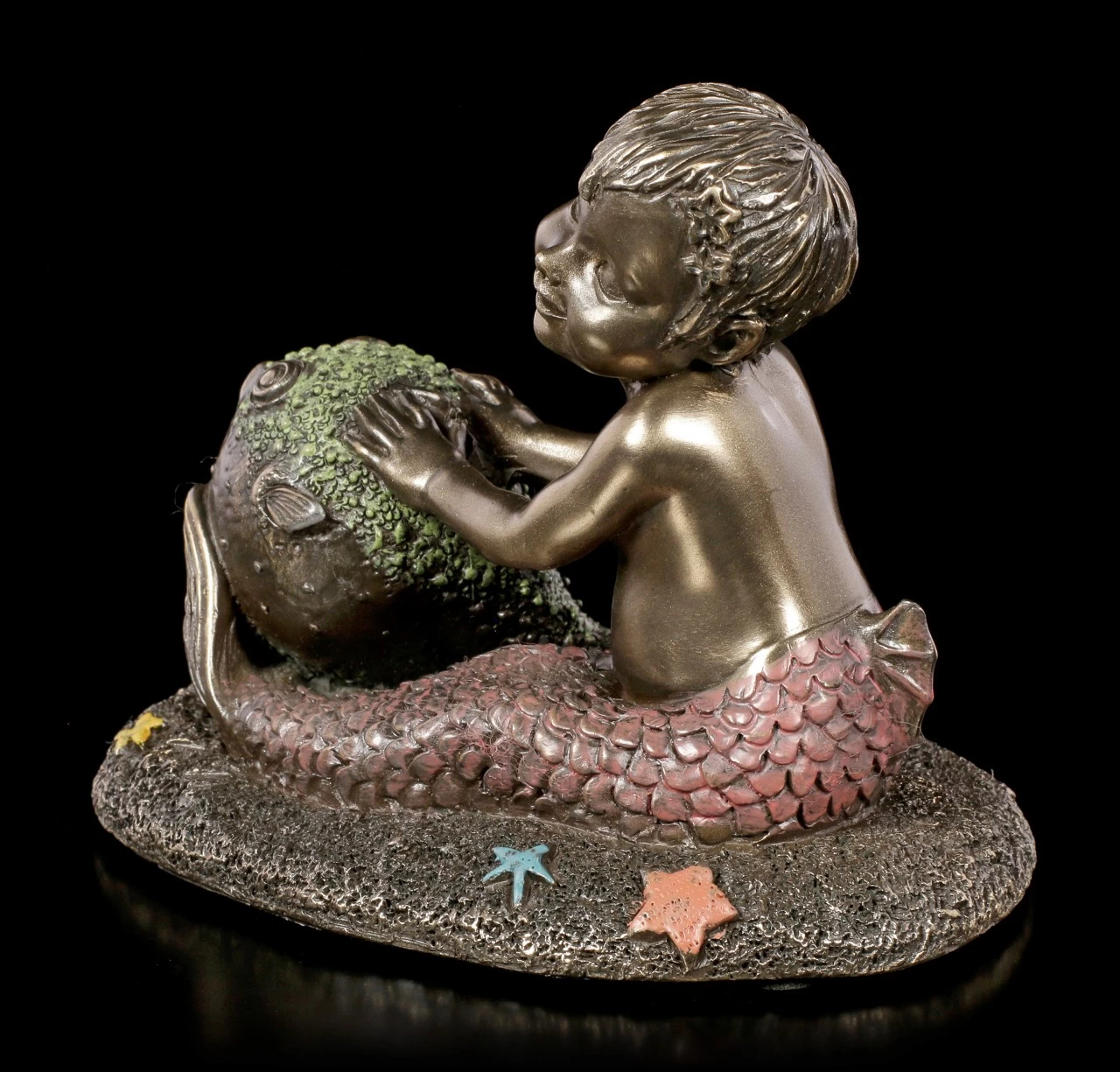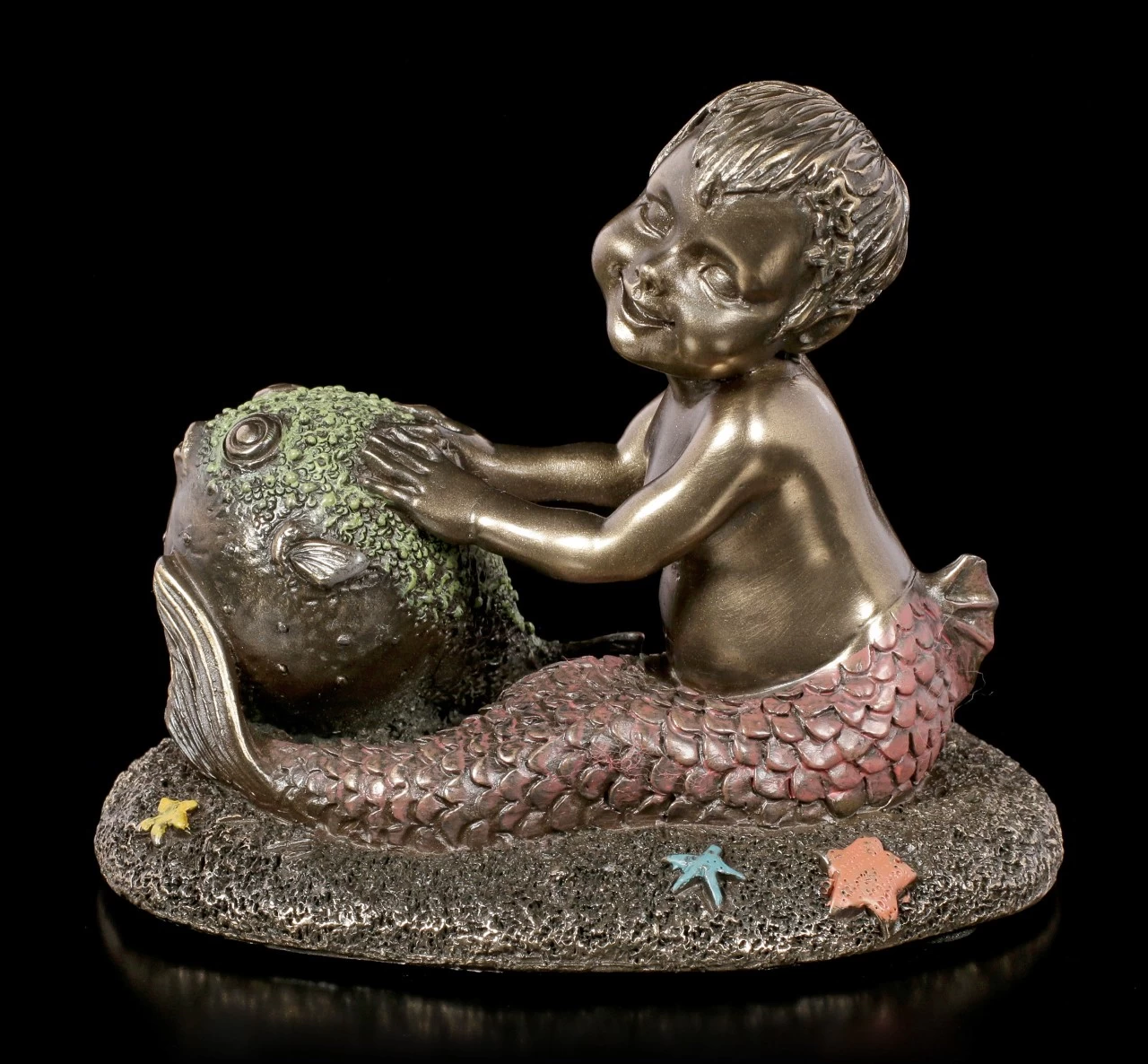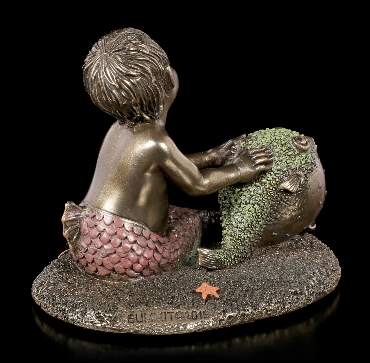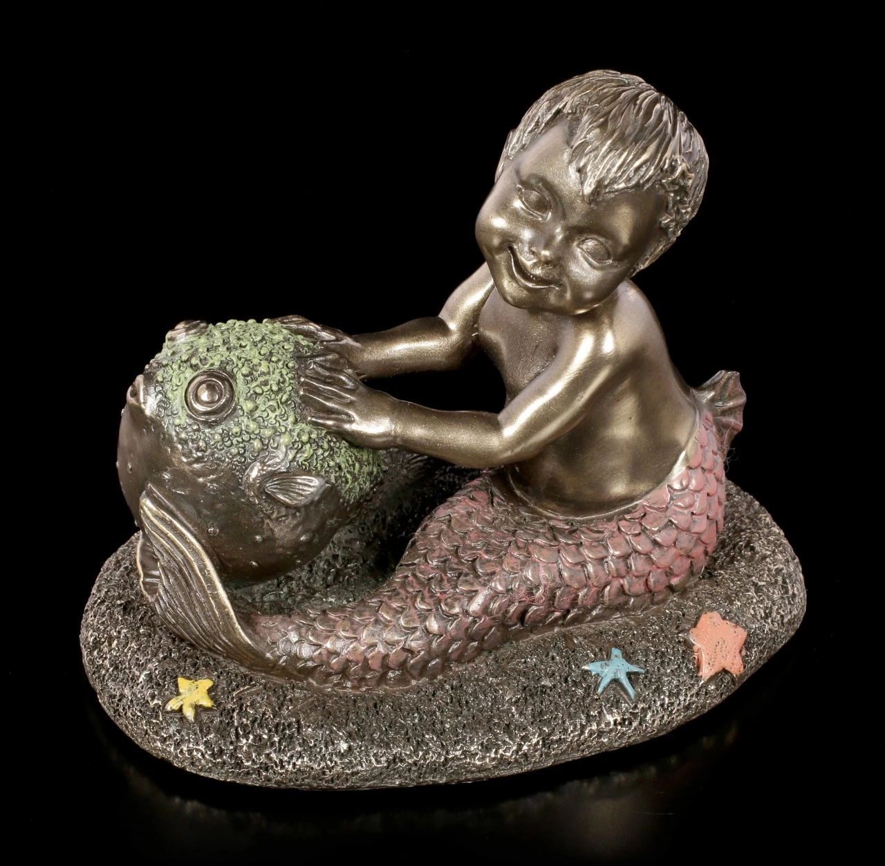 Das kleine Meereskind hat einen neuen Freund gefunden. Der kleine Kugelfisch ist nicht nur ein treuer Begleiter, auch als Ball ist er natürlich perfekt wenn er sich aufgepumpt hat. Die bronzierte und colorierte Kunststein (Polyresin) Figur ist für jeden Sammler von Meerjungfrauen ein Must Have.