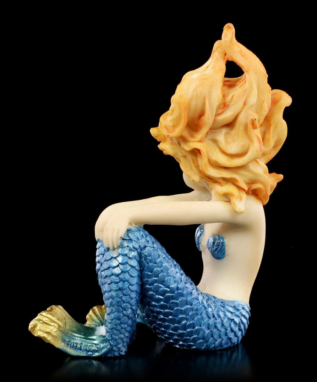 Ilaja sitzt lächelnd im weichen Sand tief unten im Meer und wartet auf ihre Freunde. Die kleine Nixe wurde handbemalt und sehr detailliert ausgearbeitet.