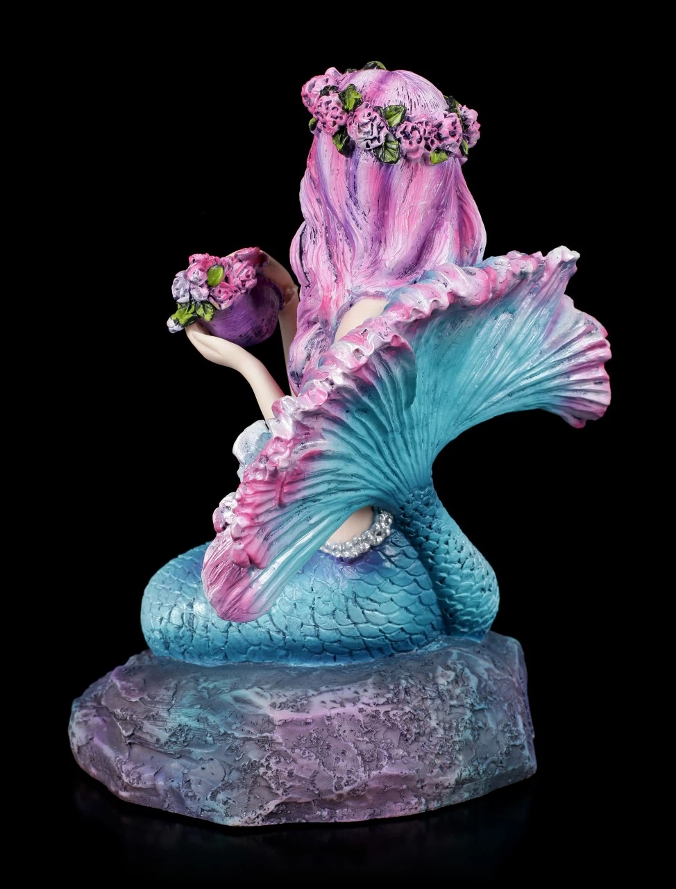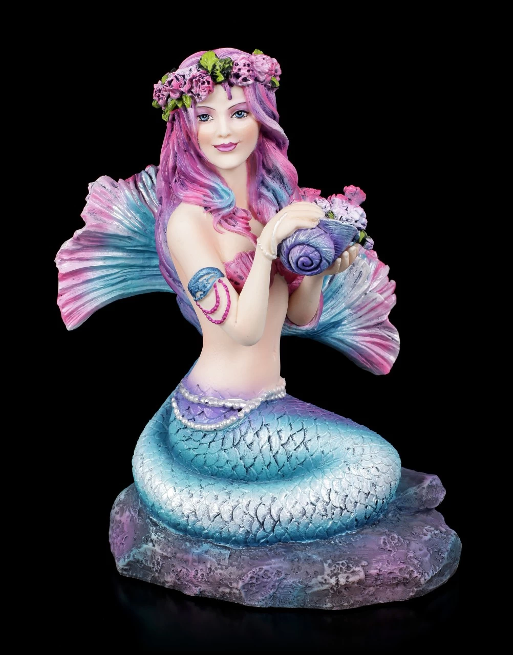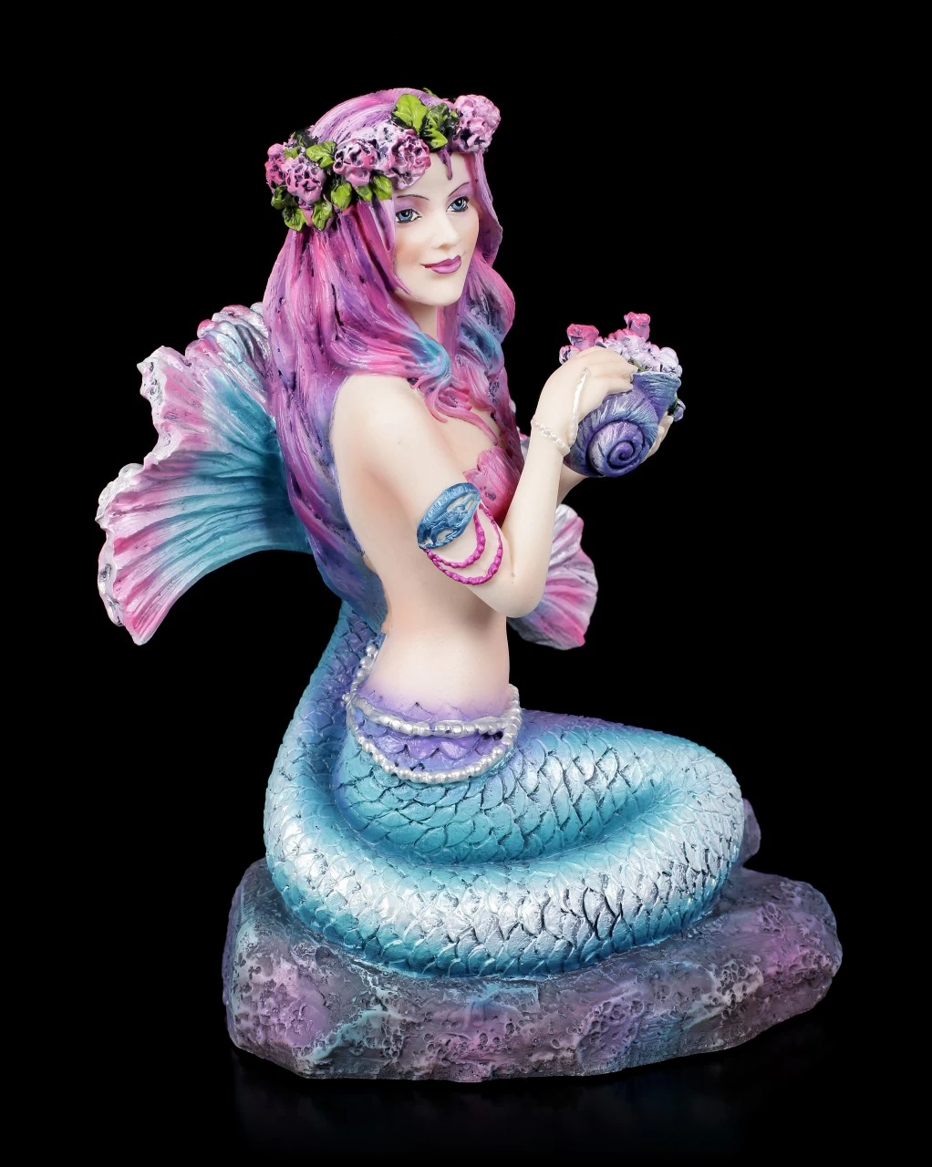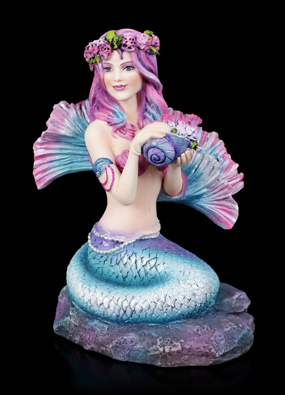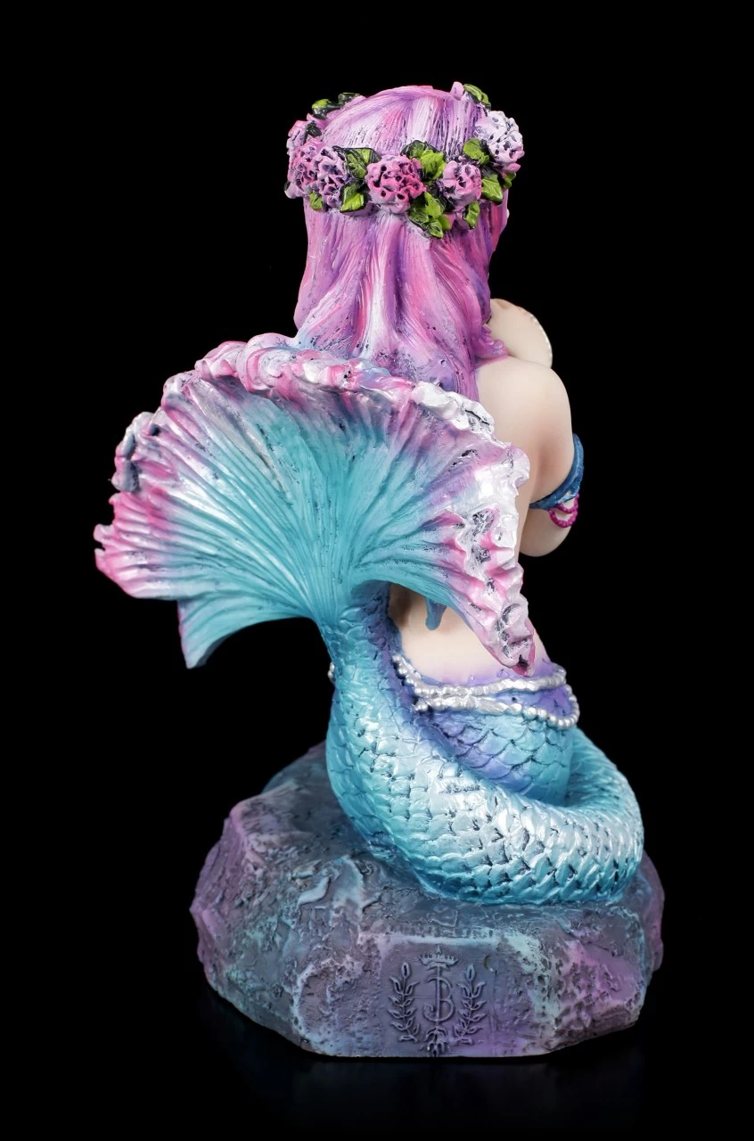 Die außergewöhnliche Meerjungfrau Spring Flowers von der Künstlerin Brigid Ashwood wird Sie verzaubern. Lassen Sie sich beim Betrachten der detailreich handbemalten Meerjungfrauen-Figur aus Kunststein (Polyresin) tief unter das Meer entführen. Die liebliche Meerjungfrau hat in einer Muschel ein paar Meeresblumen gepflanzt, damit sie sich daraus einen Haarkranz flechten kann und sie freut sich sichtlich über ihren schönen Haarschmuck..