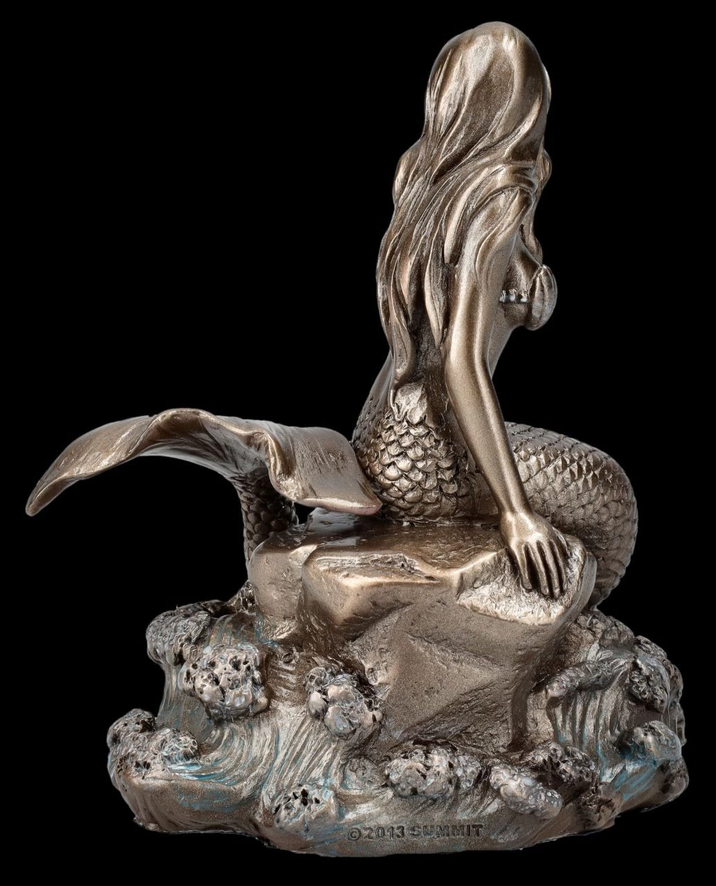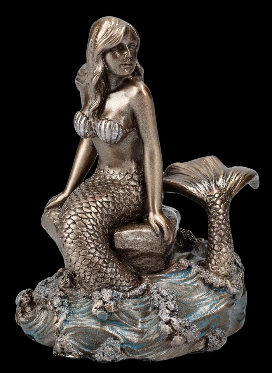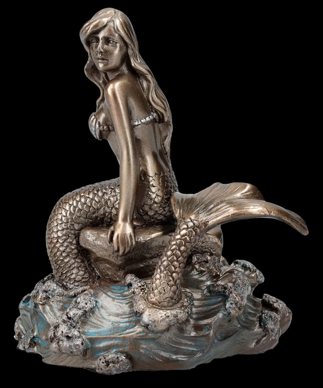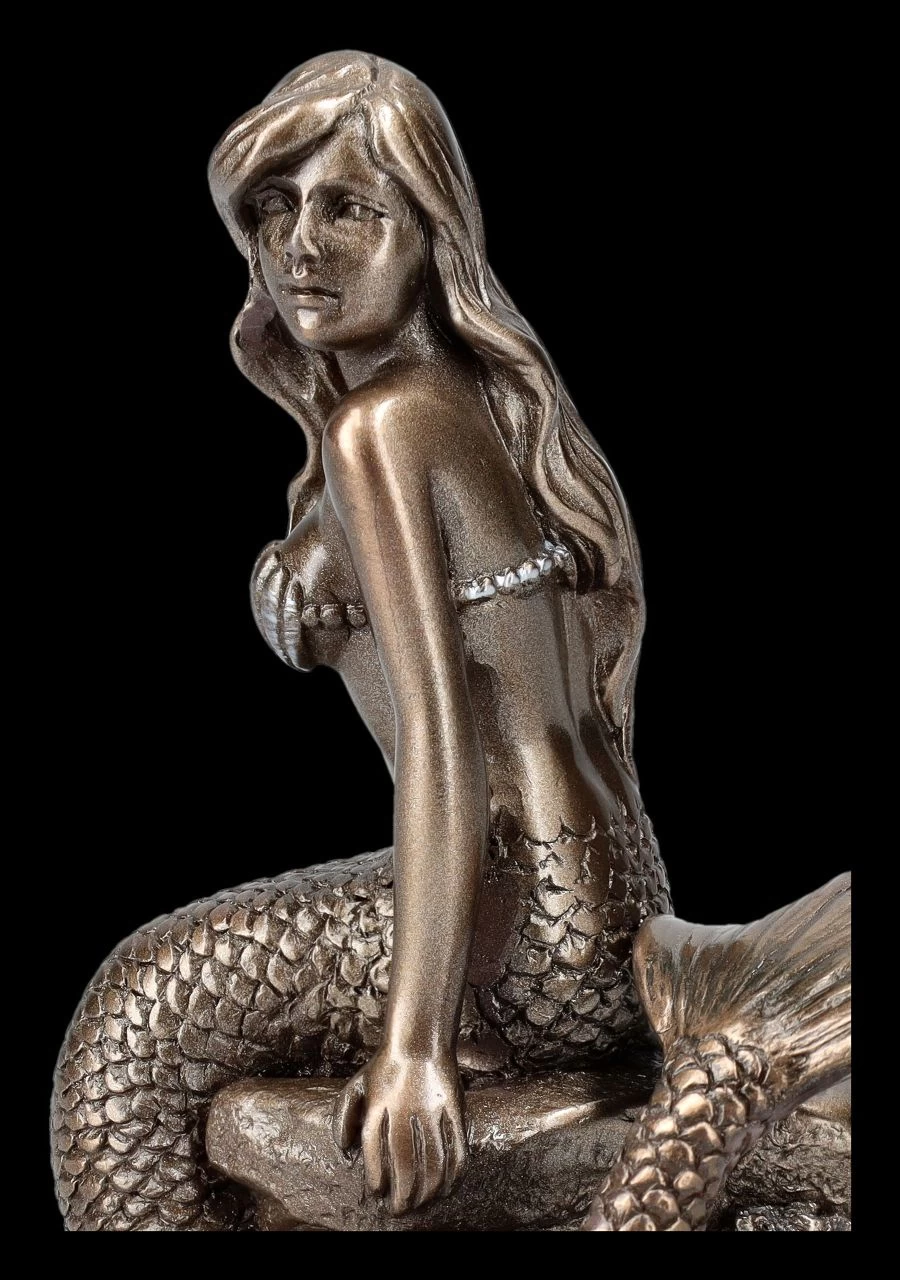 Unda, die kleine Meerjungfrau ist aus dem Meer aufgetaucht und sitzt nun auf einem Felsen im Mondschein. Sie liebt die Sterne und wie die Wolken am Himmel vorbei ziehen. Die anmutige bronzierte und colorierte Figur aus Kunststein (Polyresin) ist das perfekte Geschenk für einen Liebhaber der maritimen Fabelwesen.