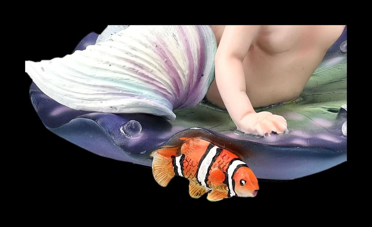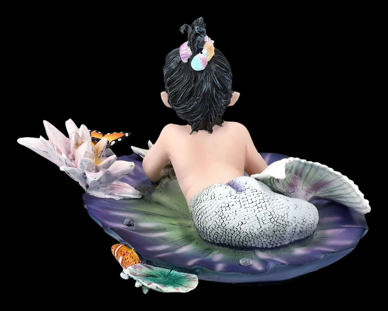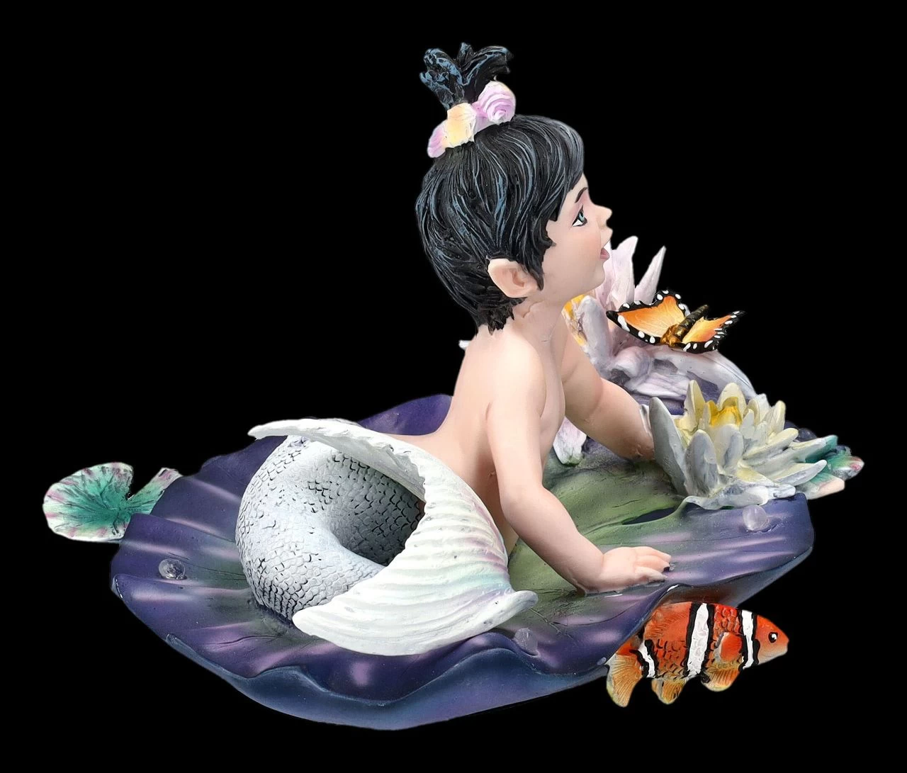 Der kleine Meerjunge ist aus dem Kindergarten in den Tiefen des Sees entwischt und zum ersten Mal alleine zwischen den Seerosen aufgetaucht. Die Augen strahlen vor Begeisterung. Diese niedliche Meerjungfrauen Figur wurde von Sheila Wolk geschaffen. Die amerikanische Fantasykünstlerin hatte sich nach ihrer Tätigkeit als medizinische Illustratorin, in der sie ihre Fähigkeit, Bewegung und menschliche Form darzustellen perfektionierte, auf die mythische Welt der Meerjungfrauen und Feen eingelassen. Sie zeigt die Fantasiewelt in ihren Arbeiten sehr realistisch und menschlich, wie man an diesem niedlichen Baby Meerjungen sofort erkennen kann. Die liebevoll handbemalte, 9,5 cm hohe, 15,5 cm breite und 13,5 cm tiefe Meerjungfrauen-Figur wurde detailreich aus Kunststein (Polyresin) gefertigt. Sie ist ein perfektes Geschenk für alle die es lieben, in die Welt der Fantasie einzutauchen.