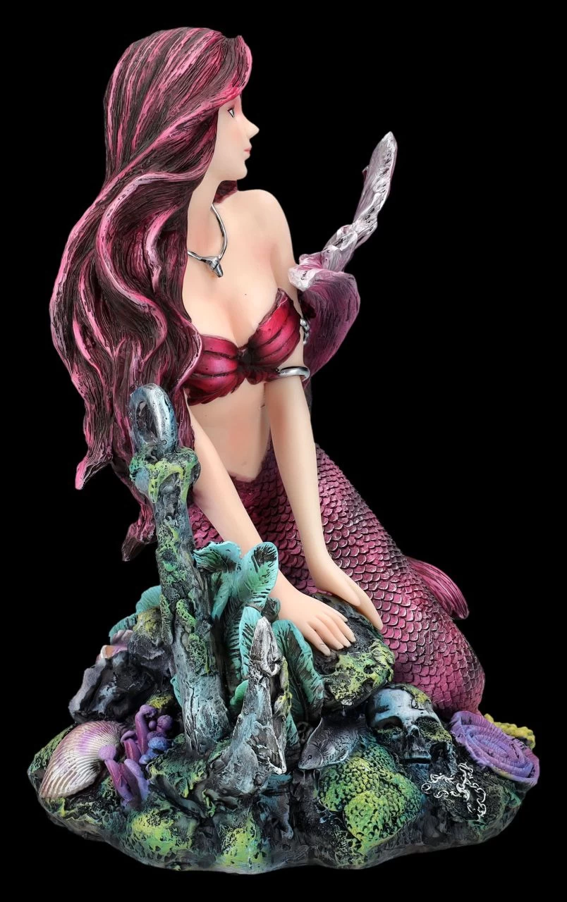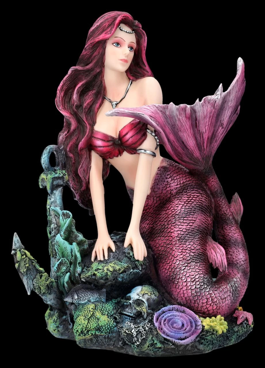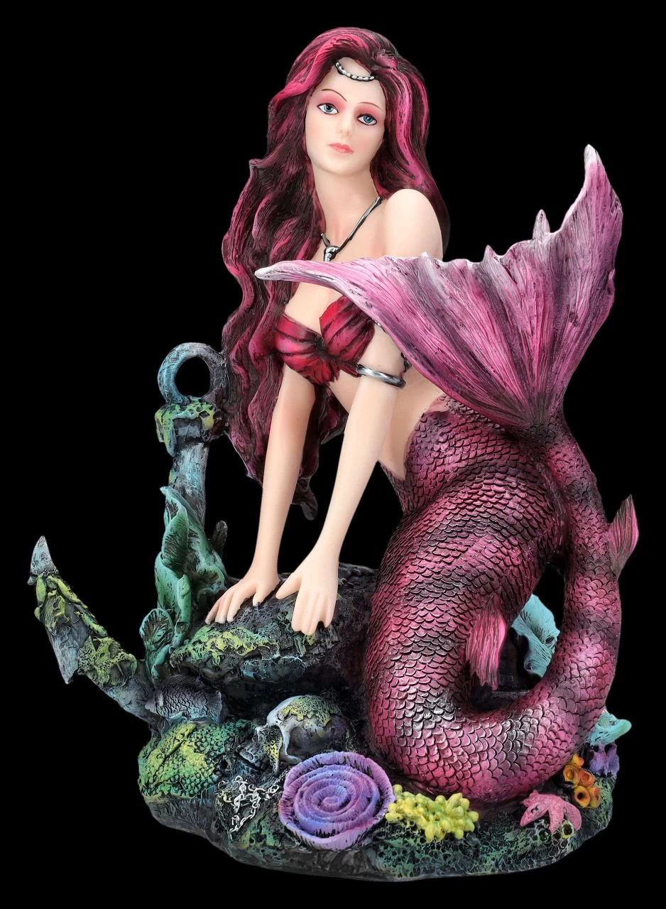 Kein Wunder, dass Meerjungfrauen für den einen oder anderen Seemann gefährlich werden können. Denn wer der wunderschönen Morana begegnet, fühlt sich vielleicht in Versuchung, ihr auf den Meeresgrund zu folgen. Wie es vermutlich auch dem Seemann ergangen ist, dessen Schädel neben einem losgerissenen Anker auf dem Grund des Meeres liegt. Morana mit den langen roten Haaren, die sich auf dem Meeresgrund auf einen Felsen ausruht, sieht einfach bezaubernd aus. Die 20 cm hohe, 13,5 cm breite und 12 cm tiefe Meerjungfrauen-Figur ist aus hochwertigem Kunststein (Polyresin) und wurde liebevoll von Hand bemalt. Im Bad oder auch zwischen den Pflanzen auf der Blumenbank wird die schöne Morana auf dem Meeresgrund garantiert zum sofortigen Blickfang und ist damit für alle, die das Meer und seine mystischen Bewohner lieben, auch ein perfektes Geschenk.