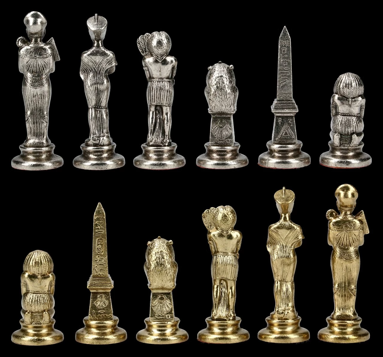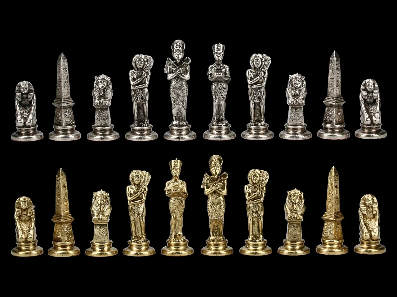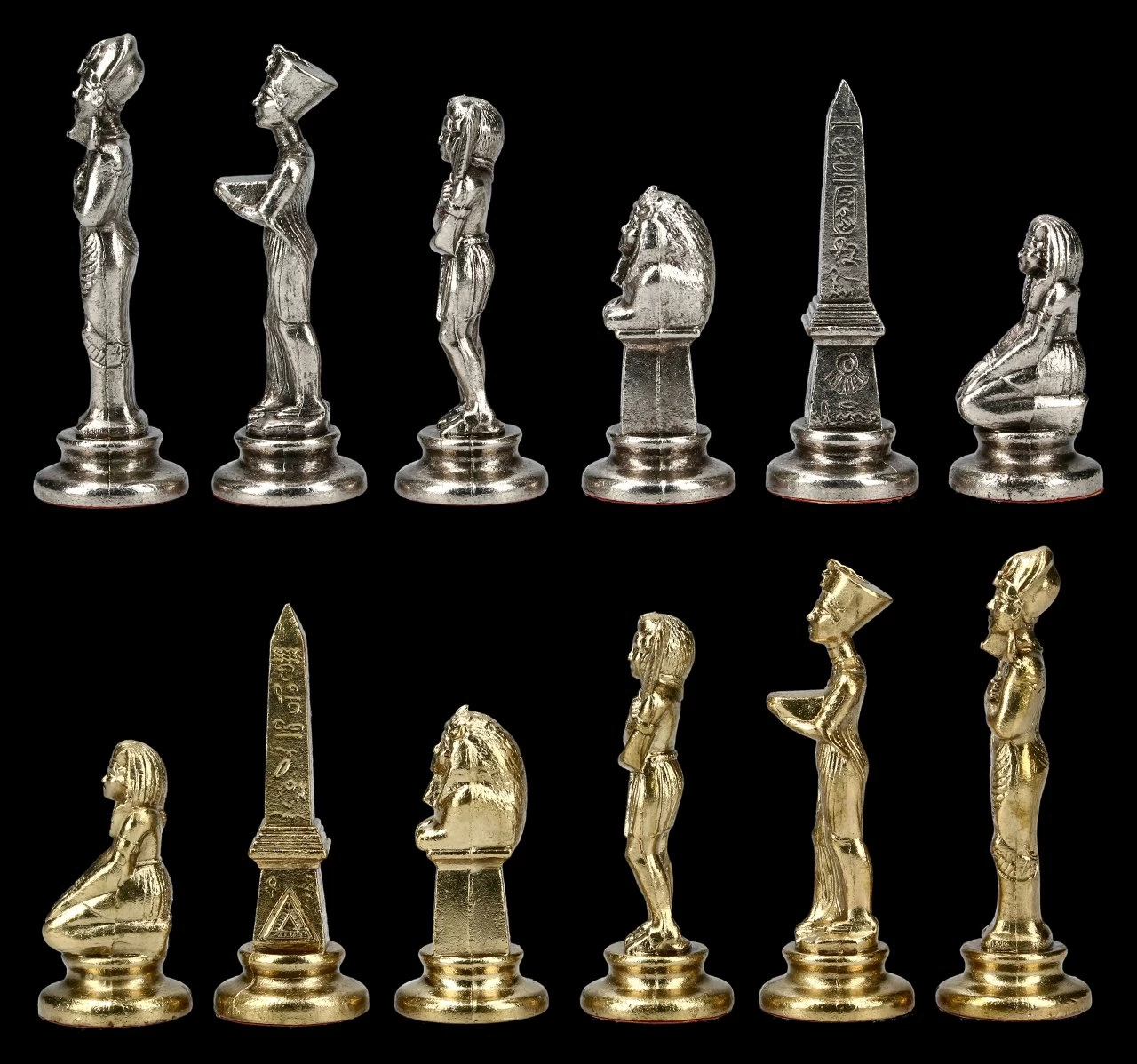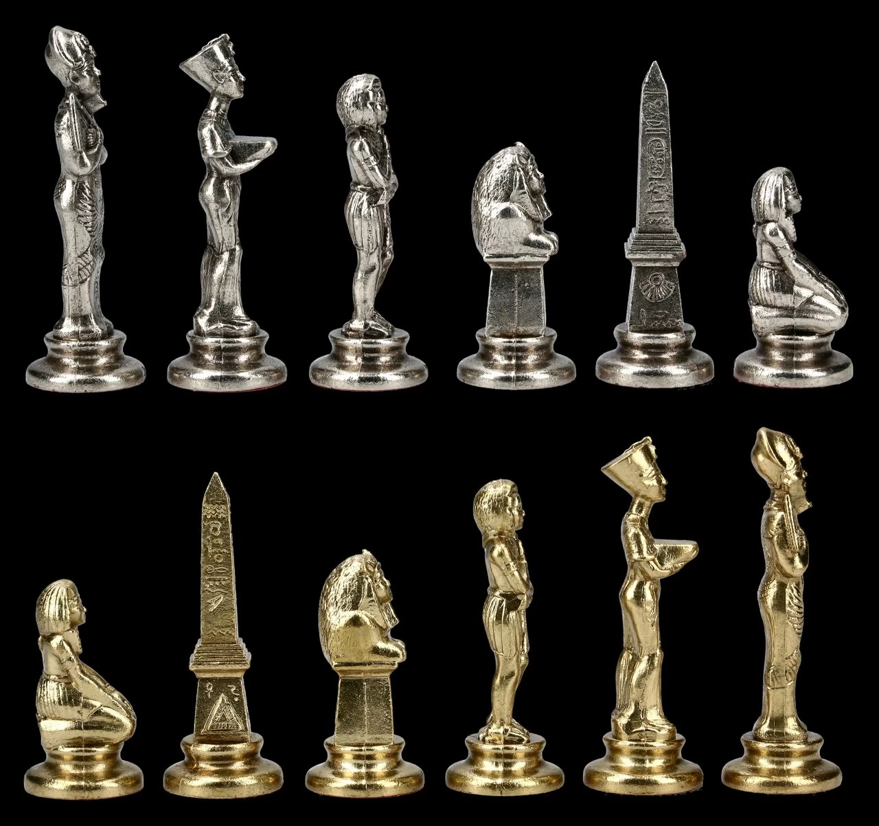 Sehr edel sehen diese wunderschön und fein gestalteten ägyptischen Schachfiguren aus Metall aus. 32 sorgfältig in Gold und Silber handbemalte Spielfiguren zeichnen dieses fantastische Schachfiguren Set aus. Die schönen Schachfiguren dieses Sets mit den Figuren, die aus der Geschichte des Alte Ägypten bekannt sind, sind sehr fein aus Metall gefertigt.. Die Figuren der Pharaonen, Priester und Sphinxen, sowie der Stelen als Turm, sind von 5,5 – 9,5 cm hoch. Die Stellfläche hat einen Durchmesser von 3 cm. Nicht nur für Ägypten Fans unter den Schachspielern ist dieses wunderbare Schachfiguren Set ein edles Geschenk.