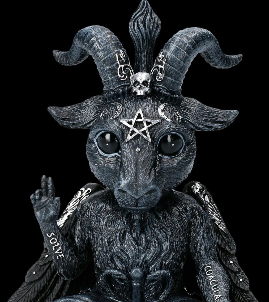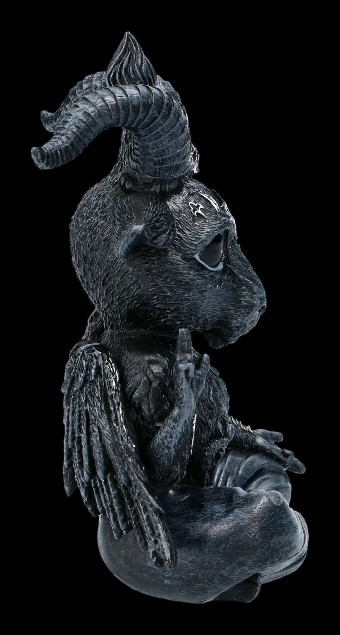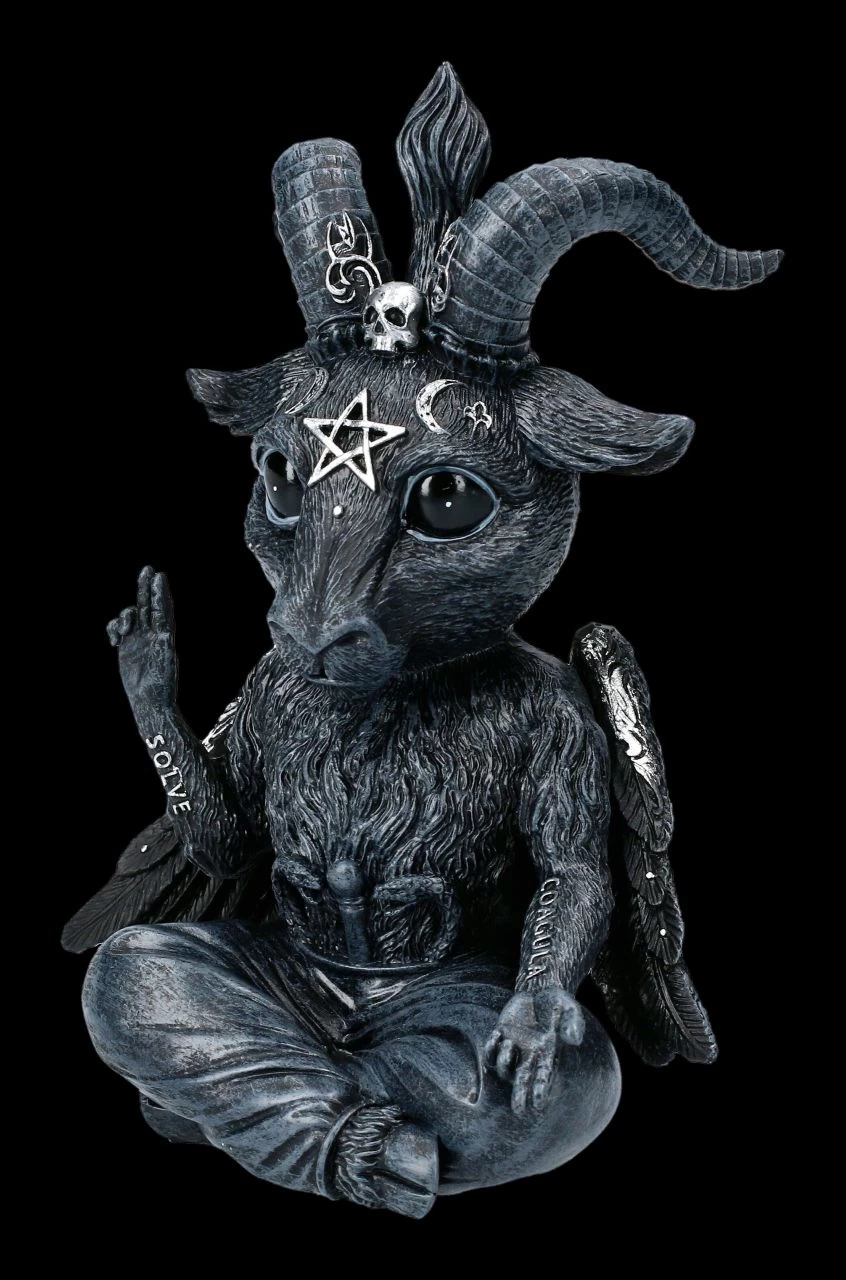 Mit seinen großen unschuldigen Augen sieht er richtig niedlich und ungefährlich aus, der kleine Baphomet Baphoboo – wäre da nicht das Tattoo mit der alchemistischen Formel ‚löse und verbinde‘ auf seinen Armen. Die 13 cm hohe, 10 cm breite und 6 cm tiefe Baphomet Figur Baphoboo ist liebevoll aus handbemaltem Kunststein (Polyresin) gefertigt. Für alle Sammler der Cult Cuties von Nemesis Now ist Baphoboo ein tolles Geschenk und kommt daher inklusive Geschenkkarton.
