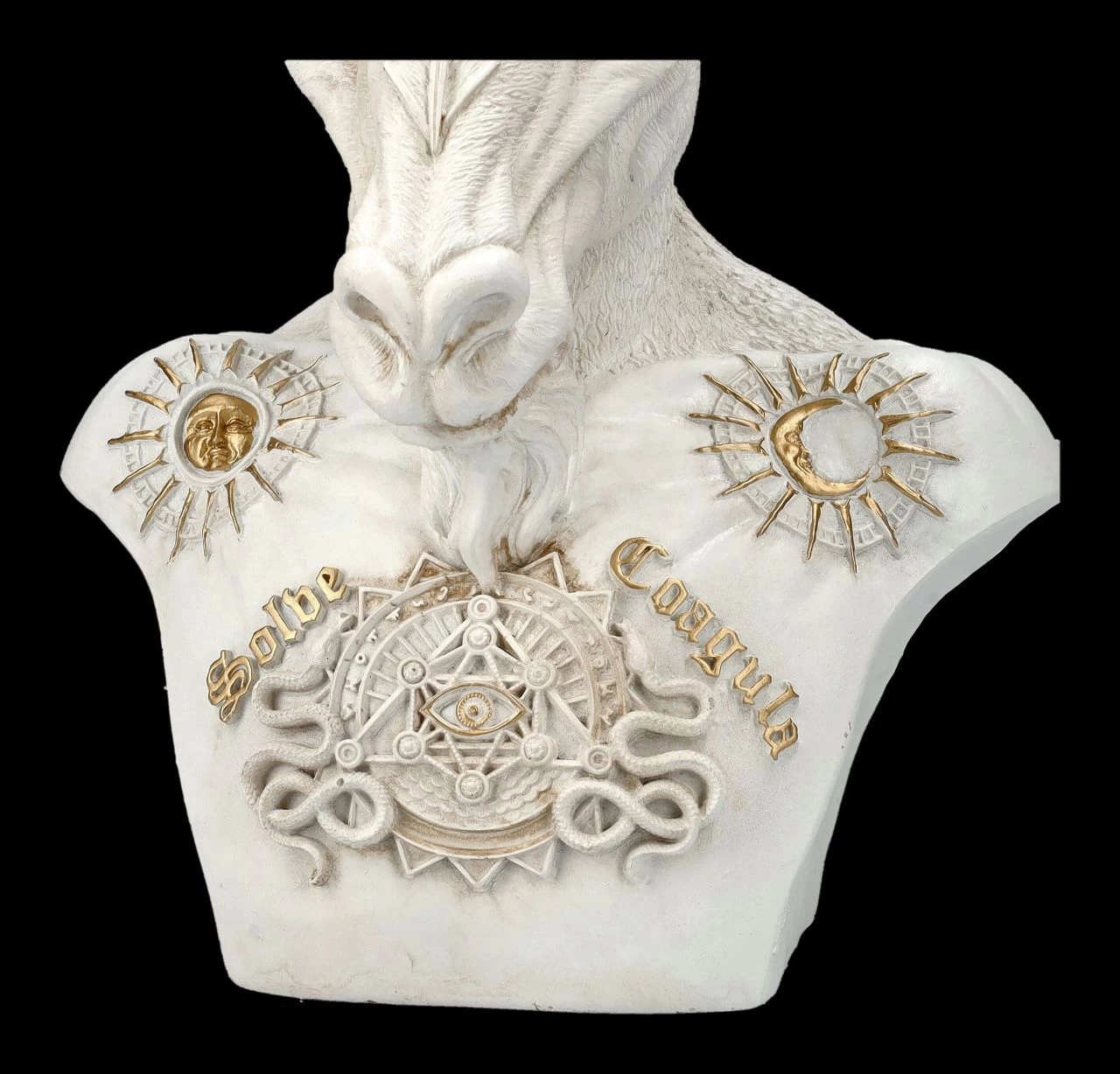 Faszinierend und edel ist diese weiße Büste des Baphomet mit den wenigen goldenen Akzenten in den zahlreichen Symbolen.‘ Löse und verbinde‘ – also füge es zu einem anderen Ganzen wieder zusammen – bedeutet die alchemistische Formel ‚Solve et coagula‘ über den Freimaurer-Symbolen auf der Brust der okkulten Baphomet-Figur mit dem Pentagramm auf der Stirn. Aber auch die Symbole der Zwillingsbrüder Cautes und Cautopates aus dem Mitraskult, wie der Morgen durch die Sonne und der Abend durch den Mond auf den Schulterblättern der Baphomet Büste lassen viele Deutungen zu. Schließlich vereint Baphomet Frau und Mann, Gut und Böse, Mensch und Dämon, Mensch und Tier. So ist es nicht verwunderlich, dass die Symbole aus allen alten Kulturen bekannt sind. Die schöne Baphomet Büste von Nemesis Now aus handbemaltem und detailreich gefertigtem Kunststein (Polyresin) mit der Höhe von 34 cm, der Breite von 30,5 cm und der Tiefe von 15 cm ist in ihrer zurückhaltenden Form- und Farbgebung ein magischer Blickfang