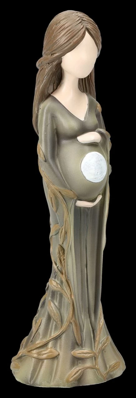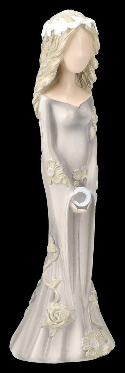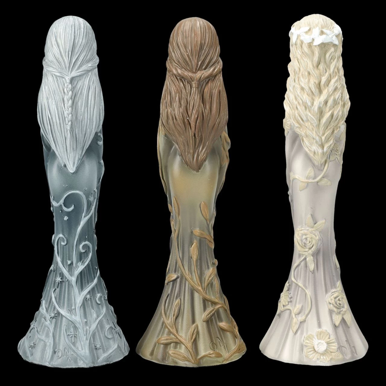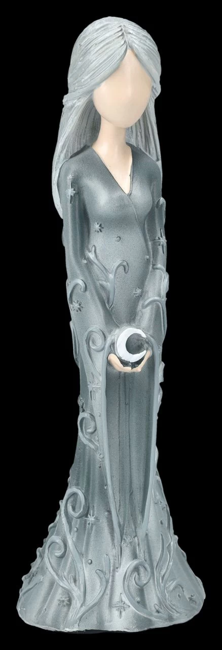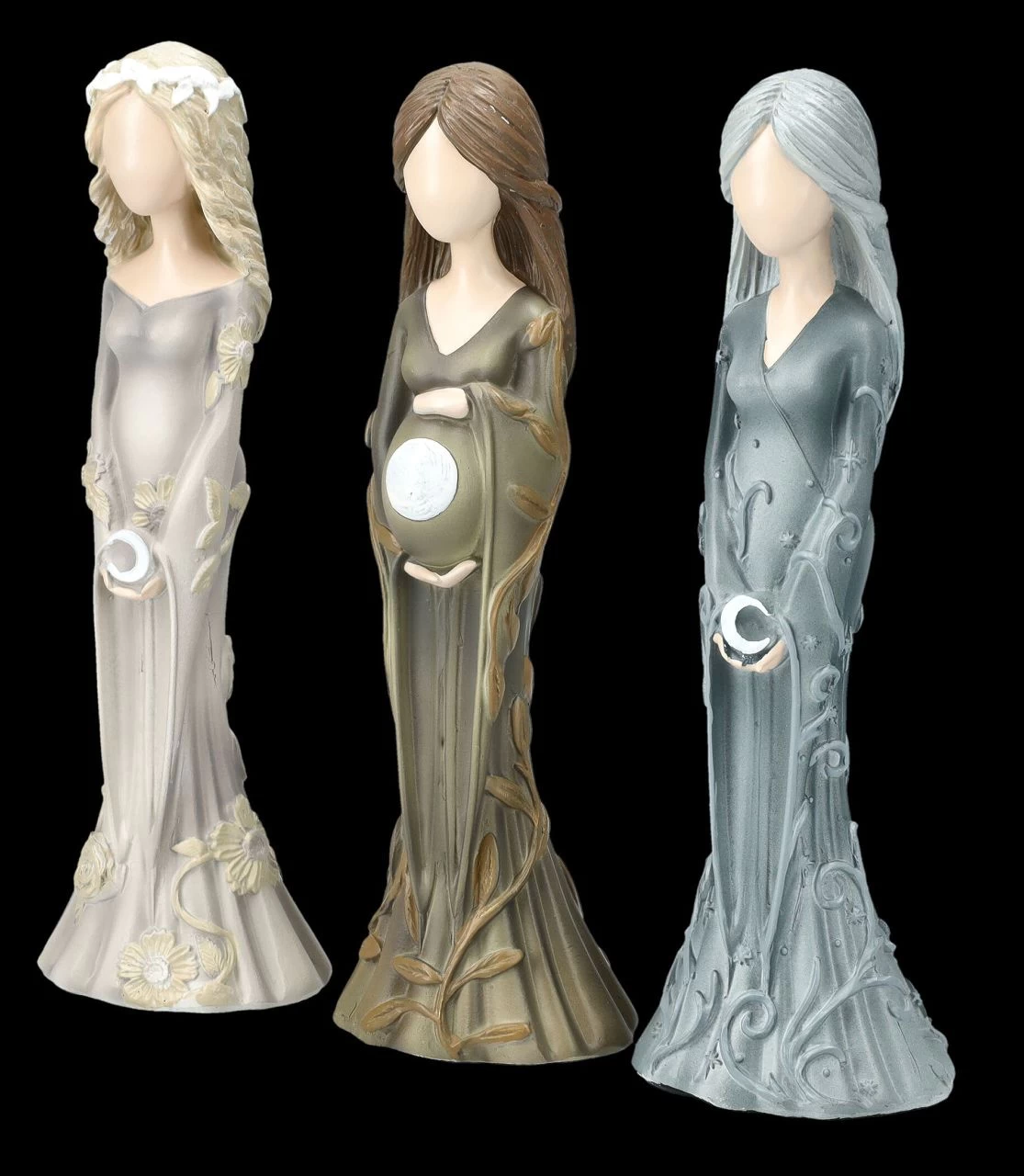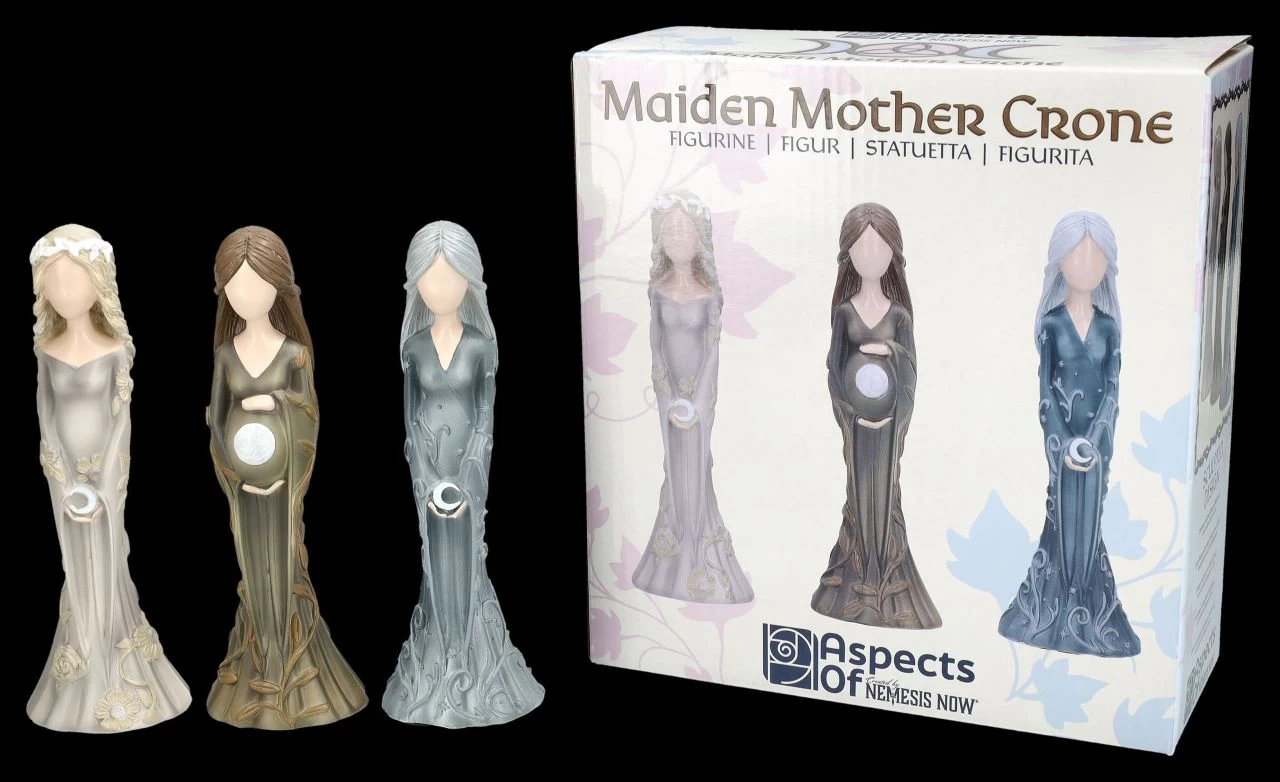 Die Dreifache Göttin, oder auch Mondgöttin, ist eines der wichtigen Symbole in der Wicca Spiritualität. Diese drei Wicca-Figuren aus handbemaltem Kunststein (Polyresin) zeigen die drei Aspekte von Jungfrau, Mutter und Altes Weib oder auch Weise genannt. Die Jungfrau wird mit langen blonden Haaren dargestellt, die den zunehmenden Mond in den Händen hält. Die Mutter hat lange braune Haare und hält ihren schwangeren Bauch mit dem Vollmond zärtlich umfasst und die Greisin mit den weißen Haaren trägt den abnehmenden Mond in ihren Händen. Die drei Figuren von Nemesis Now sind je 15 cm hoch, je 5 cm breit und je 4,5 cm tief. Sie sind in ihrer zurückhaltenden Darstellung ein zauberhaftes und magisches Geschenk und kommen mit einem bedruckten Geschenkkarton.