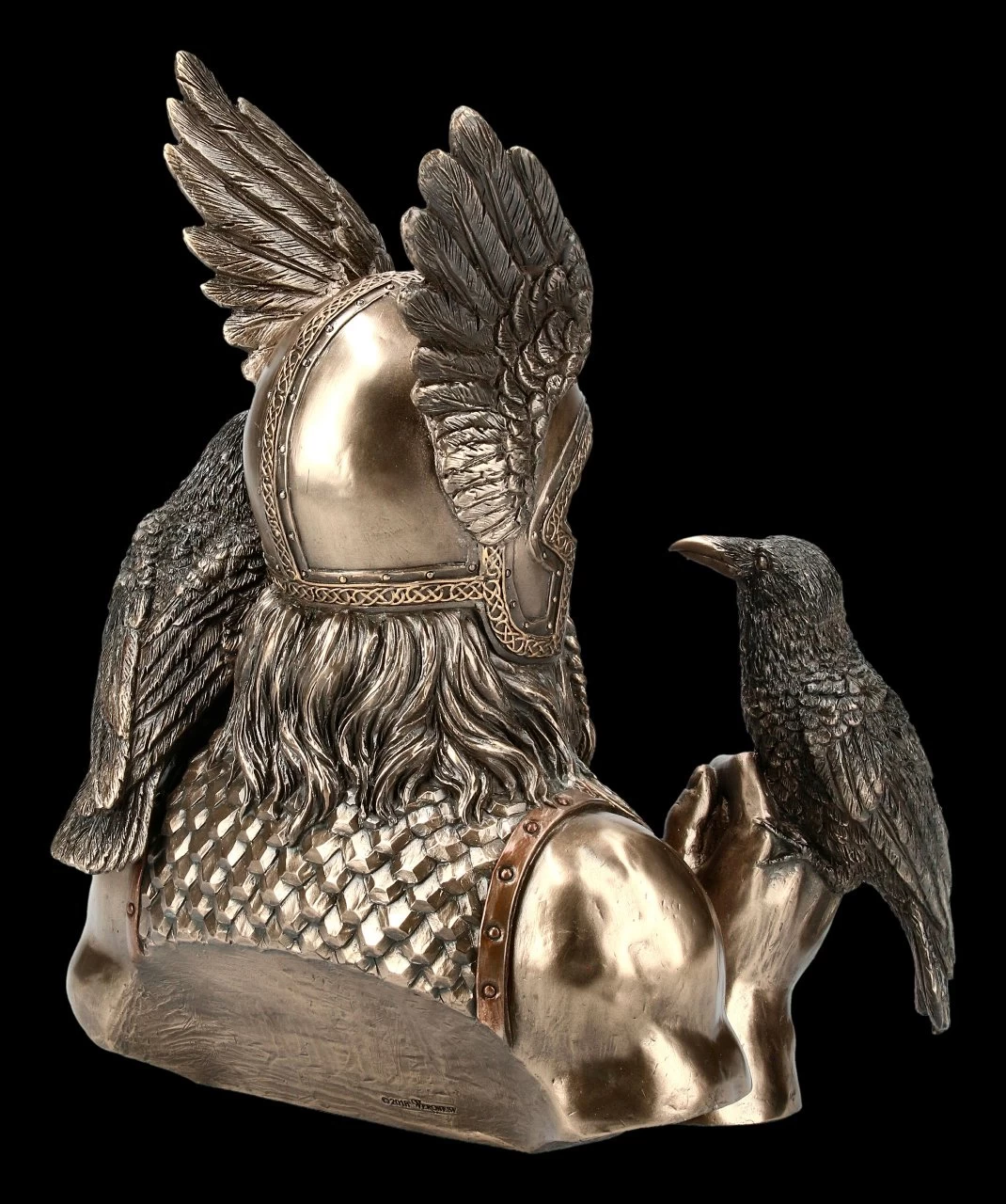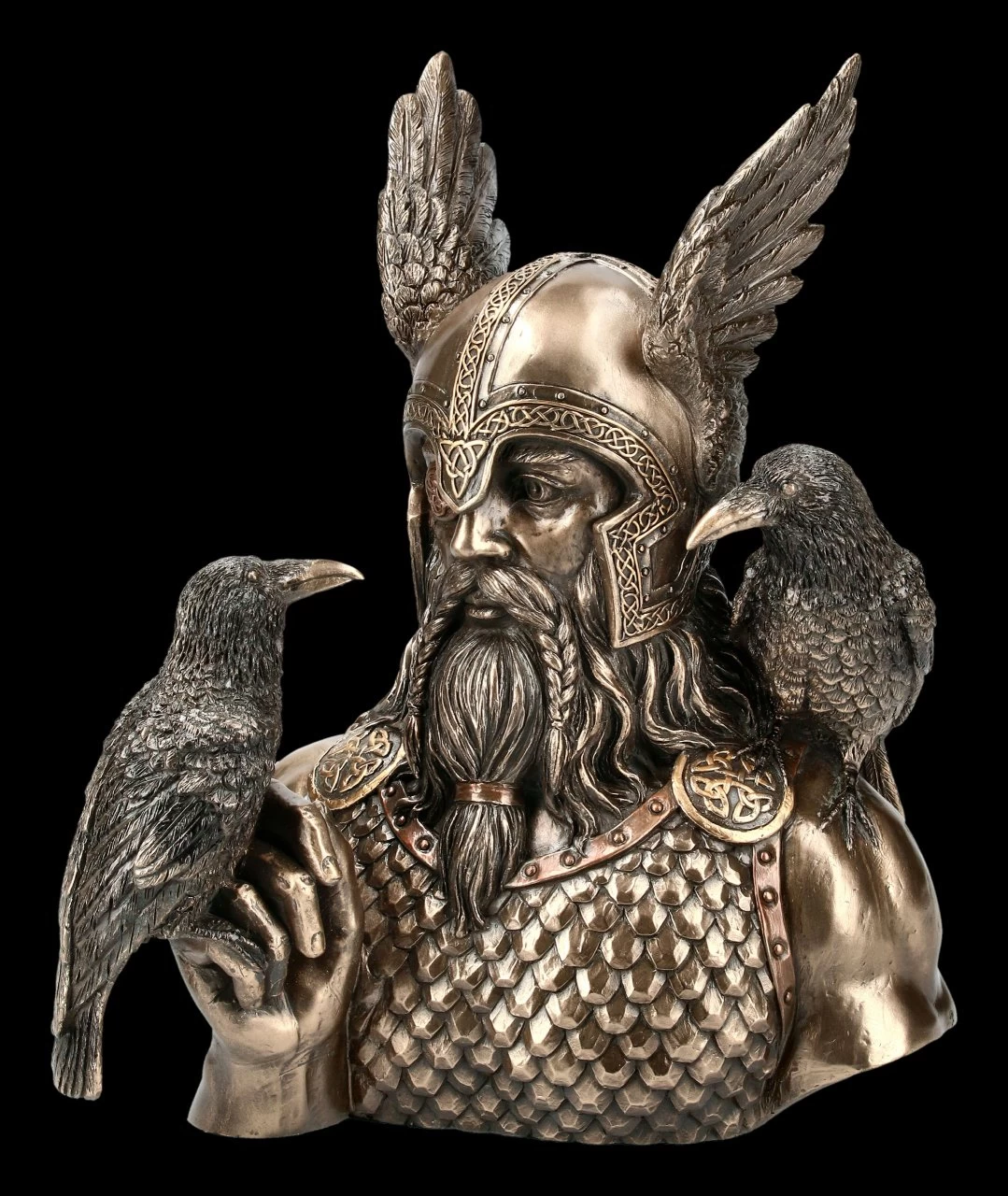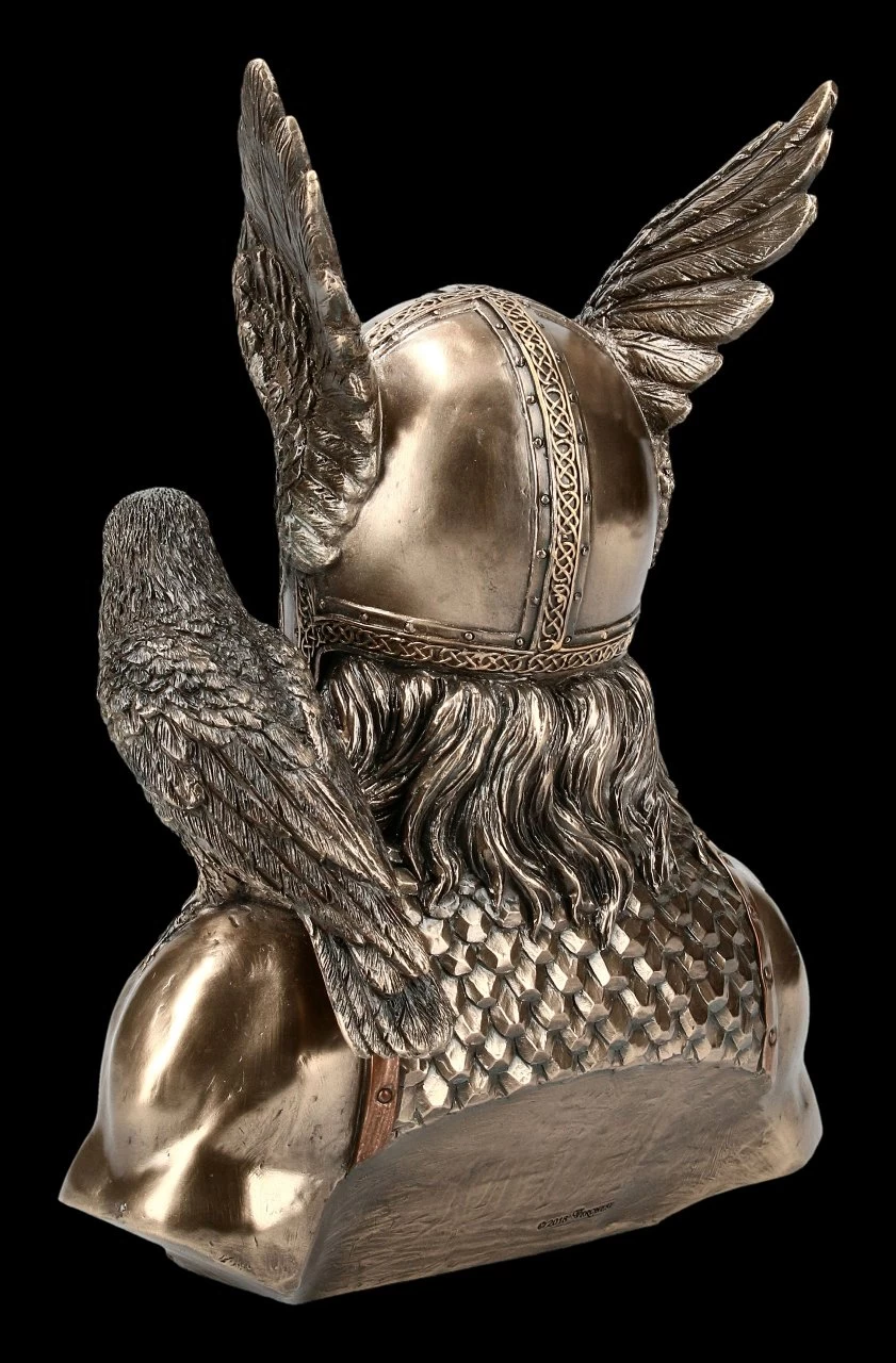 Begleitet von den Raben Hugin und Munin – der Erinnerung und dem Gedanken – zeigt sich hier Odin, der Allvater. Ernst blickt er auf den Raben, der auf seiner Hand Platz genommen hat und lauscht aufmerksam den Ratschlägen. Die bis zu dem geflügelten Helm umwerfend detailreiche und edel bronzierte und colorierte Kunststein (Polyresin) Büste des nordischen Gottes stammt aus der Studio Collection von Veronese. Sie sollte bei keinem Wikinger fehlen.