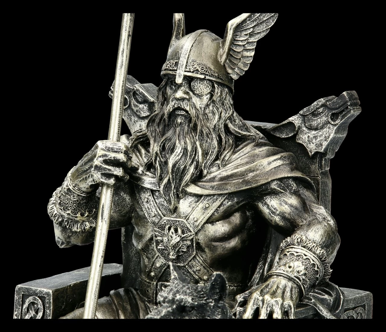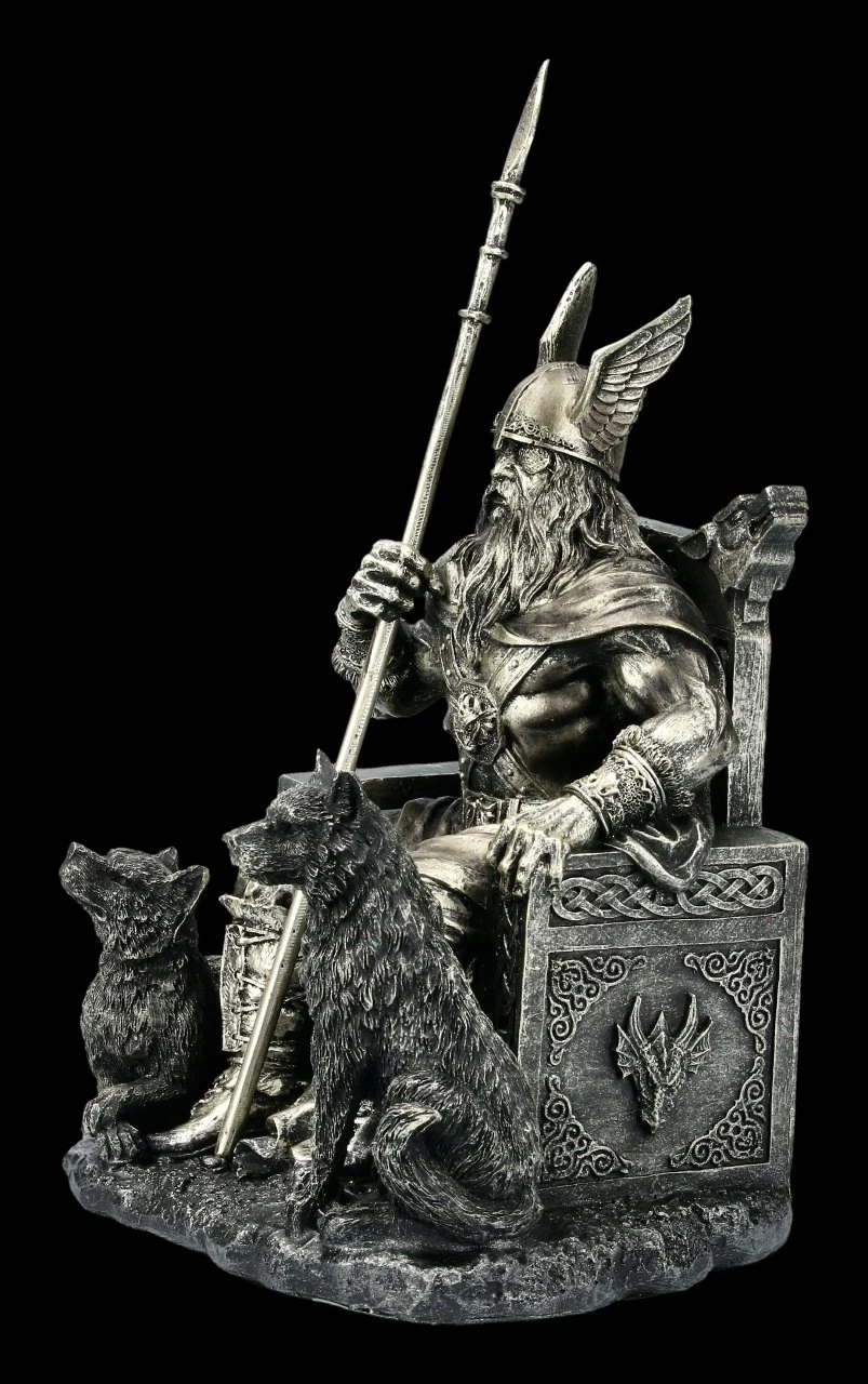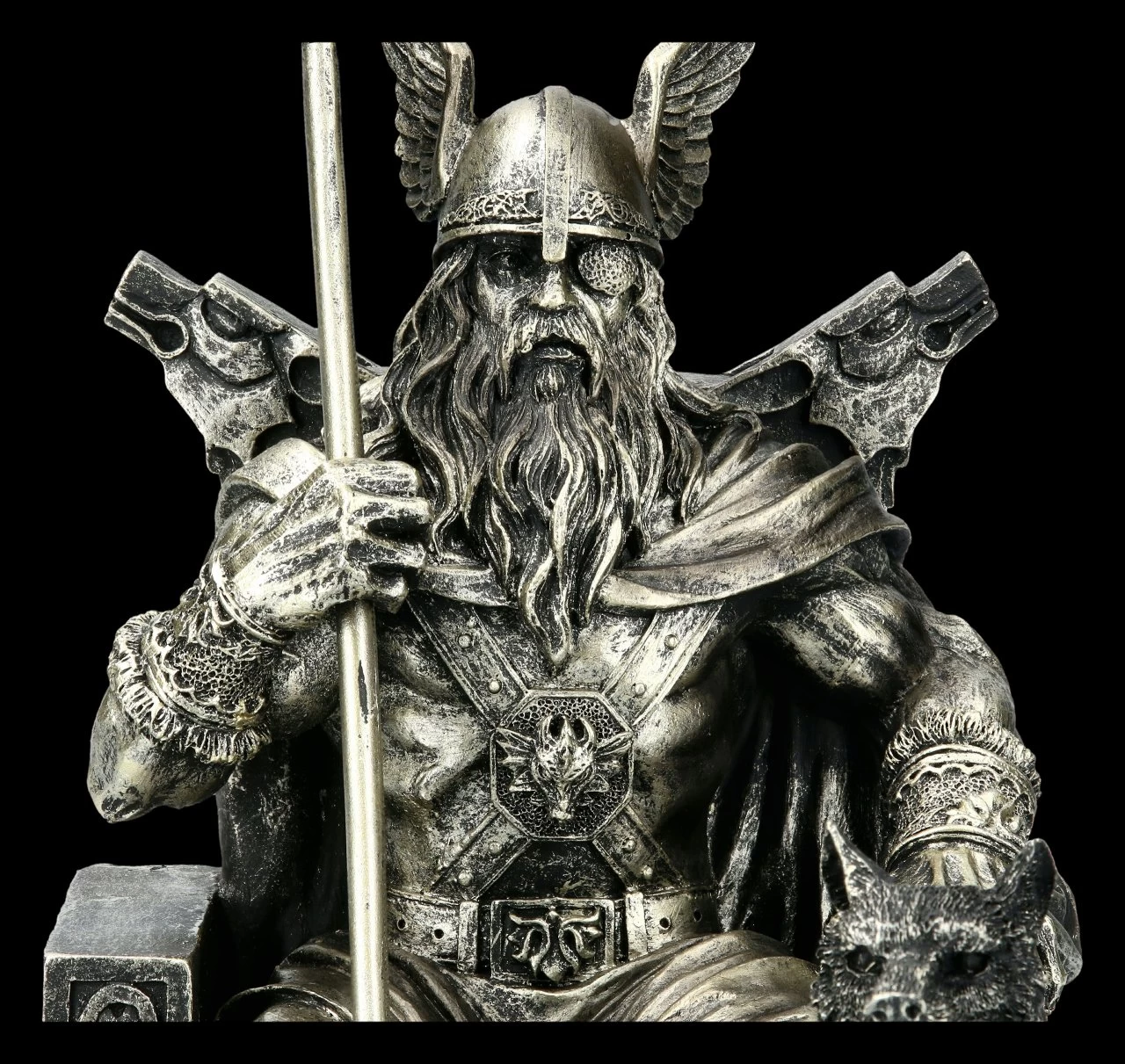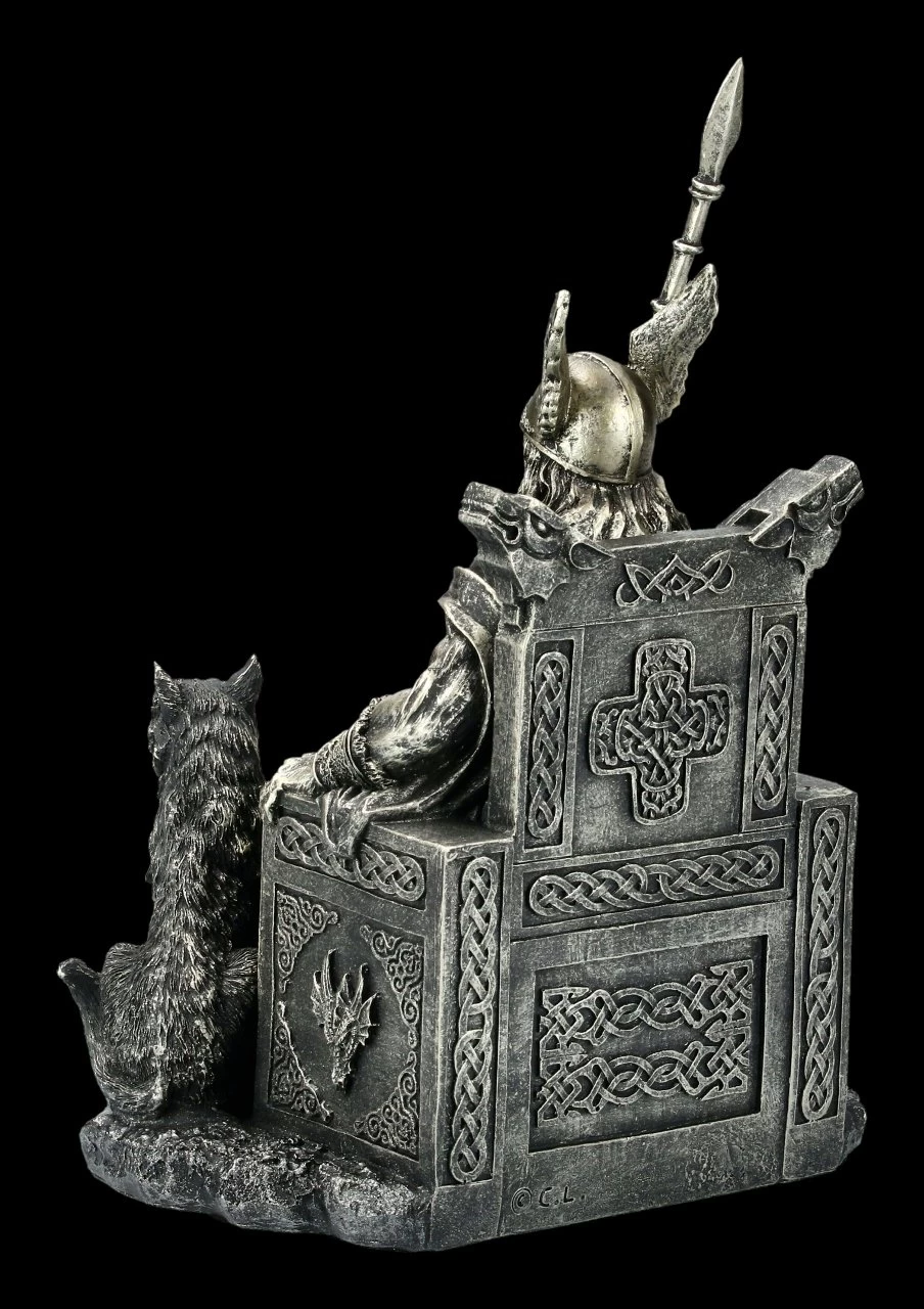 Erhaben und ehrfurchtgebietend sitzt Göttervater Odin auf seinem Thron. Er wird von seinen treuen Begleitern den Wölfen bewacht. Die handbemalte Kunststein Figur wird jeden Sammler der Wikinger Mythologie begeistern.