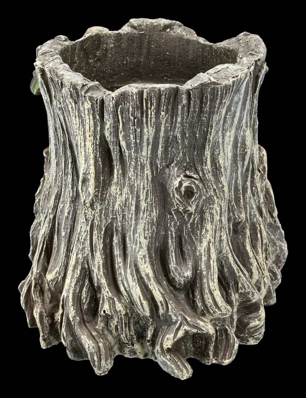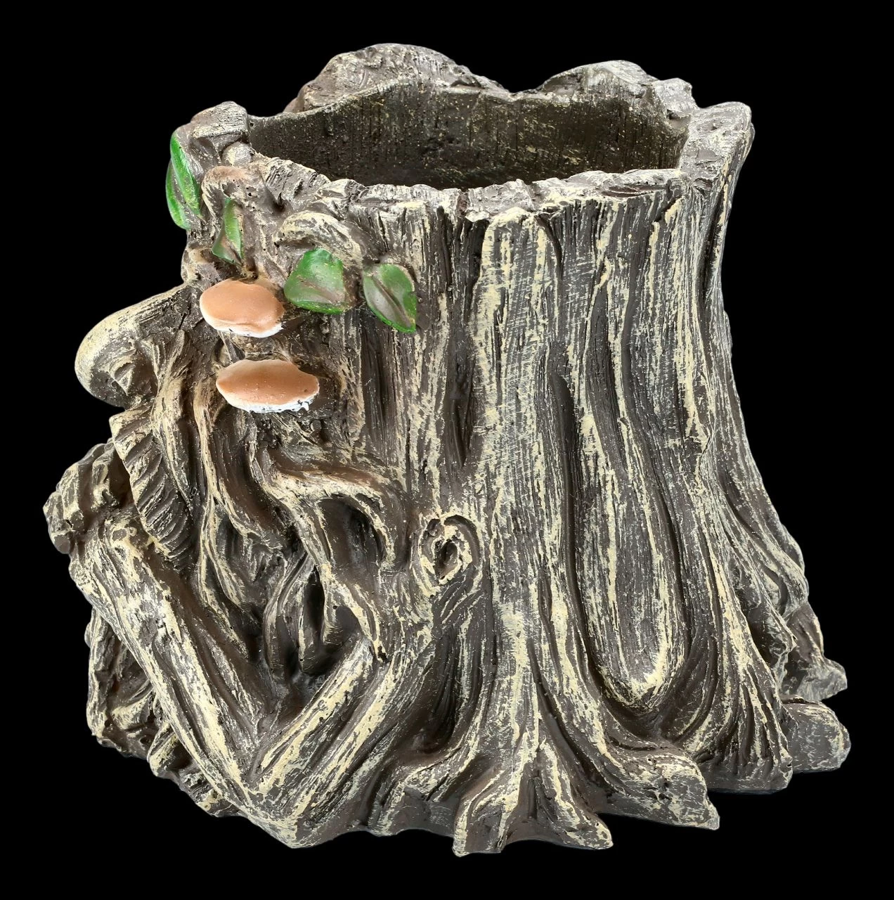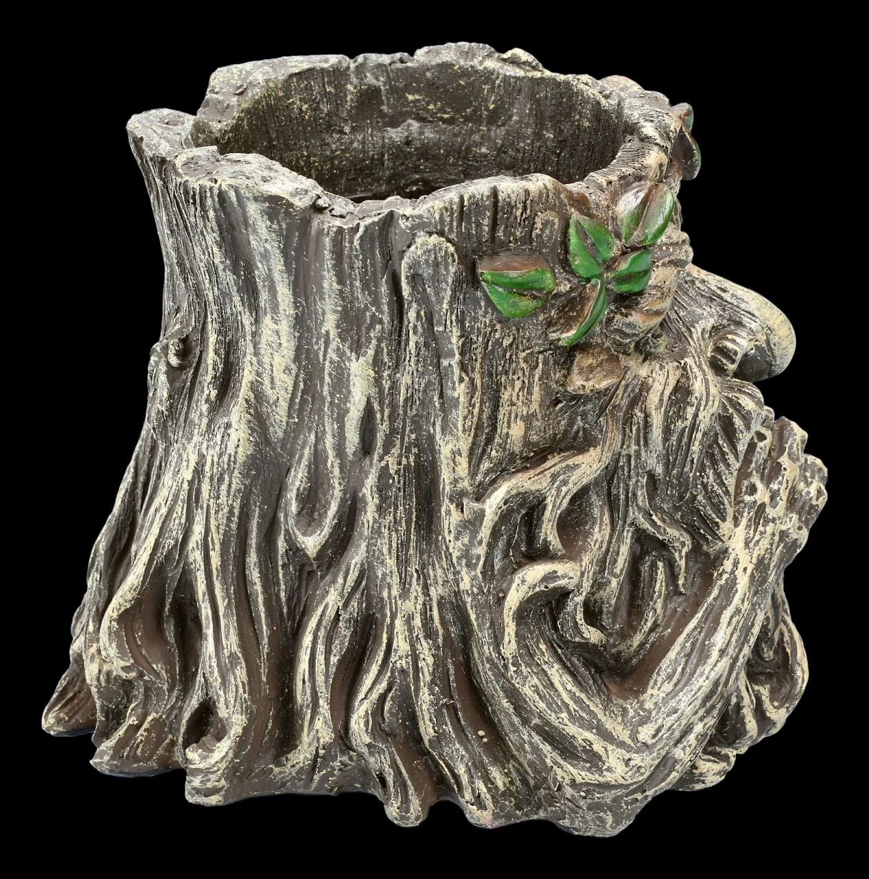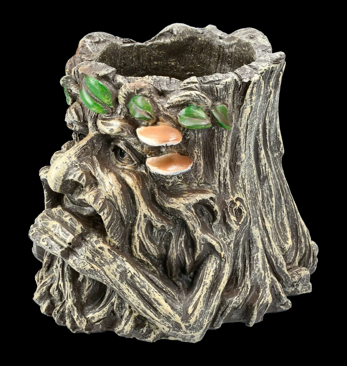 Nachdenklich und seinen Bart haltend blickt der Greenman auf diesem Pflanztopf den Betrachter an. Als König der Wälder beschützt der Greenman die Schwachen und wacht über die Natur. Damit bringen Sie die Natur in Ihre Wohnung. Wie aus einer Wurzel geschnitzt und mit grünen Blättern geschmückt gibt dieser Pflanztopf aus handbemaltem Kunststein (Polyresin) Ihren Pflanzen Halt und ist auch ein dekoratives und schützendes Element für Ihre Fensterbank. Der Pflanztopf ist 14,7 cm hoch, 17,0 cm breit und 17,0 cm tief und hat ein Ablaufloch. Unsere Dekoration ist nicht in der Lieferung enthalten.