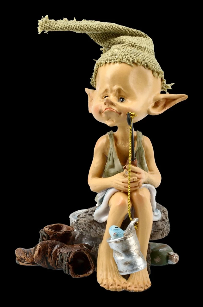Der kleine Pixie Kobold hat sich das Angeln eigentlich anders vorgestellt. Statt Fischen fängt er Schuhe und Dosen. Die süße handbemalte Figur aus Kunststein (Polyresin) ist für jeden Pixie Sammler ein Must Have.