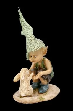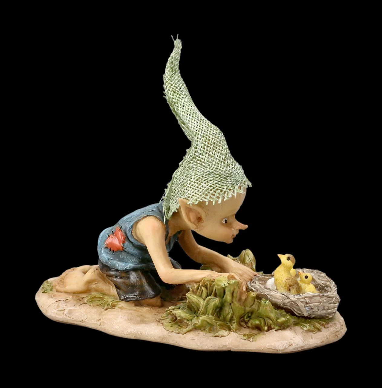 Bekommen wir jetzt endlich Futter? Erwartungsvoll blicken die drei Küken im Nest den kleinen frechen Kobold an, der sich über ihr Nest beugt. Die süße Pixie Kobold Figur mit den Küken ist aus Kunststein (Polyresin) gefertigt und 8 cm hoch, 15 cm breit und 7 cm tief und bis ins kleinste Detail liebevoll handbemalt. Nicht nur für Sammler von Pixie-Figuren ist der kleine Kobold mit den Küken im Nest ein süßes Geschenk. Sammler aufgepasst: In unserem Shop gibt es übrigens noch weitere lustige Pixie-Kobolde.