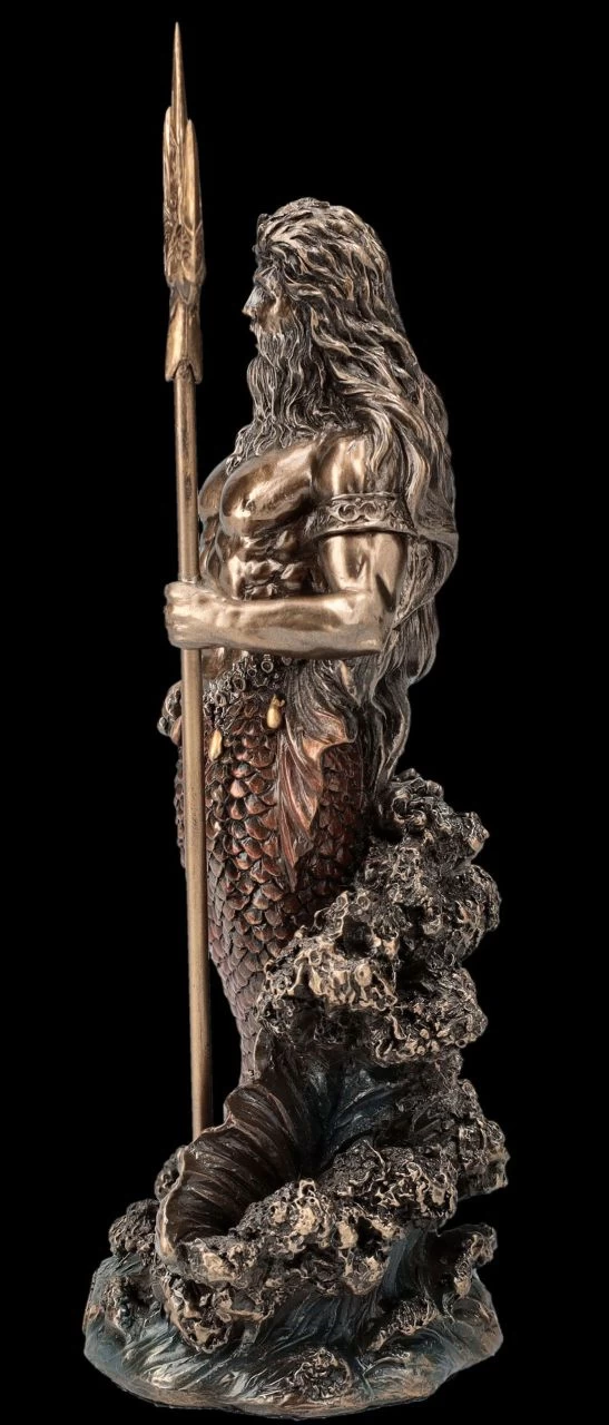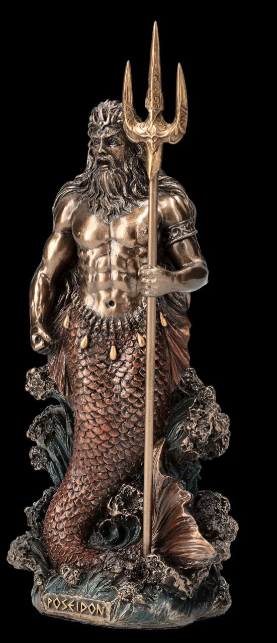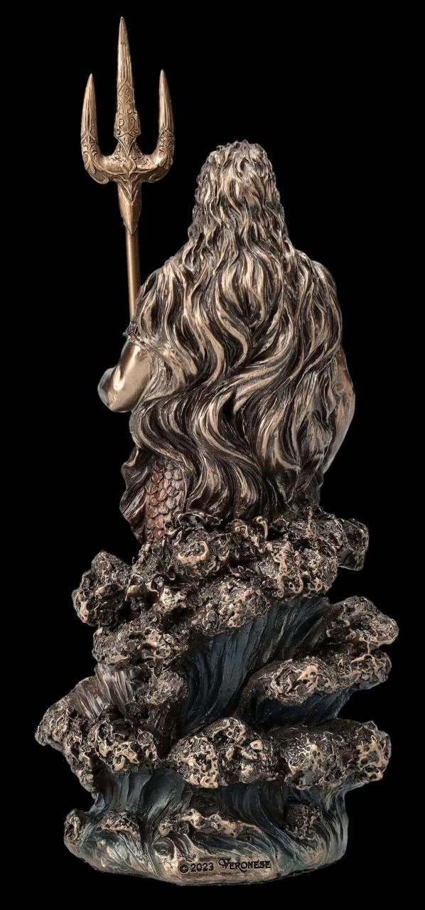 In der altgriechischen Mythologie war Poseidon der zweite Sohn Kronos und Bruder des Zeus und gehörte zu den zwölf Göttern auf dem griechischen Olymp. Als Herrscher des Meeres, der Quellen und der Seen hatte Poseidon von Hephaistos, dem für die Schmiedekunst zuständigen Gott, den Dreizack als Zepter erhalten. Diese wunderbare Skulptur des Poseidon als Herrscher des Meeres mit seinem Dreizack zeigt ihn halb Fisch und halb athletischen Mann mit Bart und langen Haaren. Die sorgsam bronzierte und zurückhaltend colorierte Figur aus der Studio Collection von Veronese ist 18,5 cm hoch, 8 cm breit und 6 cm tief. Sie wurde sehr detailreich aus hochwertigem Kunststein (Polyresin) gefertigt und wirkt ausgesprochen edel. Die Figur des griechischen Gottes Poseidon ist nicht nur ein dekorativer Blickfang, sondern auch ein perfektes Geschenk für alle, die sich für die altgriechische Götterwelt interessieren.