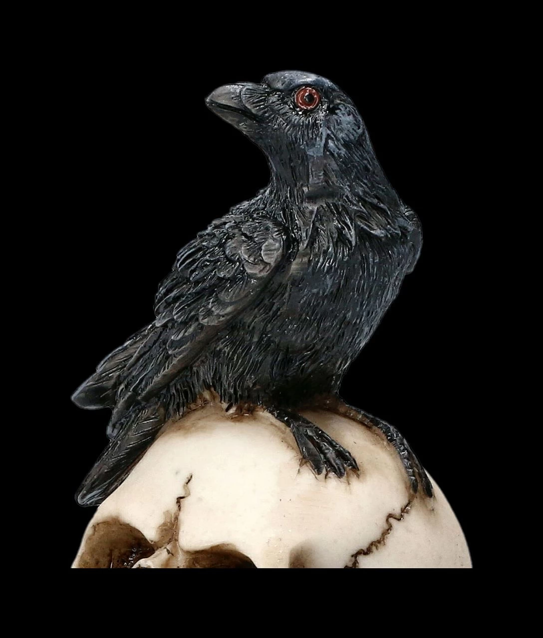 Der Rabe des Magiers sitzt hoch auf einem Schädel, den der Magier auf seinen beiden wichtigsten Büchern mit Zaubersprüchen abgelegt hatte. Er scheint nur darauf zu warten, dass er seinem Herrn die Prophezeiung für den Tag vorkrächzen kann Detailreich aus handbemaltem Kunststein (Polyresin) geschaffen, ist Raven’s Spell mit der Höhe von 10,5 cm, der Breite von 5 cm und der Tiefe von 6,5 cm eine tolle Deko für jeden Schreibtisch oder aber auch im Bücherregal.