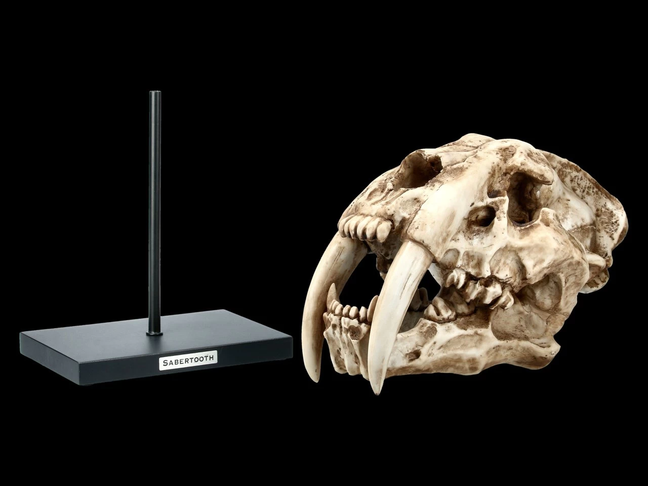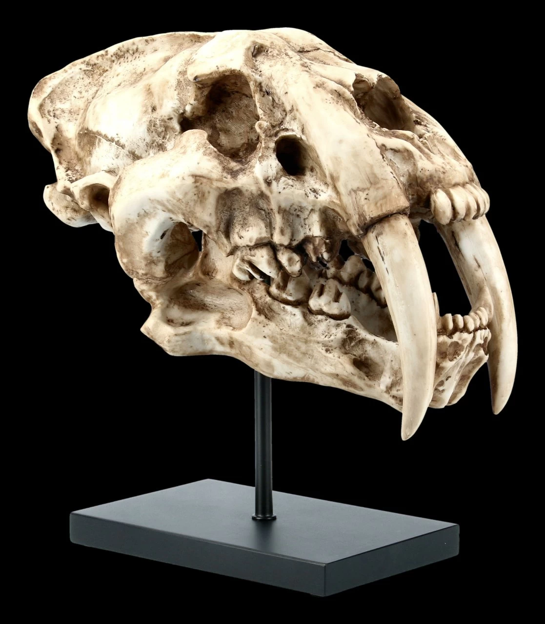 Der legendäre Säbelzahntiger war in der Eiszeit ein gefürchteter Jäger. Er lebte einst im Westen Nordamerikas, ist aber schon lange ausgestorben. Der beeindruckende Schädel eines Säbelzahntigers wirkt wie ein echtes Fossil und ist bis zu den unglaublichen Reißzähnen sehr detailreich aus handbemaltem Kunststein (Polyresin) gefertigt. Der detailgetreue Schädel ist auf einen Metall Ständer aufgesteckt und am Fuß des Ständers ist der Schriftzug ‚Sabertooth‘ zu sehen. Der sehr naturgetreue Schädel auf dem Metallständer ist 30 cm hoch, 30 cm breit und 18 cm tief.