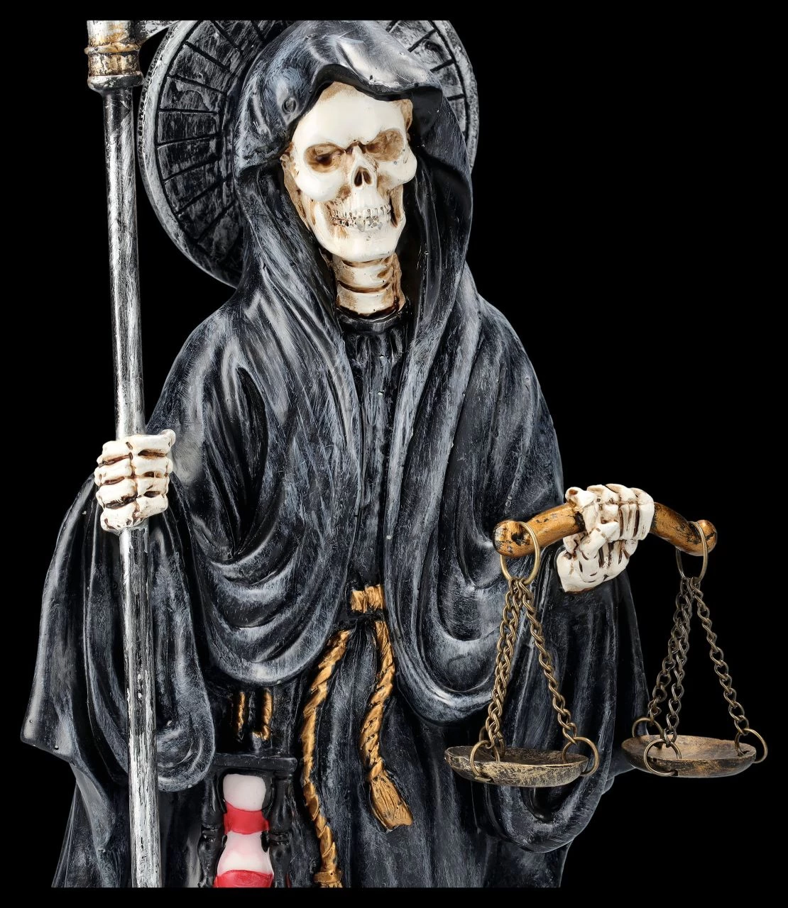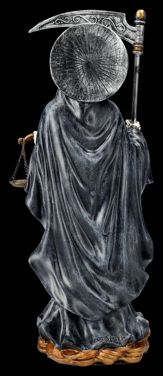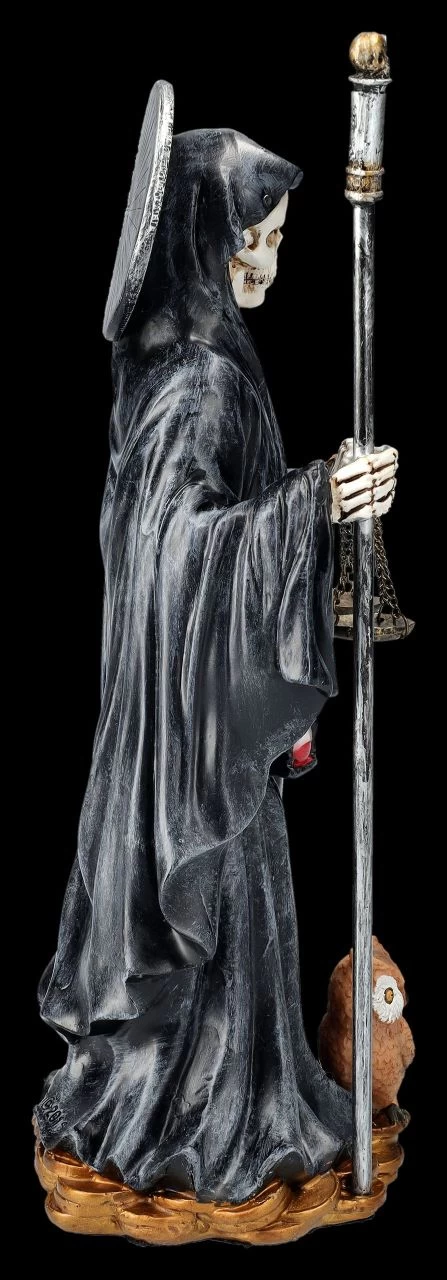 In der rechten Hand die Sense und in der linken Hand eine Waage als Symbol der Gerechtigkeit tritt er im schwarzen Umhang als Heiliger Tod aus der Dunkelheit. Ganz egal, ob reich oder arm – er ist es schließlich, der alle in sein Reich holen wird. Dass er kluge Entscheidungen über den Zeitpunkt stellt, beweist die zu seinem Füßen sitzende Eule als Symbol der Weisheit. Die 26,5 cm hohe, 11,5 cm breite und 9,5 cm tiefe Santa Muerte Figur mit der Waage ist aus handbemaltem Kunststein (Polyresin). Sie ist eine mystische Deko vor allem auch, wenn zu den Dia de los Muertos zwischen dem 31. Oktober und 2. November an die lieben Verstorbenen gedacht wird.