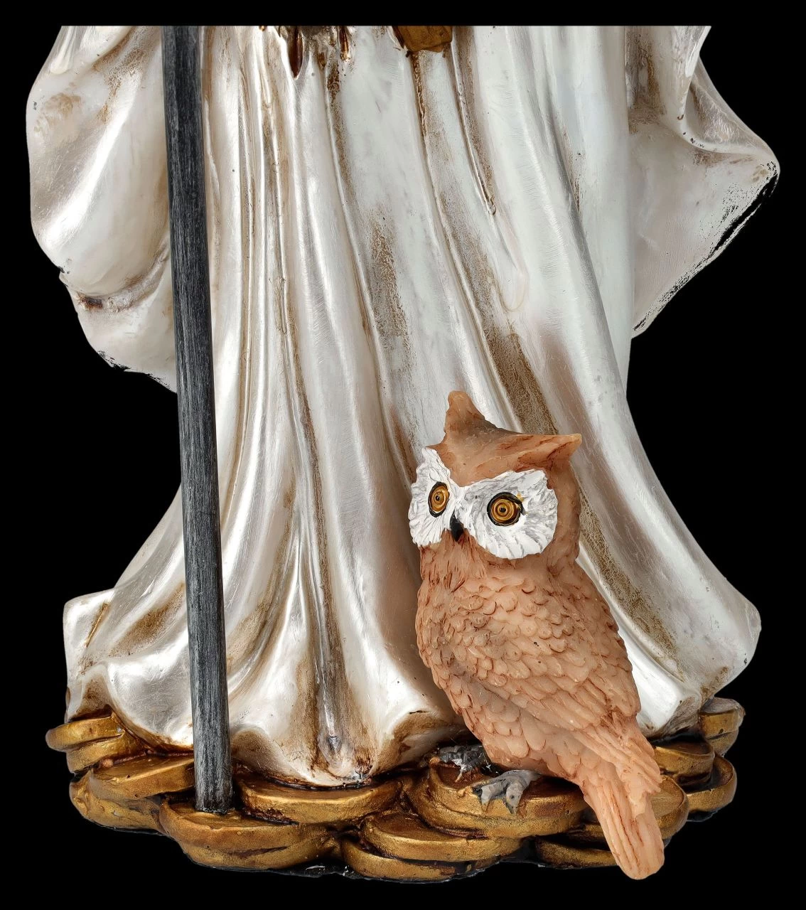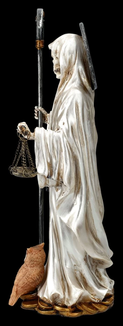 In manchen Kulturen kommt der Tod nicht in schwarzer, sondern in weißer Kleidung, wie bei dieser fantasievollen Santa Muerte Figur. In der rechten Hand hält der Heilige Tod die Sense und in der linken Hand eine Waage als Symbol der Gerechtigkeit. Es ist letztendlich ganz egal, ob reich oder arm – er ist es schließlich, der alle in sein Reich holen wird. Dass er kluge Entscheidungen über den Zeitpunkt stellt, beweist die zu seinem Füßen sitzende Eule als Symbol der Weisheit. Die 26,5 cm hohe, 11,5 cm breite und 9,5 cm tiefe weiße Santa Muerte Figur mit der Waage ist aus handbemaltem Kunststein (Polyresin). Sie ist eine mystische Deko vor allem auch, wenn zu den Dia de los Muertos zwischen dem 31. Oktober und 2. November an die lieben Verstorbenen gedacht wird.