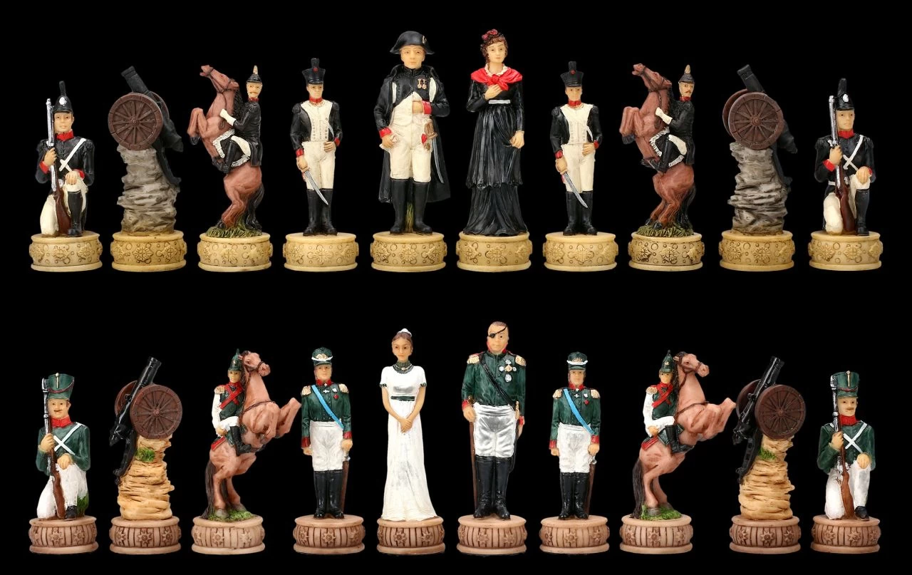 Im Juni 1812 führte Napoleon seine Grande Armée in den Russlandfeldzug, den er nach blutigen Schlachten und extremen Verlusten bereits im Dezember verloren hatte. Wie aber der Kampf in diesem grandiosen Schachspiel ausgehen wird, hängt vom Können der Spieler ab. Detailreich aus Kunststein (Polyresin) gefertigt und sorgfältig handbemalt zeigen diese Schachfiguren auf der einen Seite Napoleon, seine Dame und die Franzosen und auf der anderen Seite den russischen Zar Alexander I mit Dame und Soldaten. Das fantastische Schachfiguren Set beinhaltet 32 Figuren, wobei zum Beispiel der König 8 cm hoch ist und die Bauernfigur 6,5 cm. Die Figuren dieses Sets haben eine Stellfläche von 2,7 cm. Weitere fantastische und als prachtvolles Präsent geeignete Schachfiguren finden Sie in unserem Shop